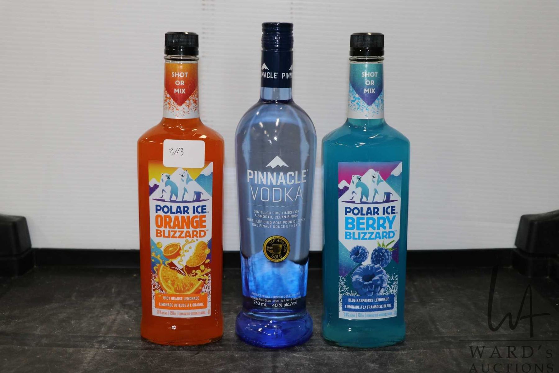 Three assorted bottles of vodka including one Polar Ice Orange Blizzard Lemonade 750ml / 30% ABV, one Polar Ice Berry Blizzard blue raspberry lemonade 750ml / 30% ABV, and one Pinnacle Vodka 750ml / 40% ABV Note: Alcohol cannot be insured by any courier in Canada. Local pick up is recommended. Canadian bidders only