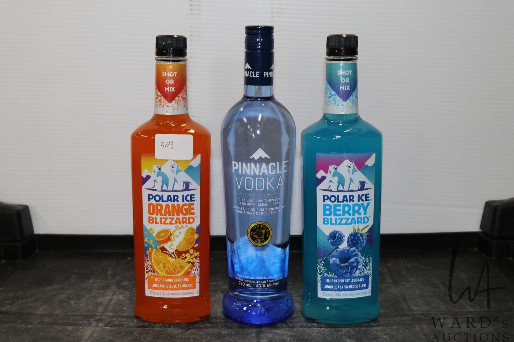 Three assorted bottles of vodka including one Polar Ice Orange Blizzard Lemonade 750ml / 30% ABV, one Polar Ice Berry Blizzard blue raspberry lemonade 750ml / 30% ABV, and one Pinnacle Vodka 750ml / 40% ABV Note: Alcohol cannot be insured by any courier in Canada. Local pick up is recommended. Canadian bidders only