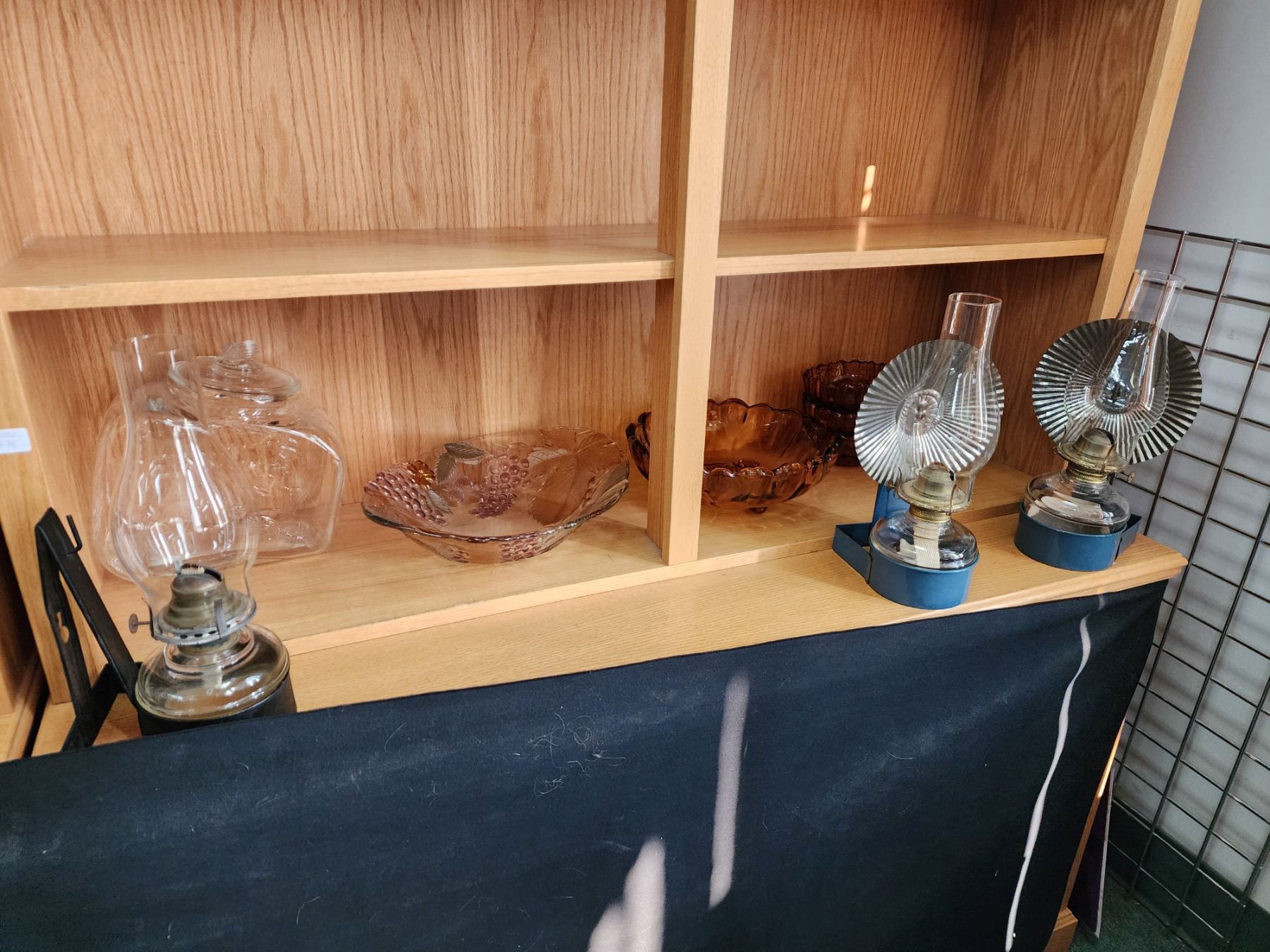 Three barn lanterns with wall mounts, selection of amberina glass, Peanuts jar etc.