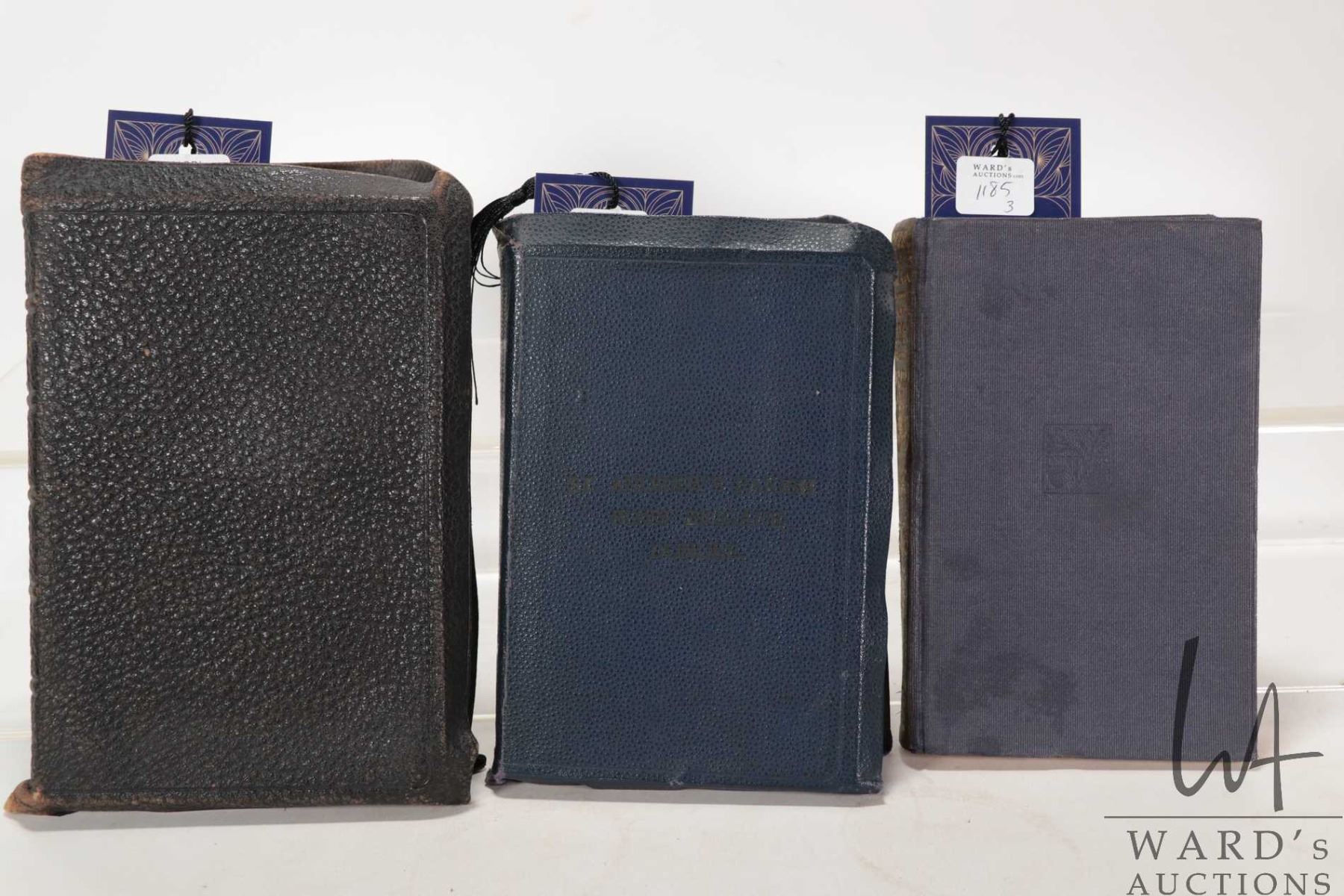 Three books including a leather bound copy of the King James bible printed by the Scottish Bible Society, Edinburgh. Leather bound "The Holy Bible....the English version of Bagster's Polyglot Bible" printed by Samuel Bagster and Sons Limited London and "The Koran translated from the Arabic by J.M. Rodwell. Published by J.M. Dent & Co. London. Hardboard covers with embossed gold lettering on spine