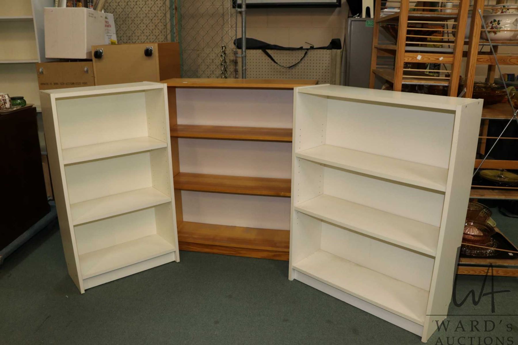 Three bookshelves including two white and one wood finish, each approximately 42" H and ranging in w