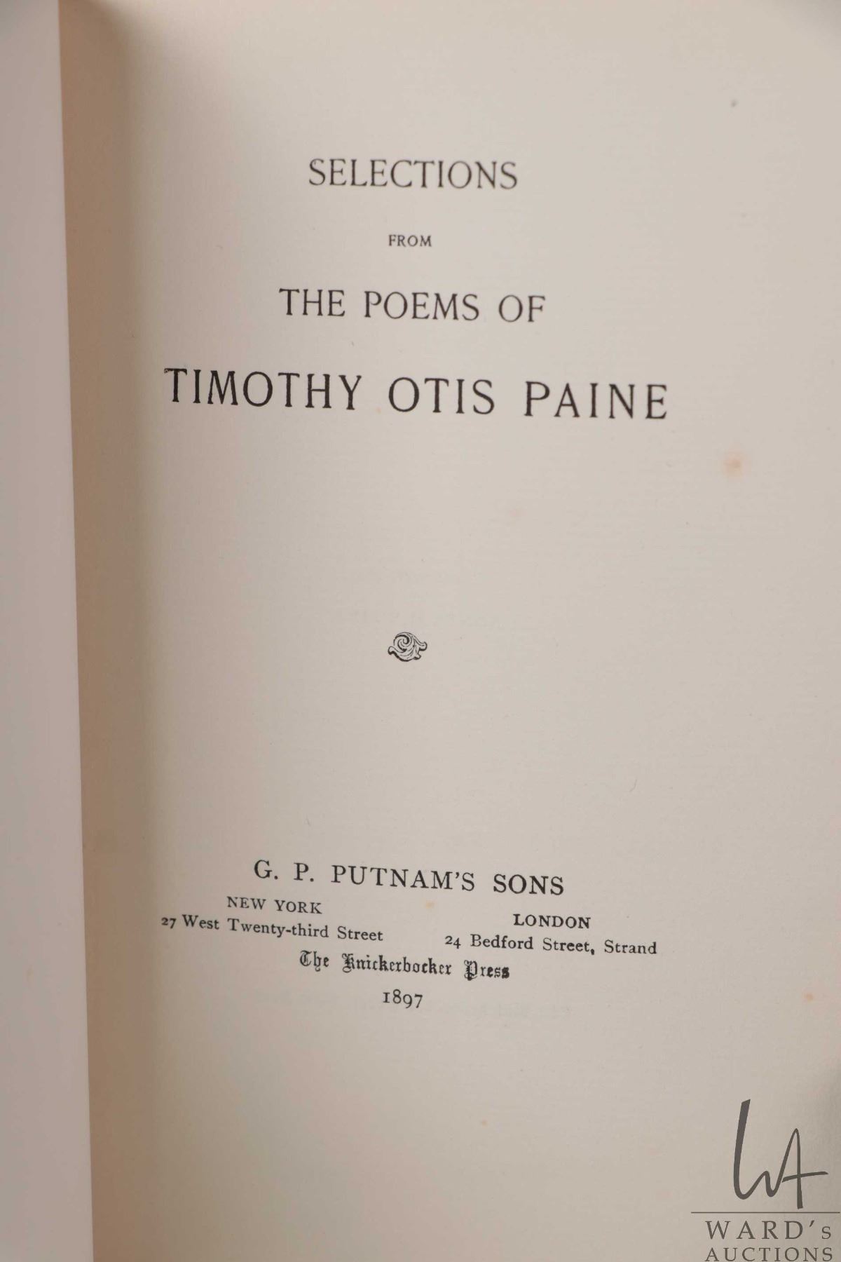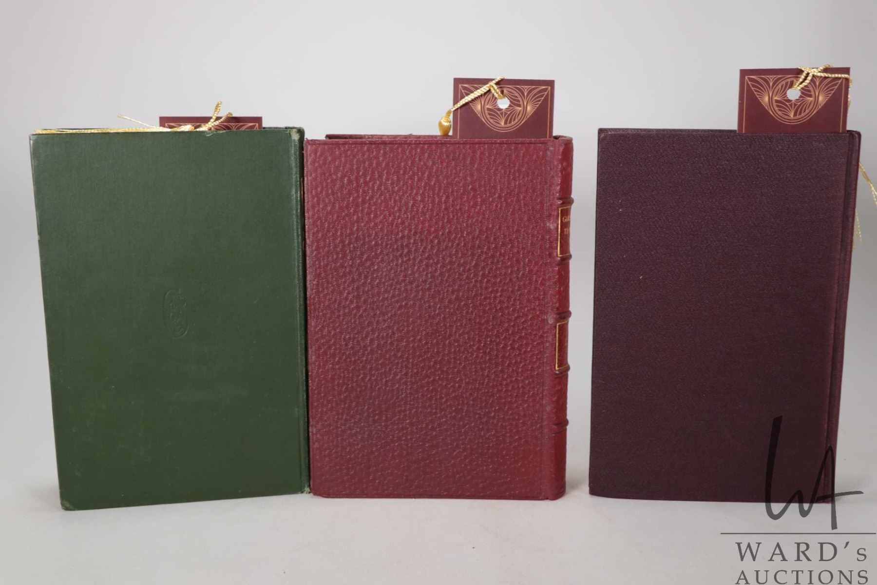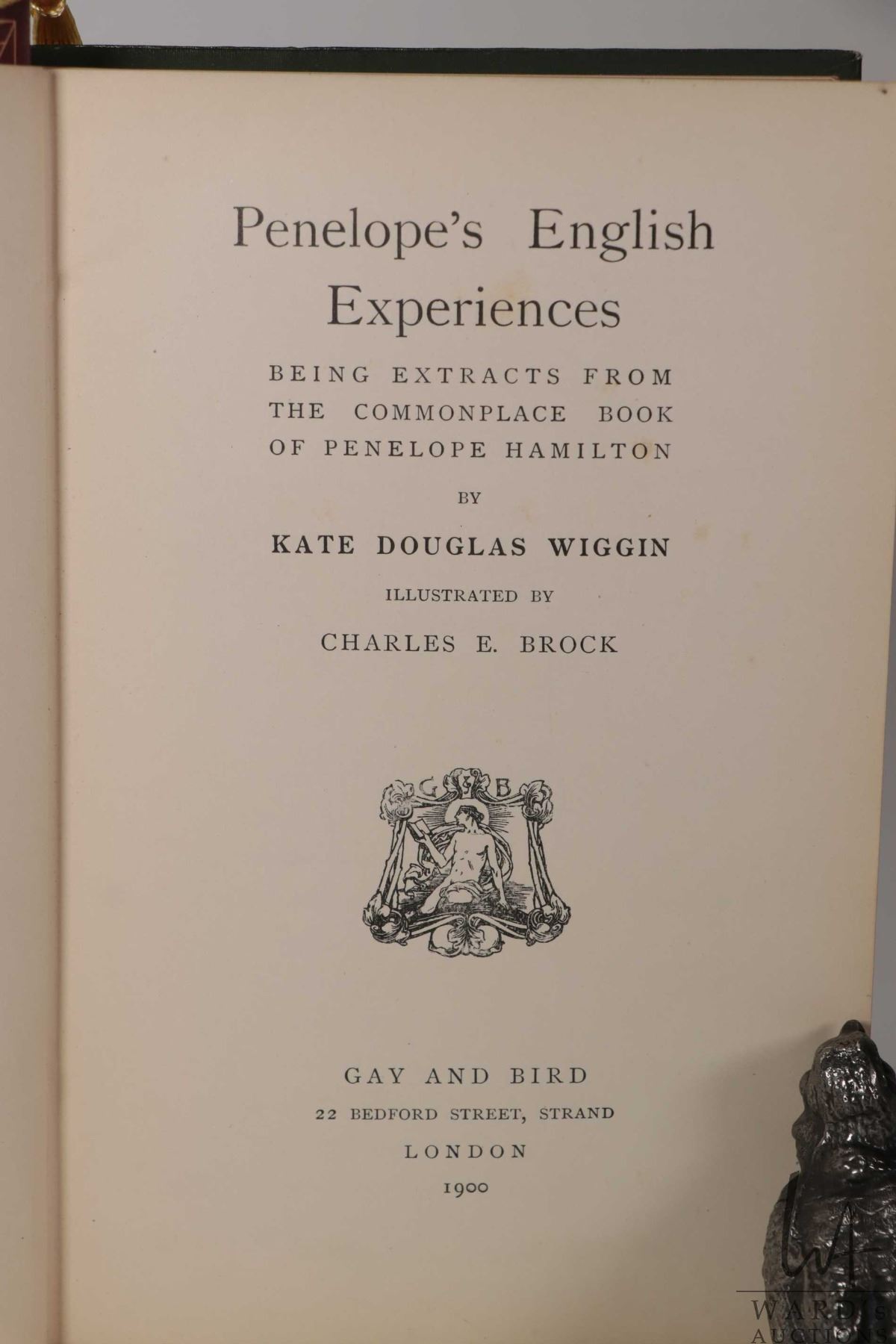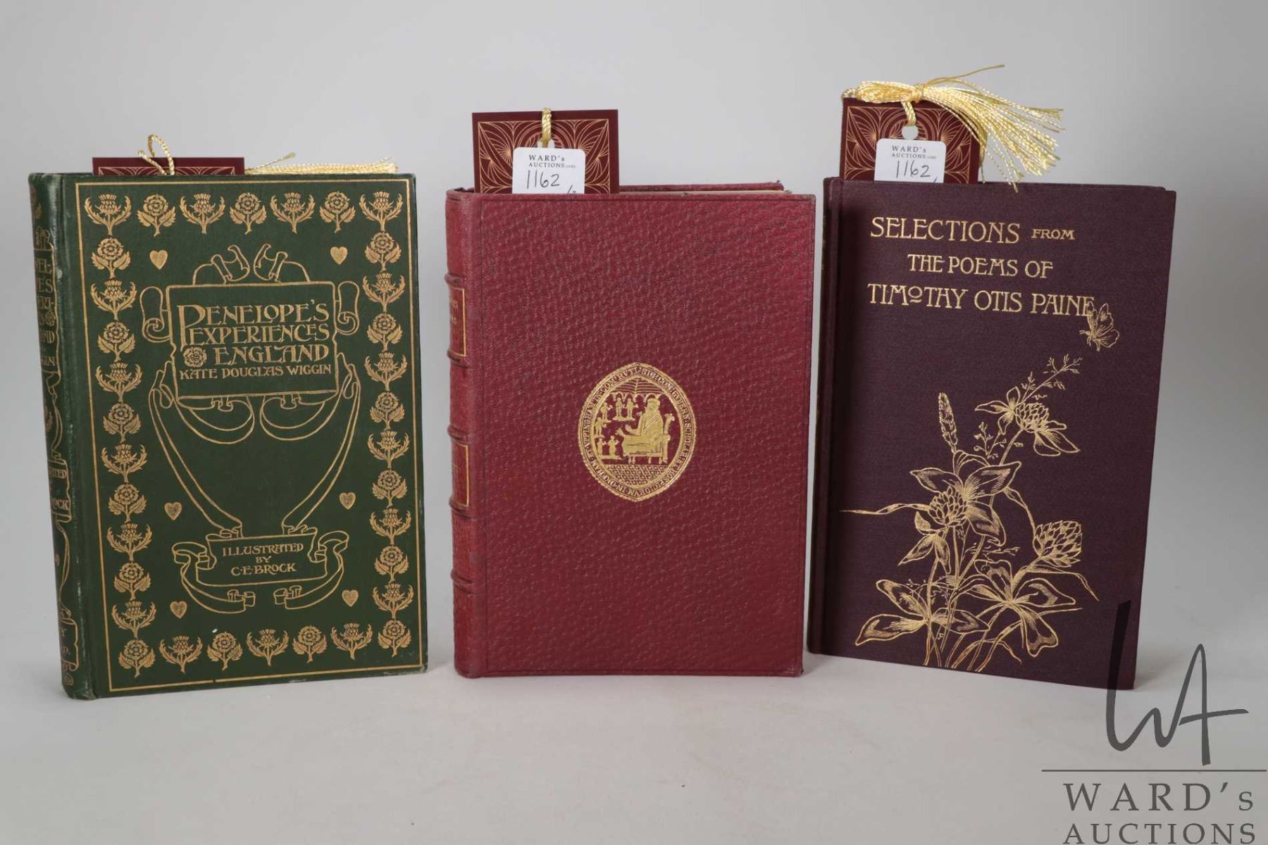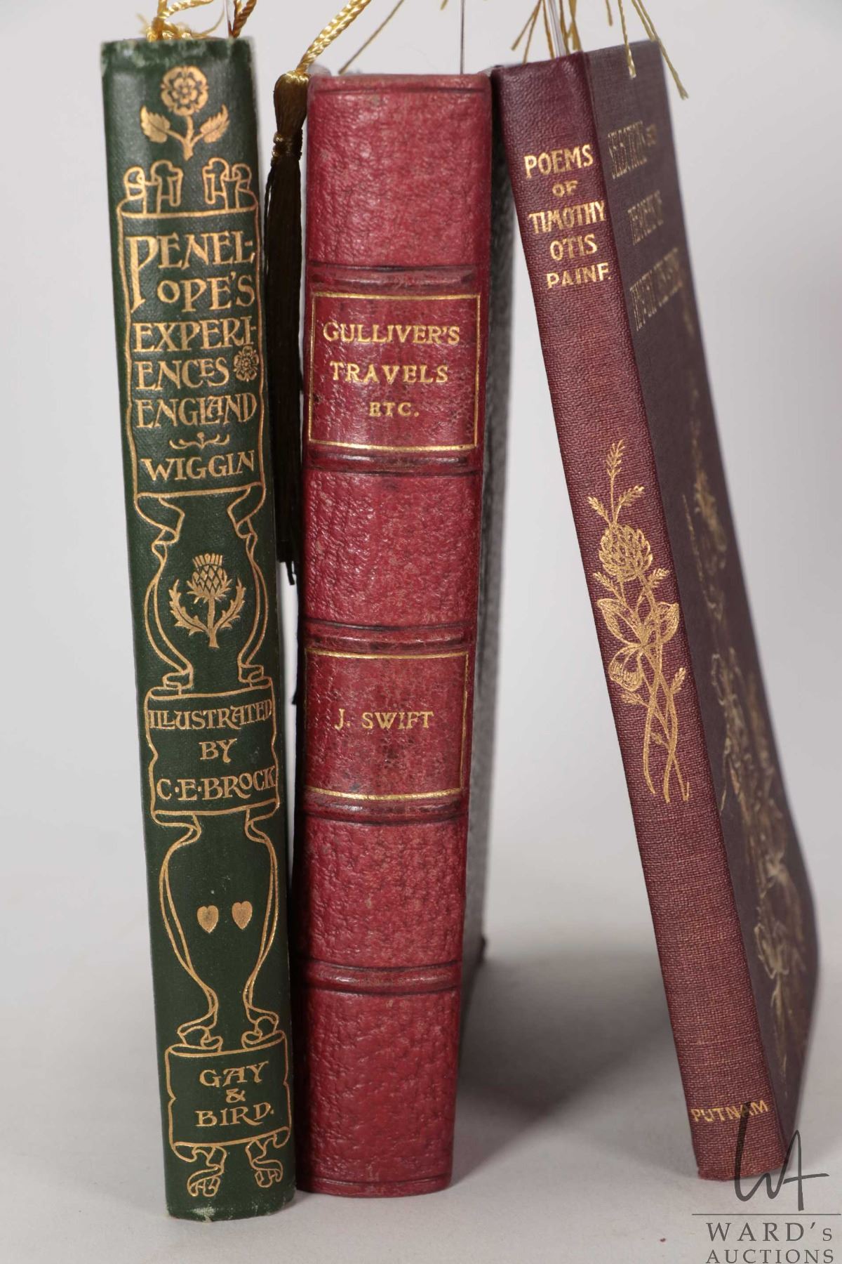 Three boooks including "Gulliver's Travels The Tale of a Tub Battle of the Books Etc." by Jonathan Swift. Published by Oxford University Press, London. 1929. Hardcover leather volume with gold embossed letter and decoration, raised spine and marble end papers. "Selections From The Poems Of Timothy Otis Paine" Published The Knickerbocker Press, New York 1897. Hardboard covers with embossed gold lettering and decoration and "Penelope's English Experiences" By Kate Douglas Wiggin. Illustrated by Charles E. Brock. Published Gay and Bird, London, 1900. Hardboard covers with embossed gold letter and decoration