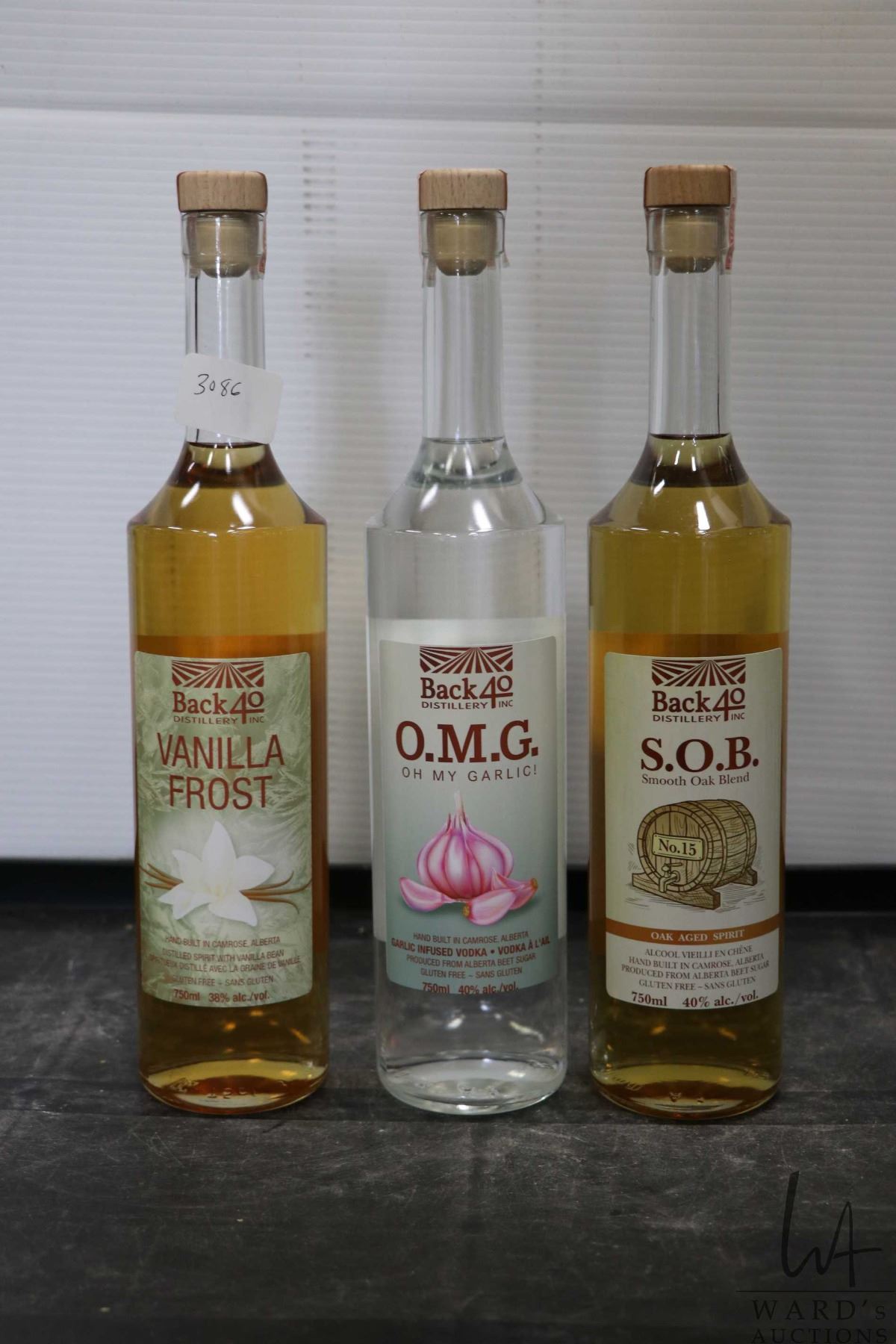 Three bottles of Back 40 Distillery Inc. alcohol including one Vanilla Frost 750ml / 38% ABV, one O.M.G. Garlic infused vodka 750ml / 40% ABV and one S.O.B. Oak Aged Spirit 750ml / 40% ABV Note: Alcohol cannot be insured by any courier in Canada. Local pick up is recommended. Canadian bidders only