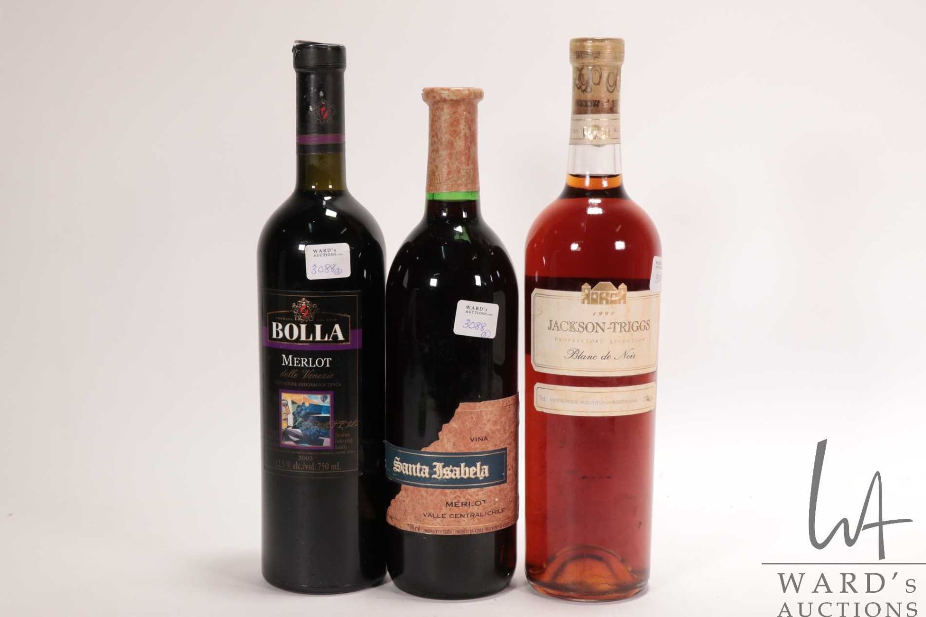 Three bottles of wine including Bolla/ Merlot/ 750ml/ 12.5% ABV, Jackson-Triggs/ 1998 Proprietors' Selection/ Blanc de Noir/ 750ml/ 11.5% ABV, Santa Isabela/ Merlot/ 750ml/ 12.5% ABV Note: Alcohol cannot be insured by any courier in Canada. Local pick up is recommended. Canadian bidders only
