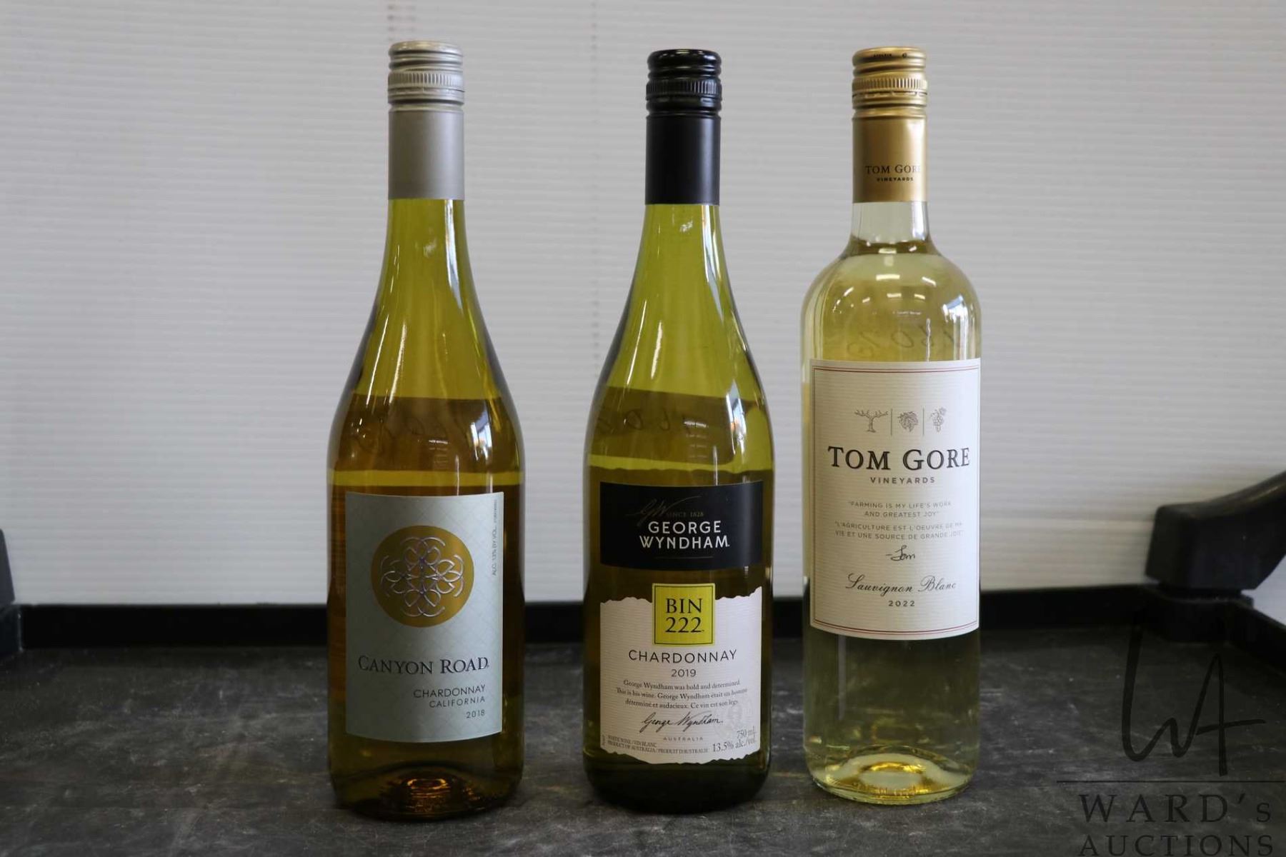 Three bottles of wine including Canyon Road Chardonnay 2018 750ml / 13% ABV, George Wyndham Chardonnay 2019 750ml / 13.5% ABV, and a Tom Gore Vineyards Sauvignon Blanc 2022 750ml Note: Alcohol cannot be insured by any courier in Canada. Local pick up is recommended. Canadian bidders only