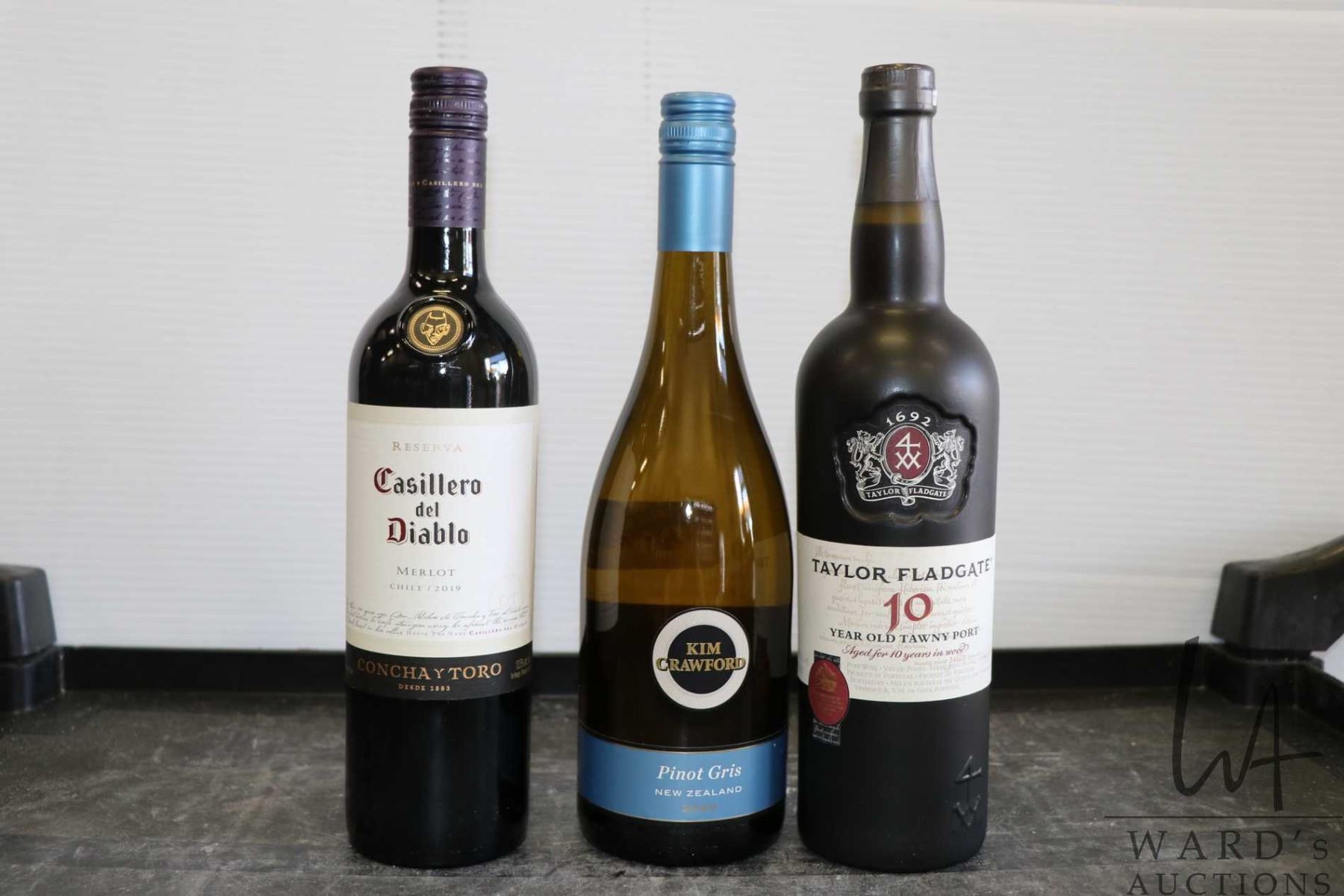 Three bottles of wine including Casillero del Diablo Merlot 2019 750ml / 13.5% ABV, Kim Crawford Pinot Gris 2020 750ml, and a Taylor Fladgate 10 Year Old Tawny Port 750ml Note: Alcohol cannot be insured by any courier in Canada. Local pick up is recommended. Canadian bidders only