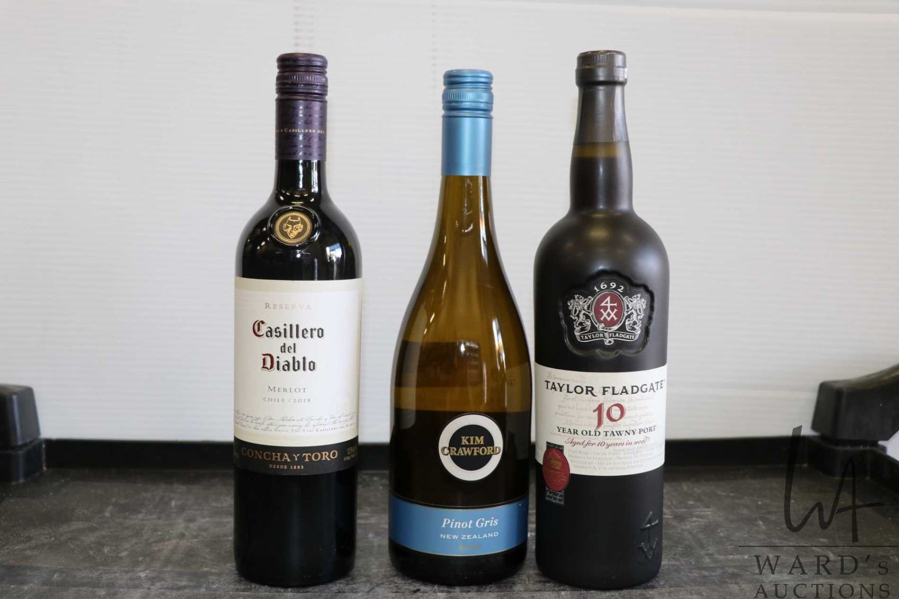 Three bottles of wine including Casillero del Diablo Merlot 2019 750ml / 13.5% ABV, Kim Crawford Pinot Gris 2020 750ml, and a Taylor Fladgate 10 Year Old Tawny Port 750ml Note: Alcohol cannot be insured by any courier in Canada. Local pick up is recommended. Canadian bidders only
