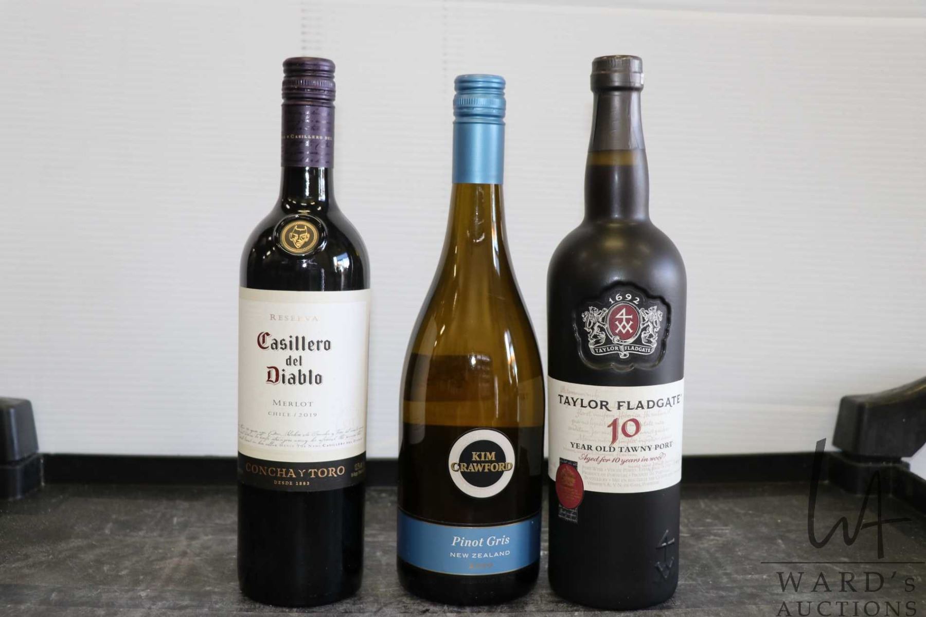 Three bottles of wine including Casillero del Diablo Merlot 2019 750ml / 13.5% ABV, Kim Crawford Pinot Gris 2020 750ml, and a Taylor Fladgate 10 Year Old Tawny Port 750ml Note: Alcohol cannot be insured by any courier in Canada. Local pick up is recommended. Canadian bidders only