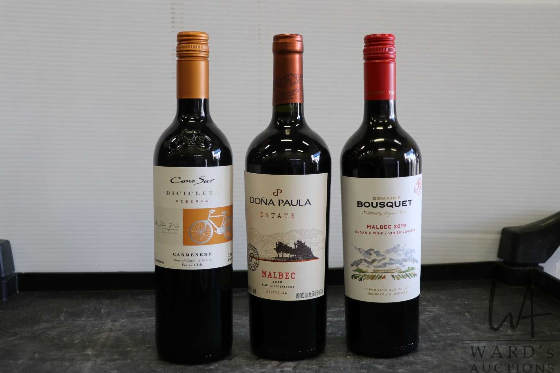 Three bottles of wine including Cono Sur Bicicleta Reserva Carmenere 2019 750ml / 13.5% ABV, Dona Paula Estate Malbec 2018 750ml / 14% ABV, and a Domaine Bousquet Malbec 2019 750ml / 14% ABV Note: Alcohol cannot be insured by any courier in Canada. Local pick up is recommended. Canadian bidders only