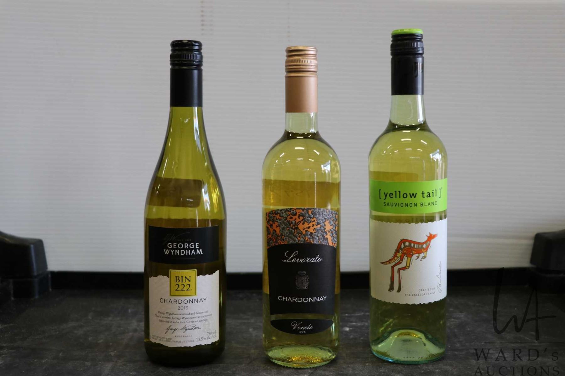 Three bottles of wine including George Wyndham Chardonnay 2019 750ml / 13.5% ABV, Levorato Chardonnay 750ml, and a Yellow Tail Sauvignon Blanc 750ml Note: Alcohol cannot be insured by any courier in Canada. Local pick up is recommended. Canadian bidders only