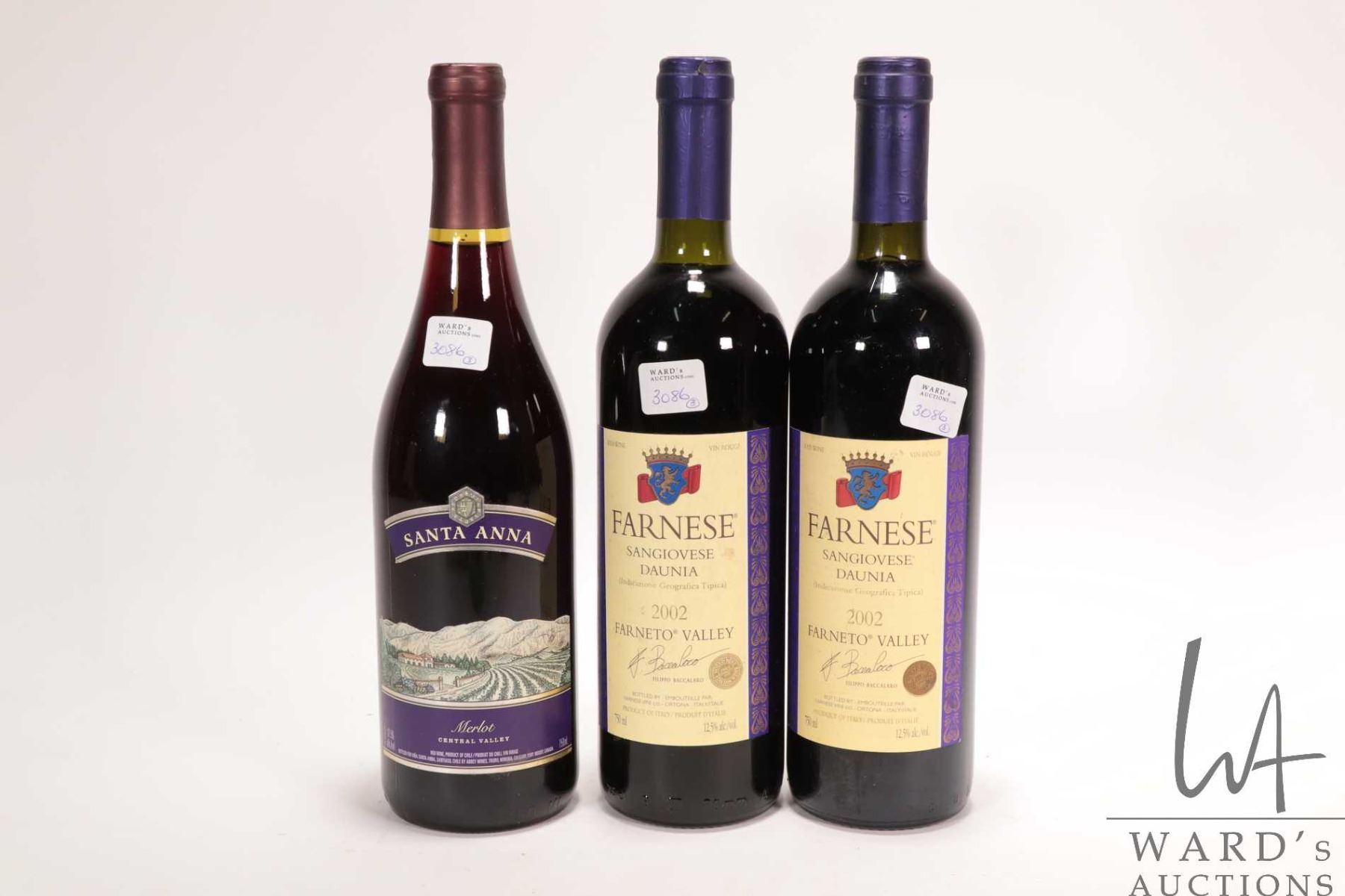 Three bottles of wine including Santa Anna/ Merlot/ 750ml/ 12.5% ABV and two bottles of Farnese/ 2002 Farnet Valley/ Italian Red Wine/ each 750ml/ each 12.5% ABV Note: Alcohol cannot be insured by any courier in Canada. Local pick up is recommended. Canadian bidders only