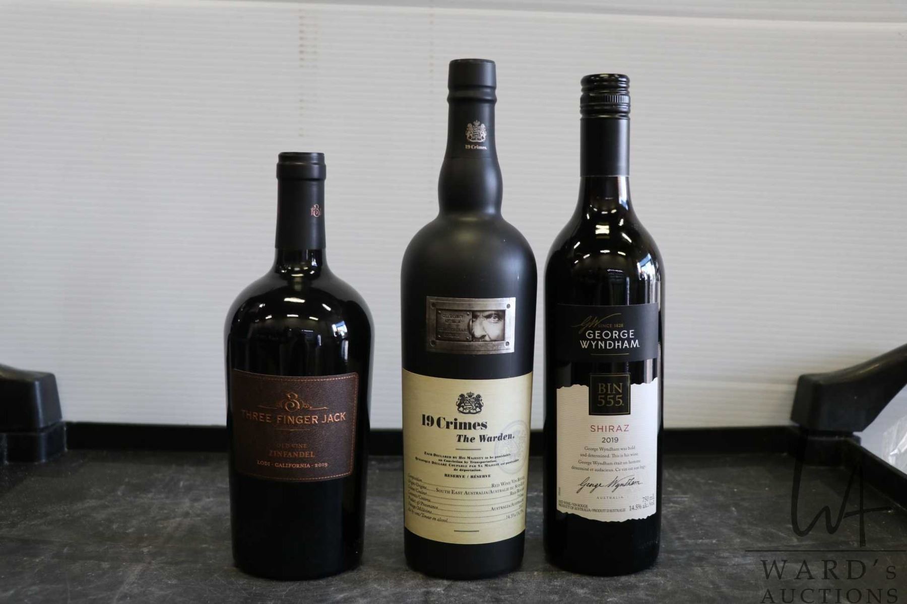 Three bottles of wine including Three Finger Jack Zinfandel 2019 750ml, 19 Crimes The Warden 2017 750ml / 14.5% ABV, and a George Wyndham Bin 555 Shiraz 2019 750ml / 14.5% ABV Note: Alcohol cannot be insured by any courier in Canada. Local pick up is recommended. Canadian bidders only