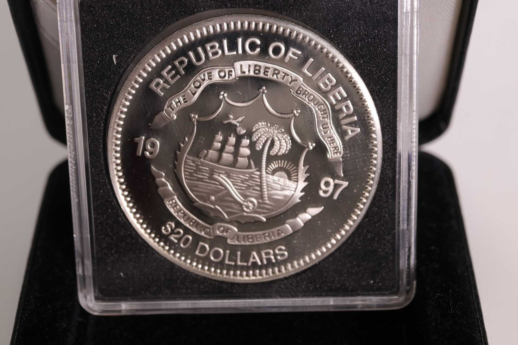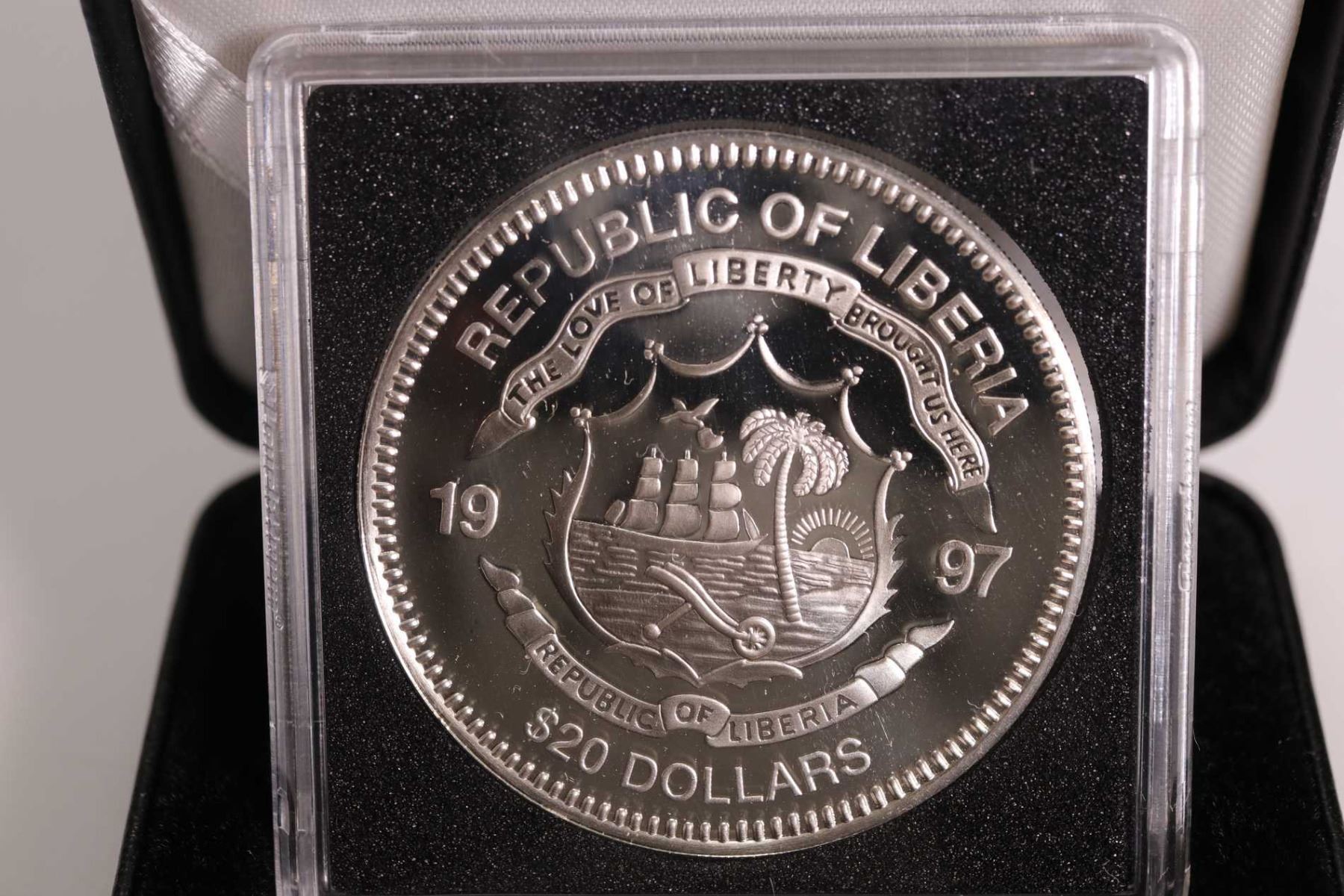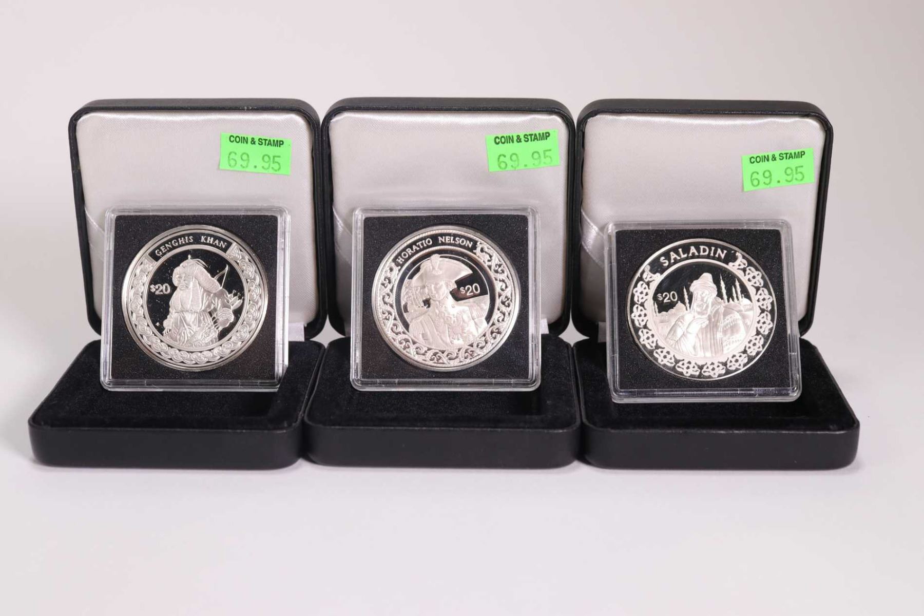 Three boxed Republic of LIberia collector coins including 1997 issue , $20 "Genghis Khan", " Saladin" and " Horation Nelson" each 1 oz. coin is .925 sterling silver and retailed for $69.95