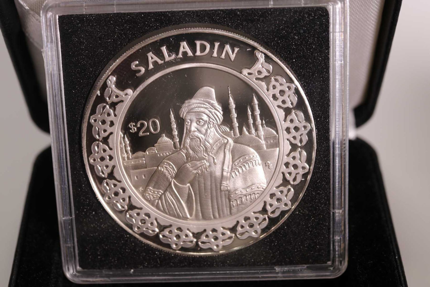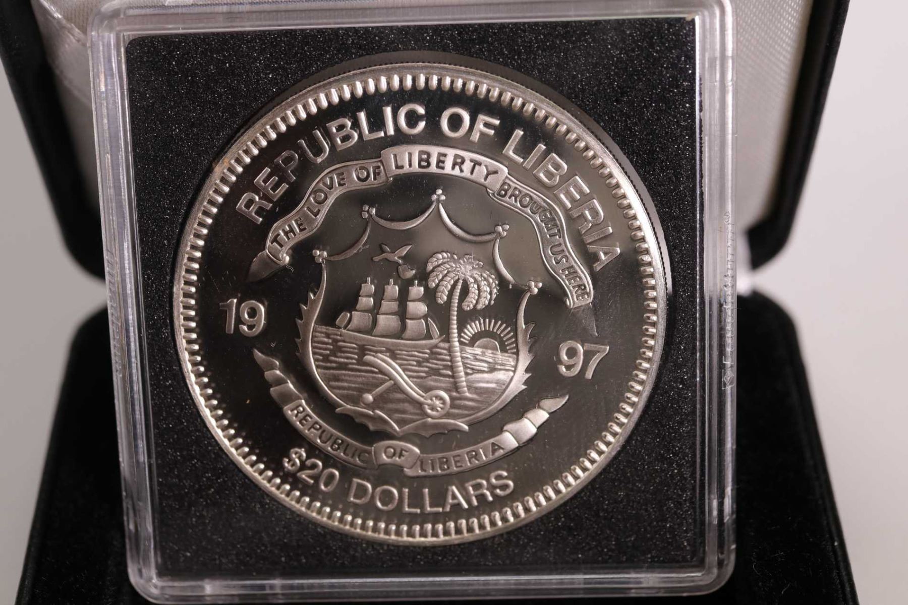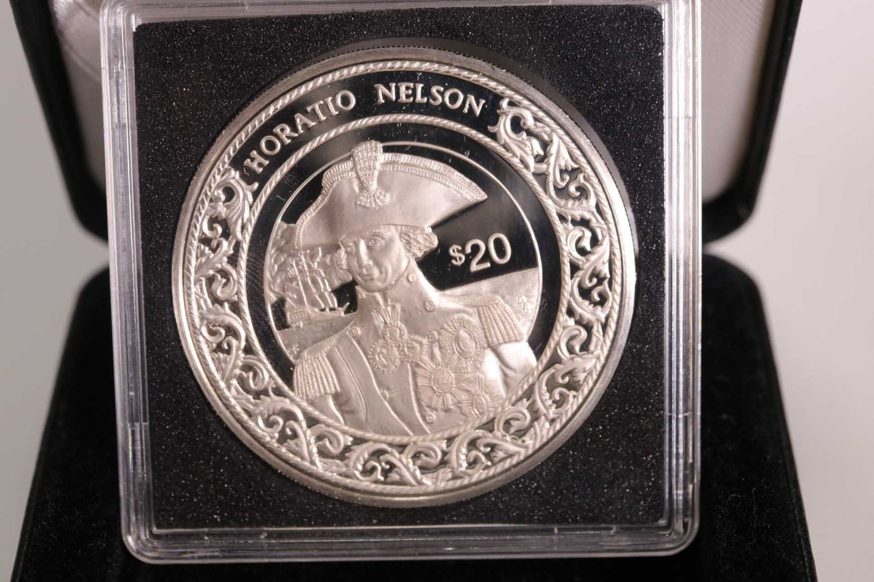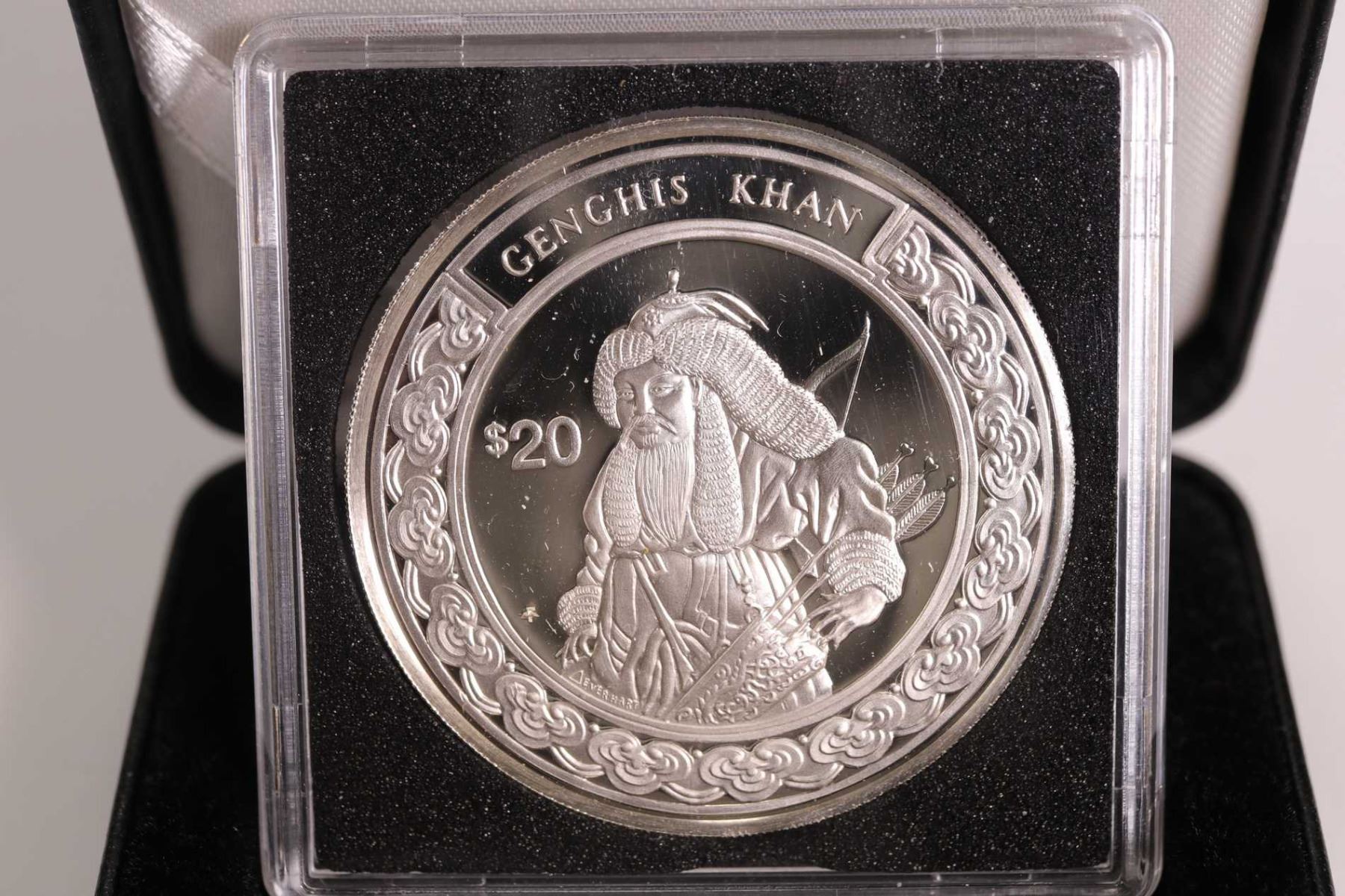 Three boxed Republic of LIberia collector coins including 1997 issue , $20 "Genghis Khan", " Saladin" and " Horation Nelson" each 1 oz. coin is .925 sterling silver and retailed for $69.95