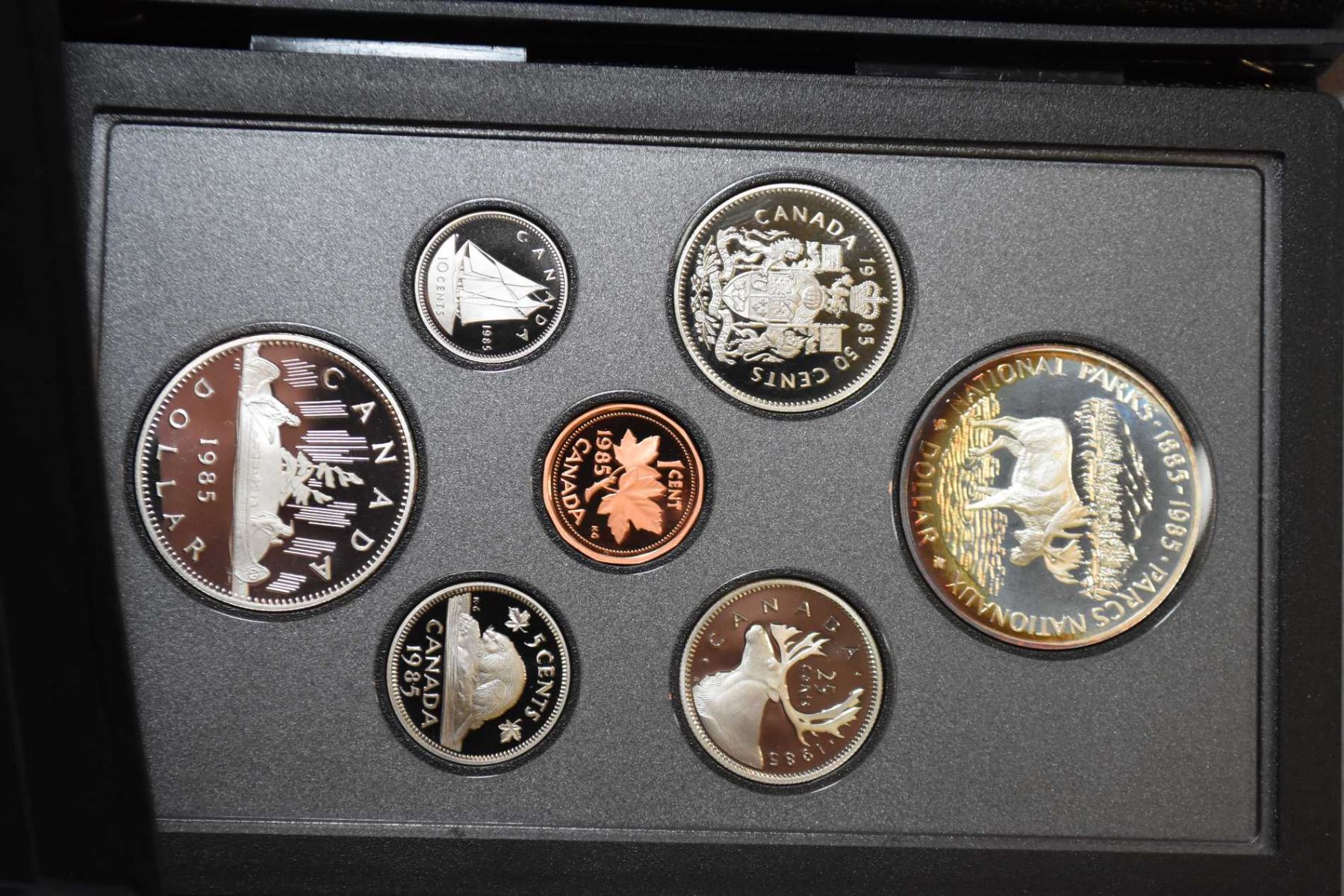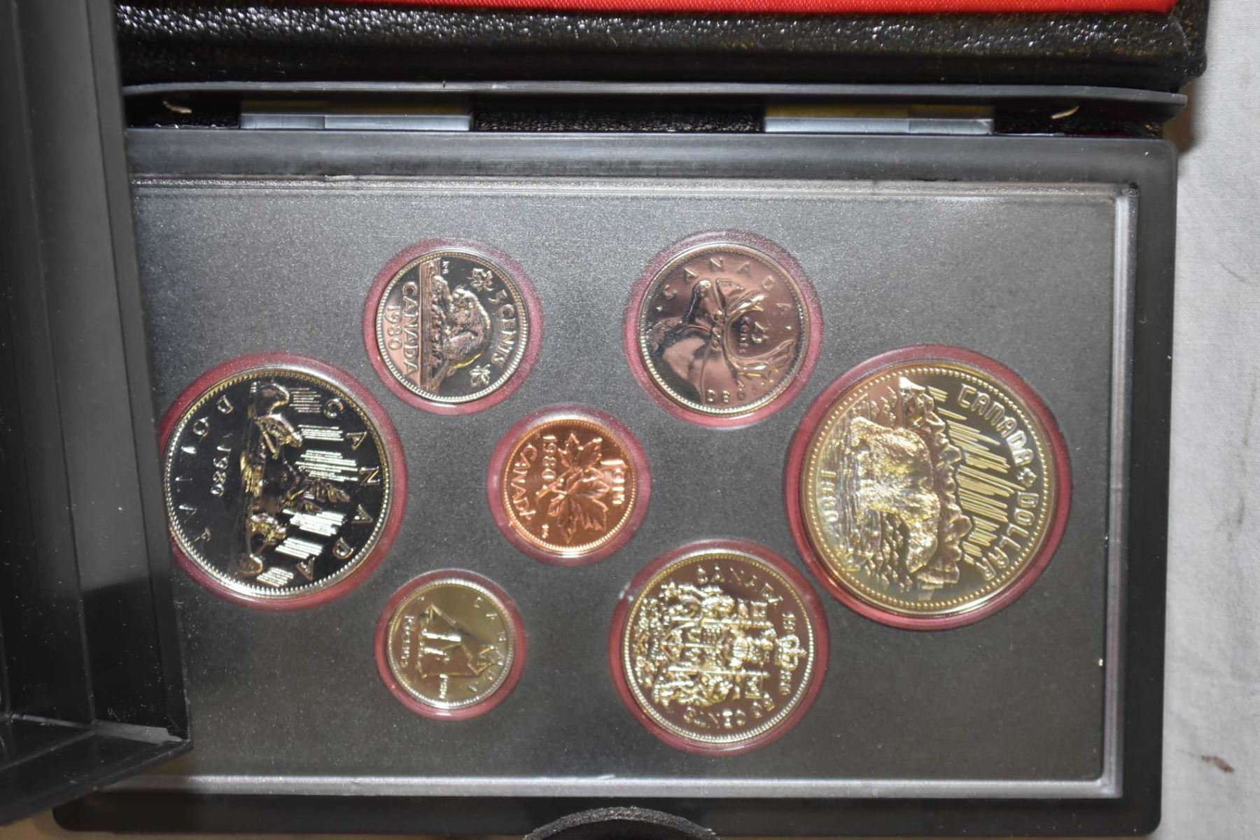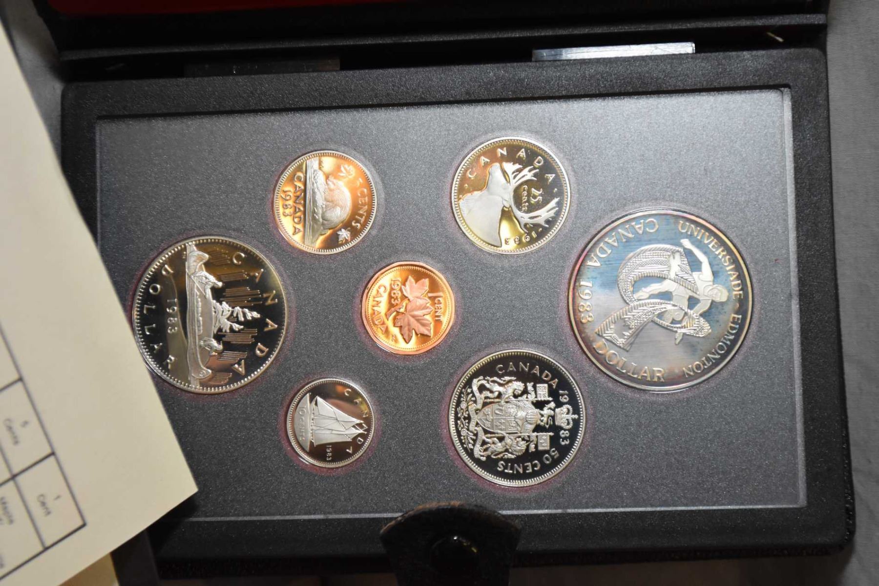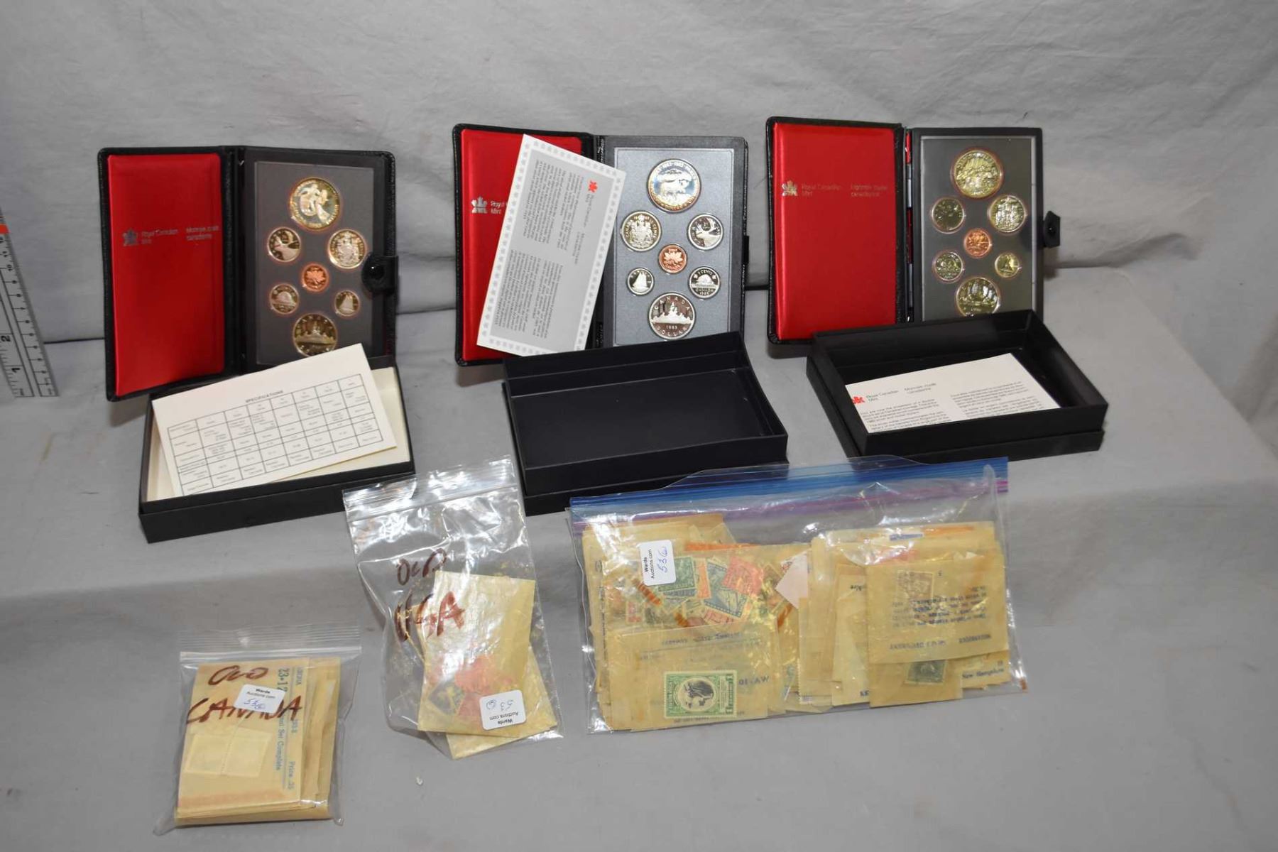 Three boxed coin sets including 1985 double dollar proof set, 1983 Universiade double dollar set and 1980 double dollar set plus a selection of postage stamps
