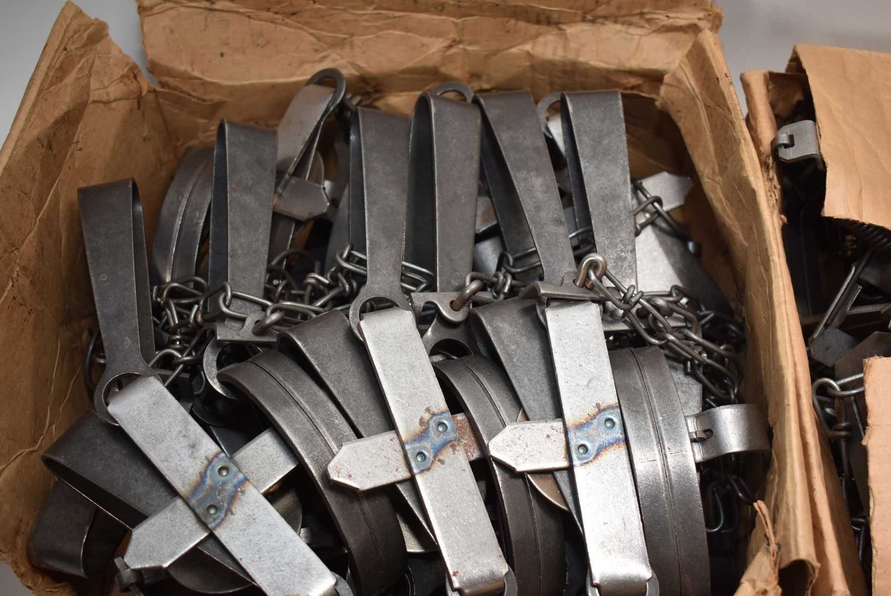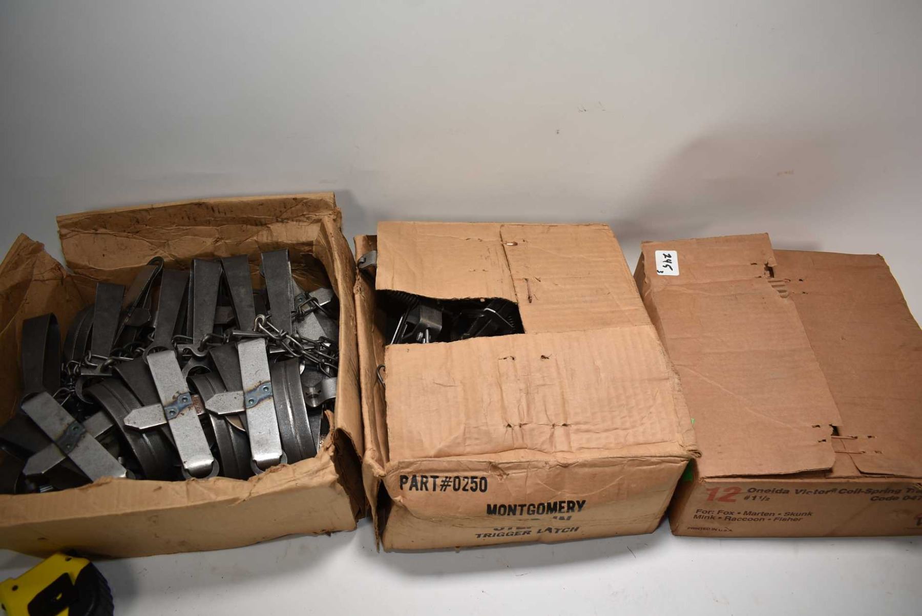 Three boxes of twelve traps including Blake & Lamb long spring no.3, Montgomery trigger latch no. 0250 and Oneida Victor no. 1 1/2 coil spring traps