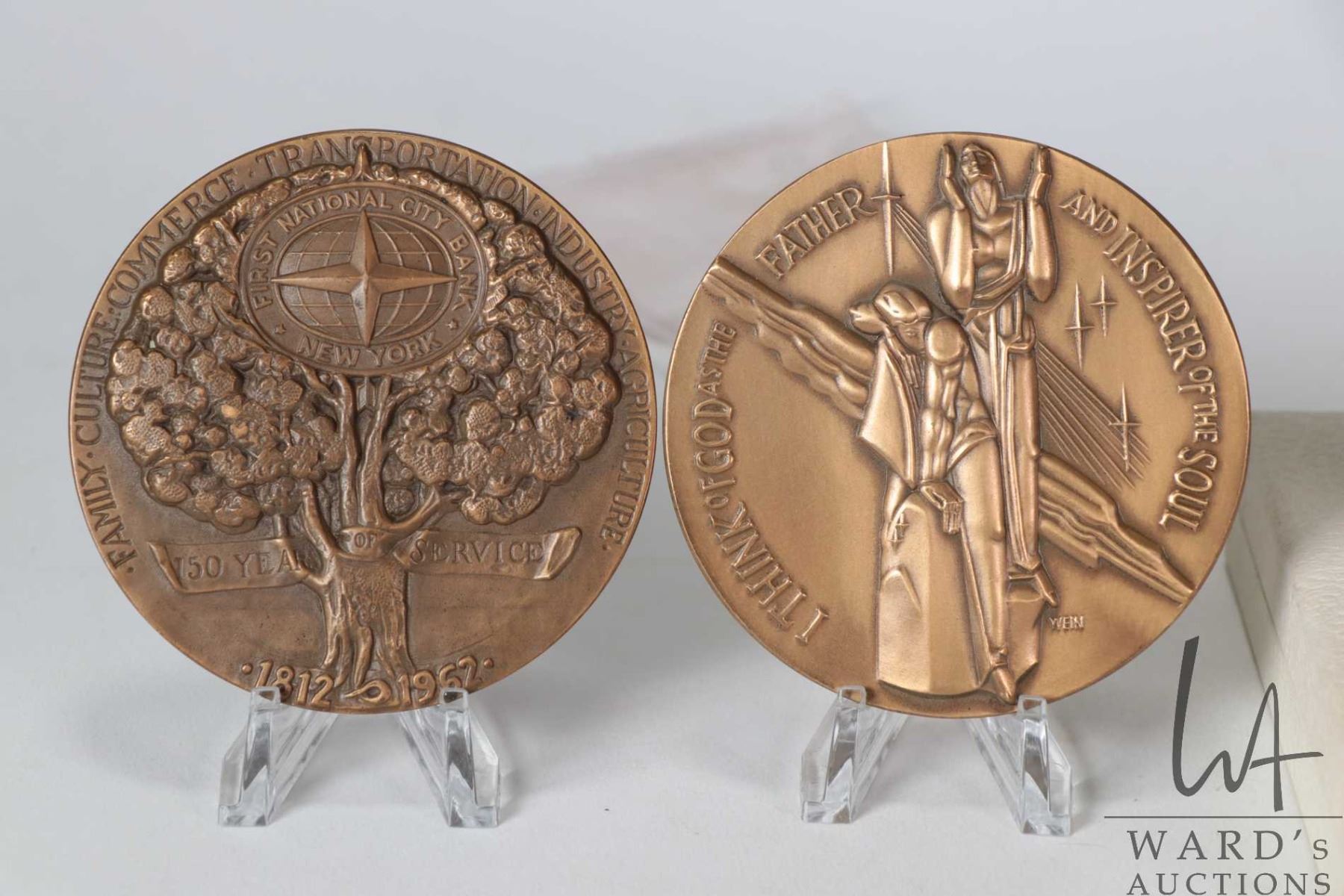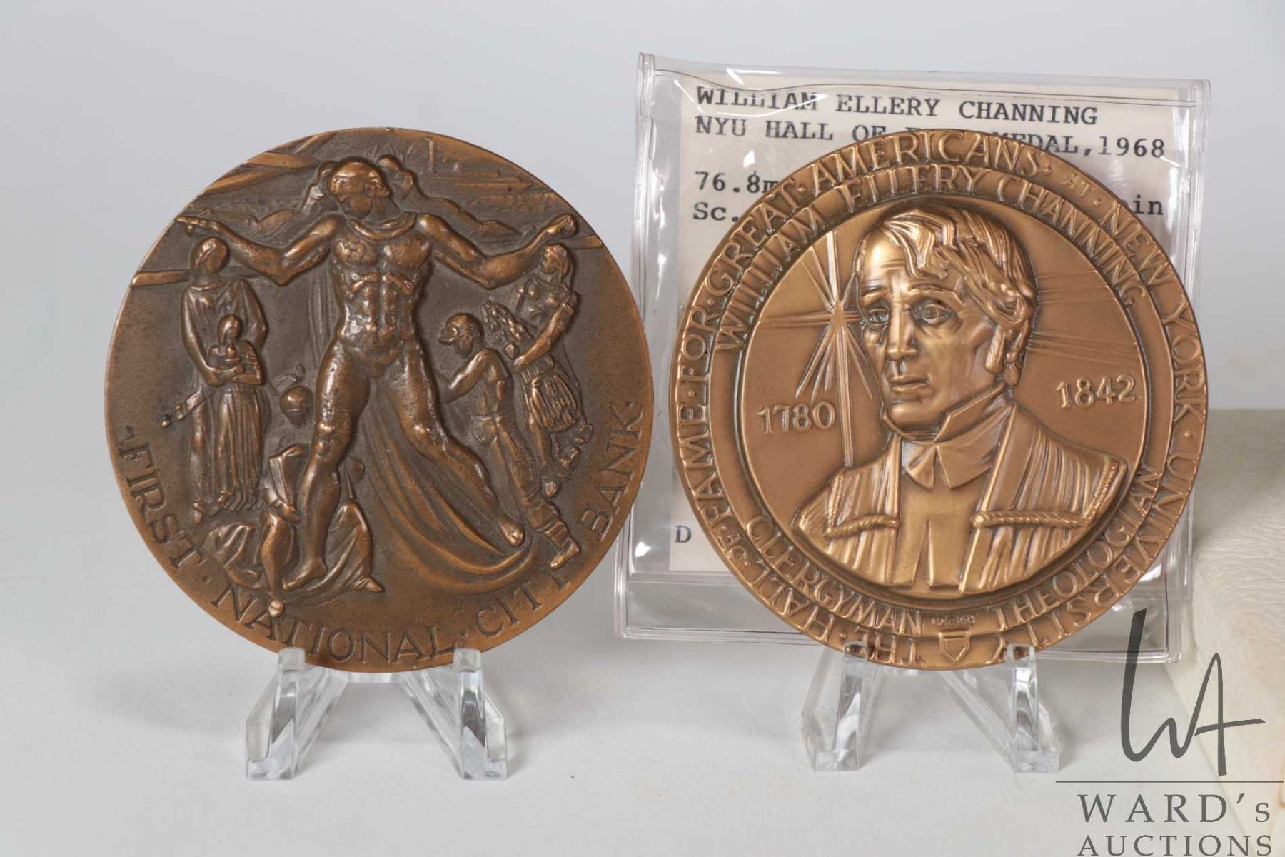 Three bronze medallions including The Franklin Mint 1973 Calendar 3", Us First National City Bank 1962 and US William Ellery Channing, NYU Hall of fame medal 1968, 3"