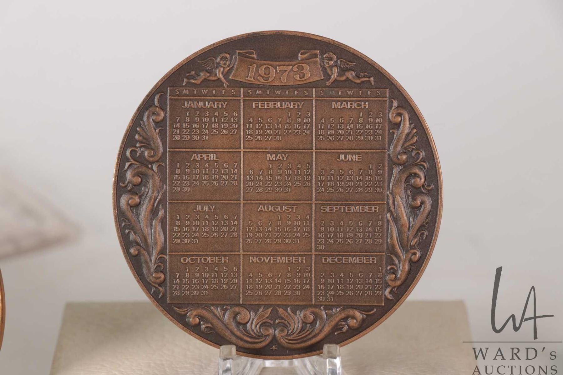 Three bronze medallions including The Franklin Mint 1973 Calendar 3", Us First National City Bank 19