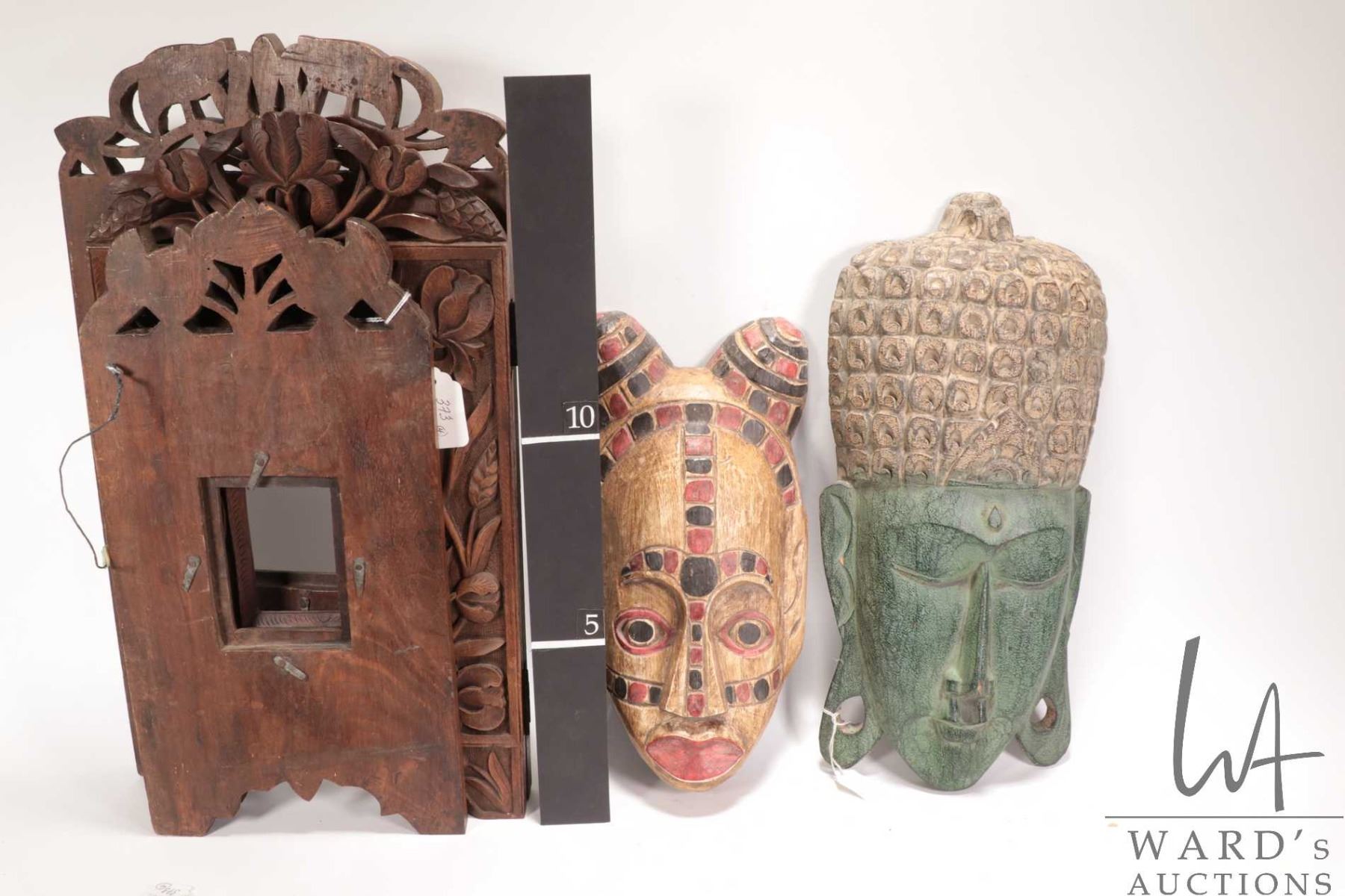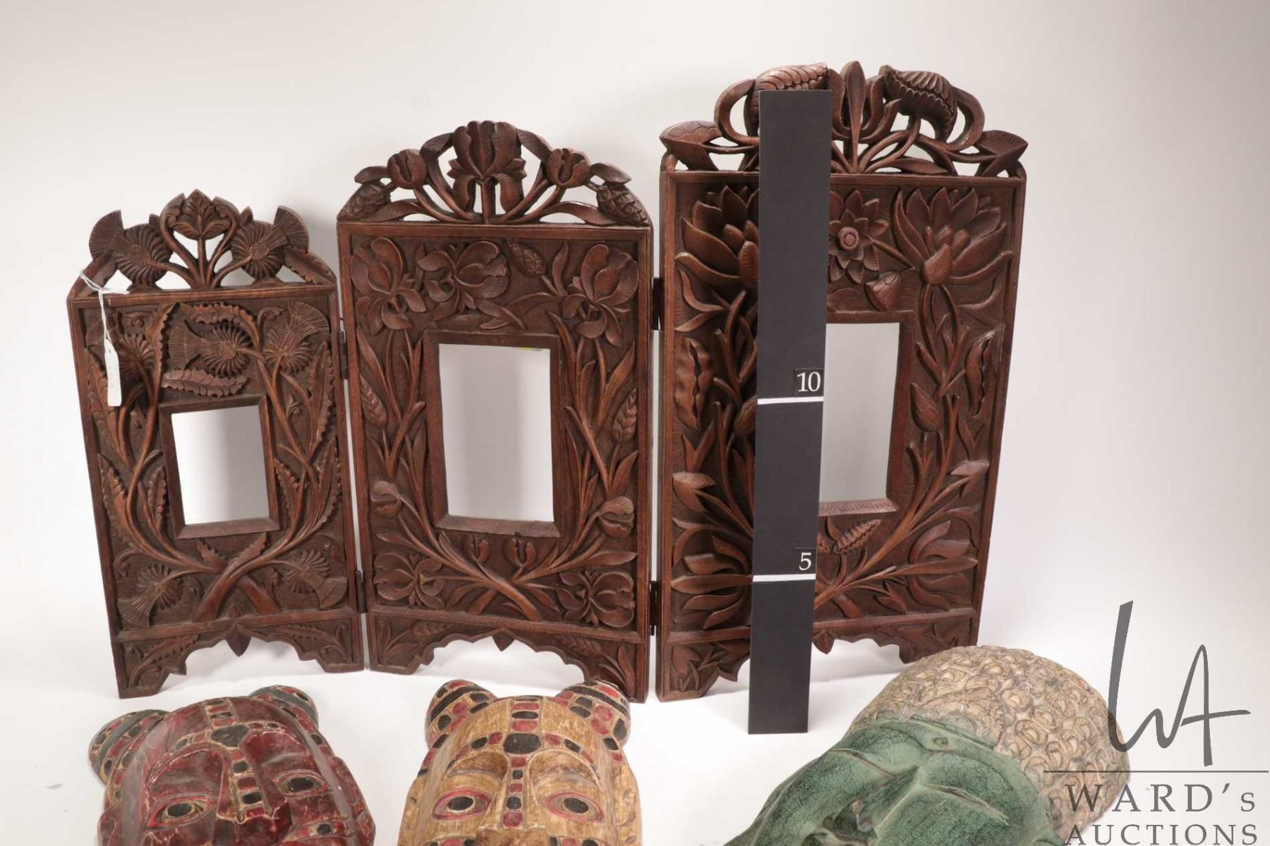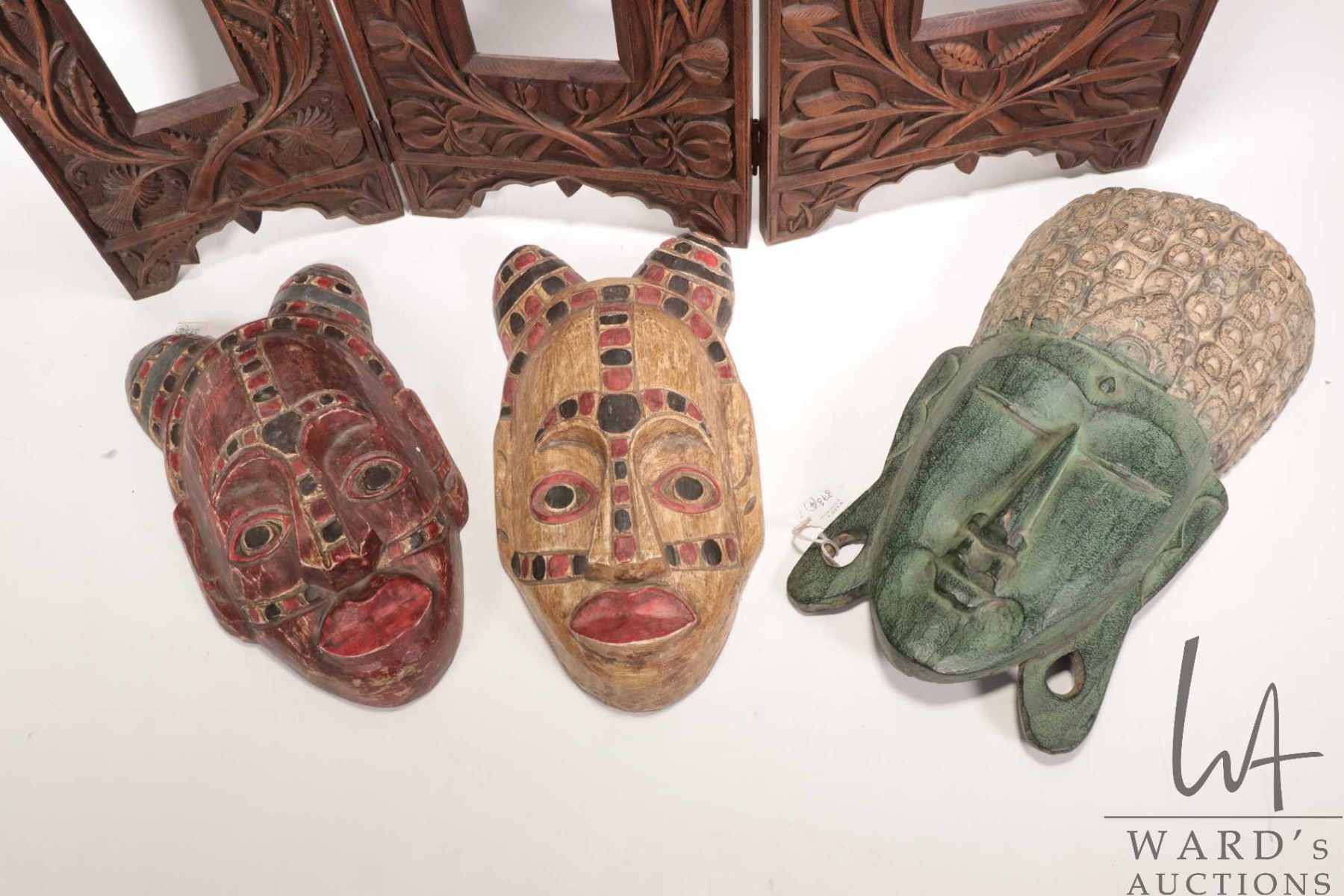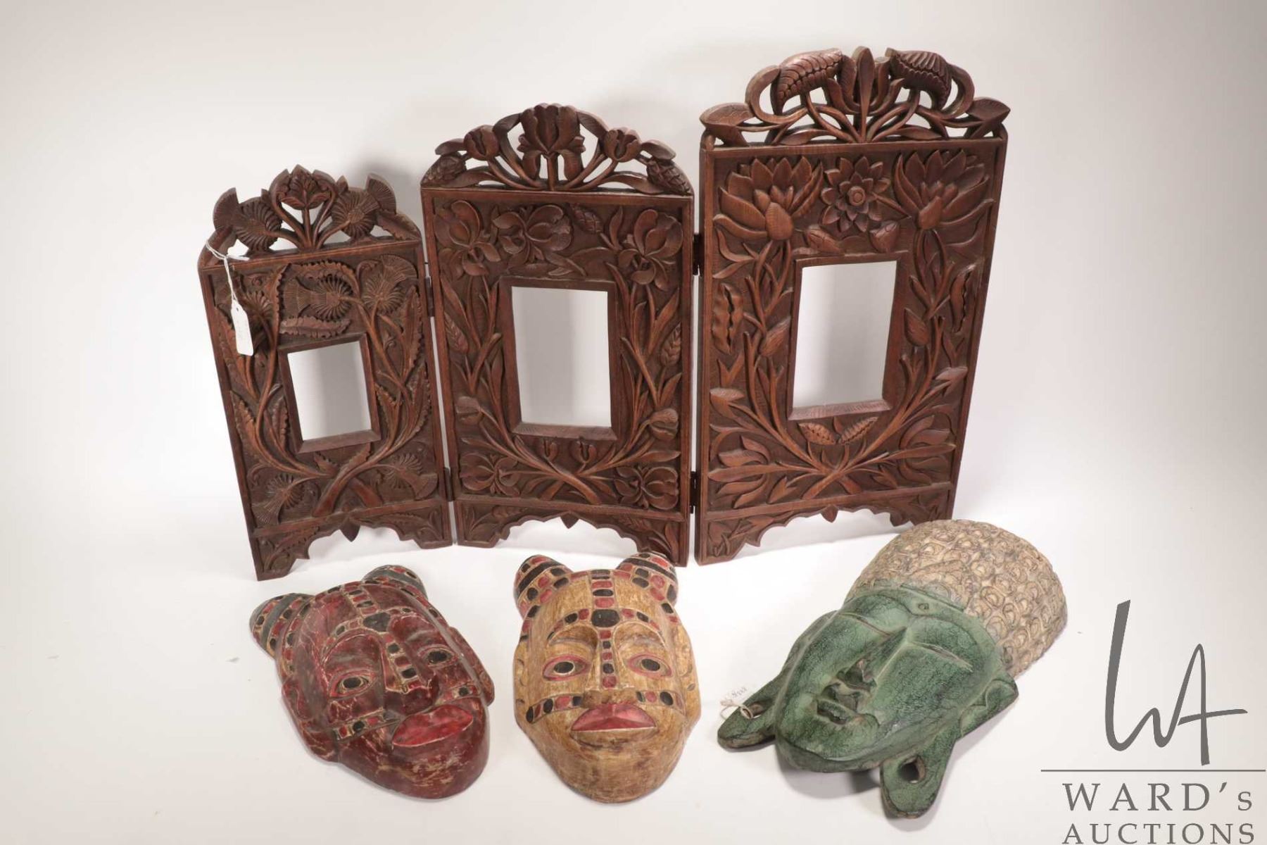 Three carved Indonesia masks and a carved wooden folding frame 19" X 28"