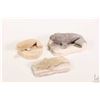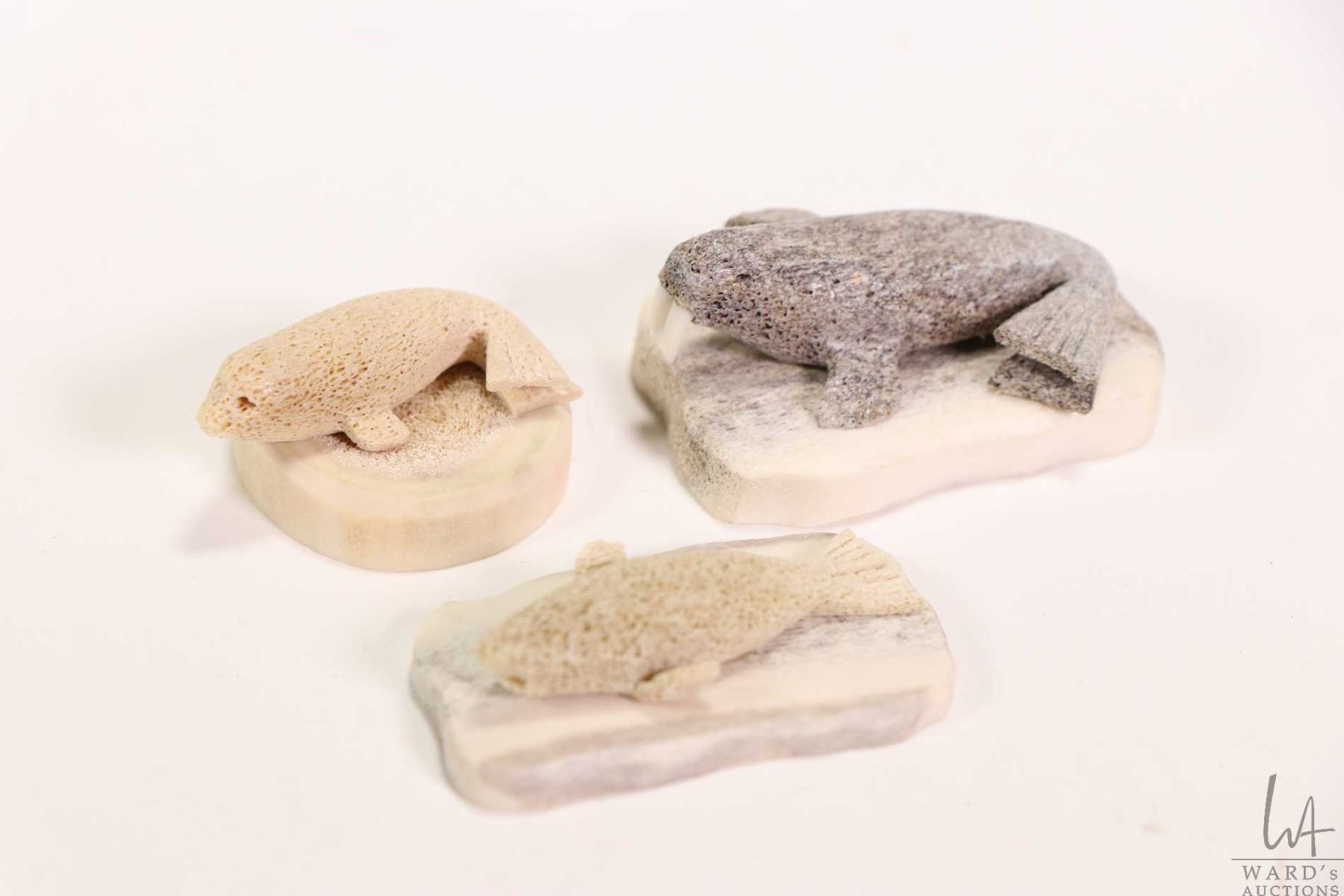 Three carved vertebrae miniatures including a walrus with inset tusks 1 1/2" in length and two seals, all signed by artist Sandy Maniapik, Pangnirtung, Nunavut