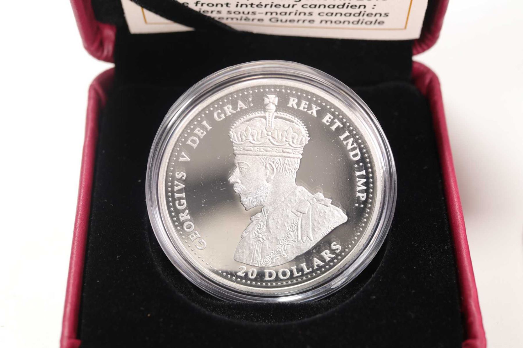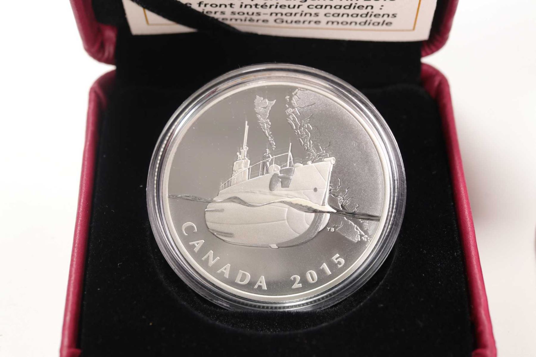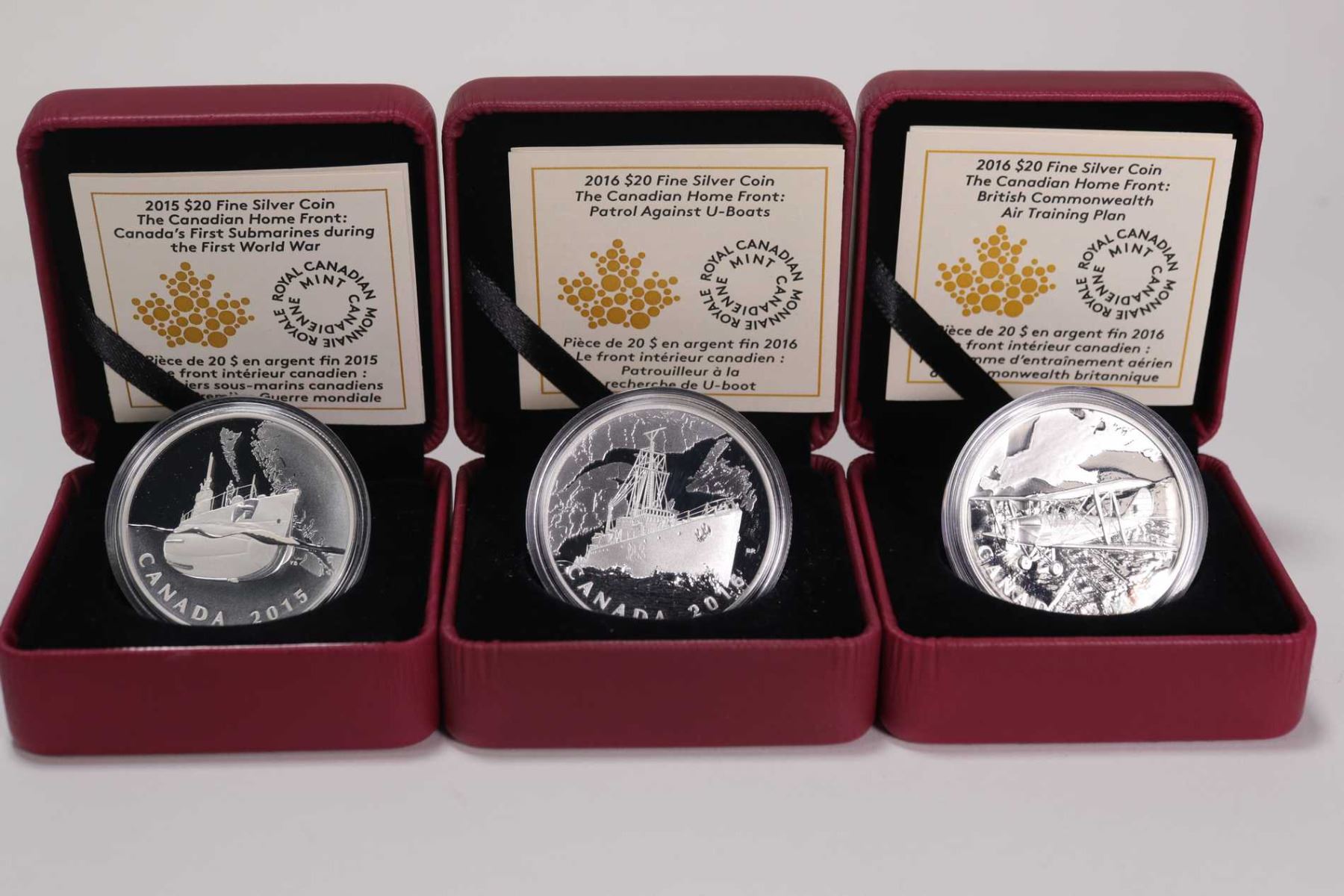 Three cased Royal Canadian Mint coins from The Canadian Home Front collection, all are $20 coins and 31.39grams of 99.99% of pure fine silver including "Canada's First Submarine during the First World War", " The British Commonwealth Air Training Plan" and "Patrol Against U-Boats" originally retailed for $89.95
