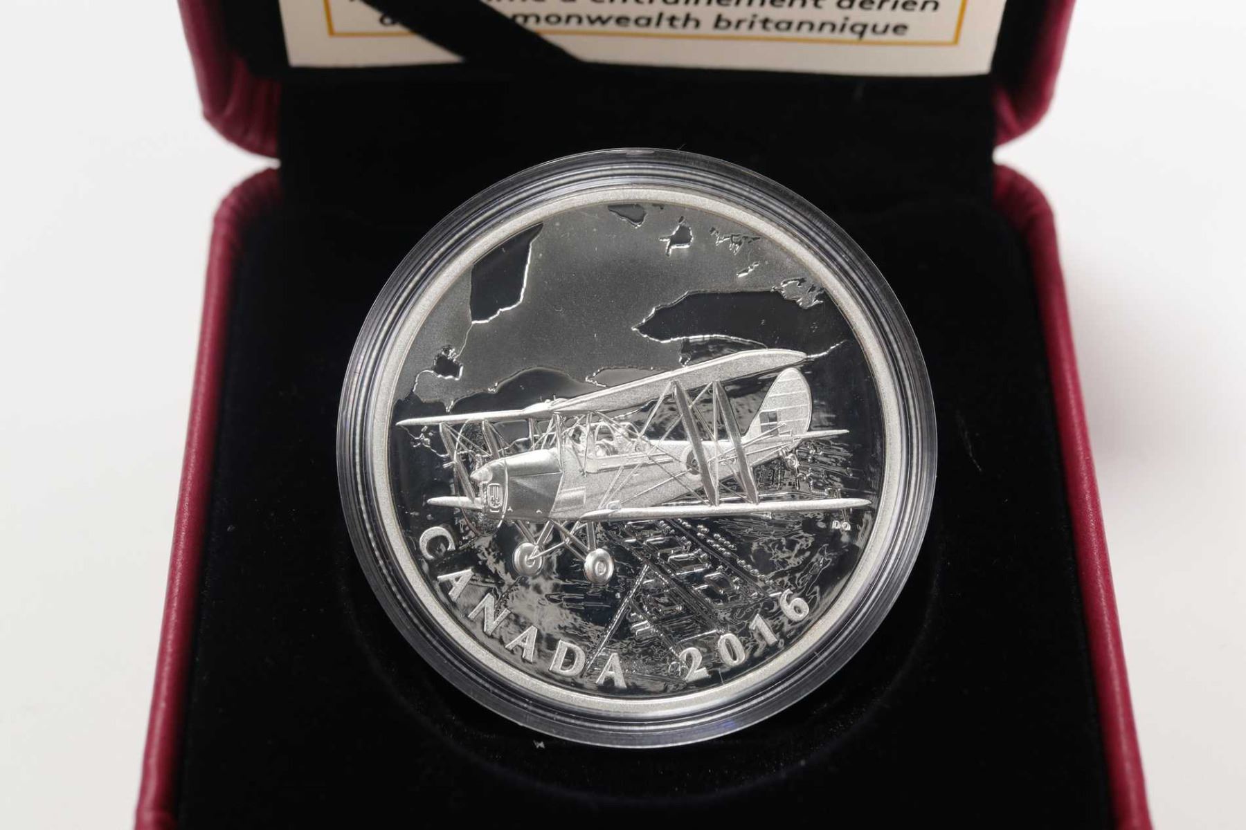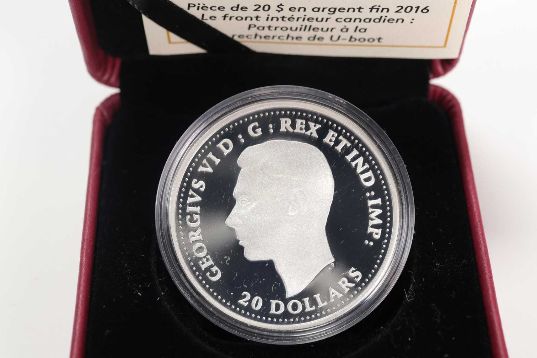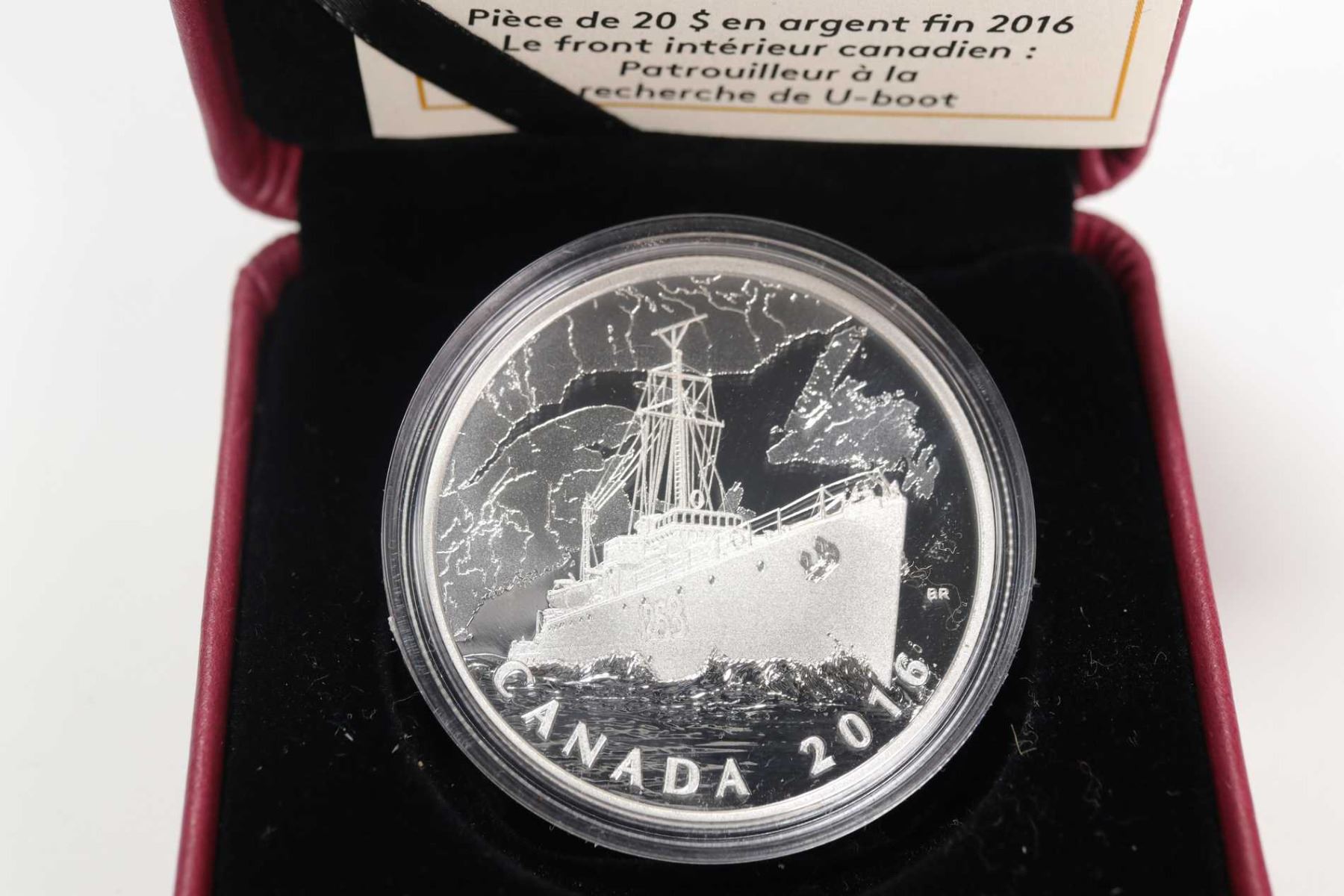 Three cased Royal Canadian Mint coins from The Canadian Home Front collection, all are $20 coins and 31.39grams of 99.99% of pure fine silver including "Canada's First Submarine during the First World War", " The British Commonwealth Air Training Plan" and "Patrol Against U-Boats" originally retailed for $89.95