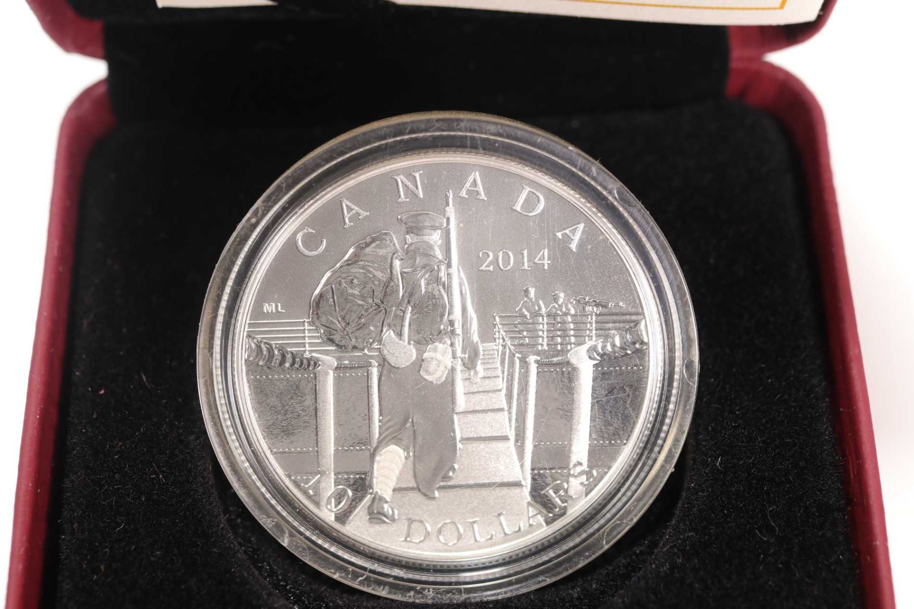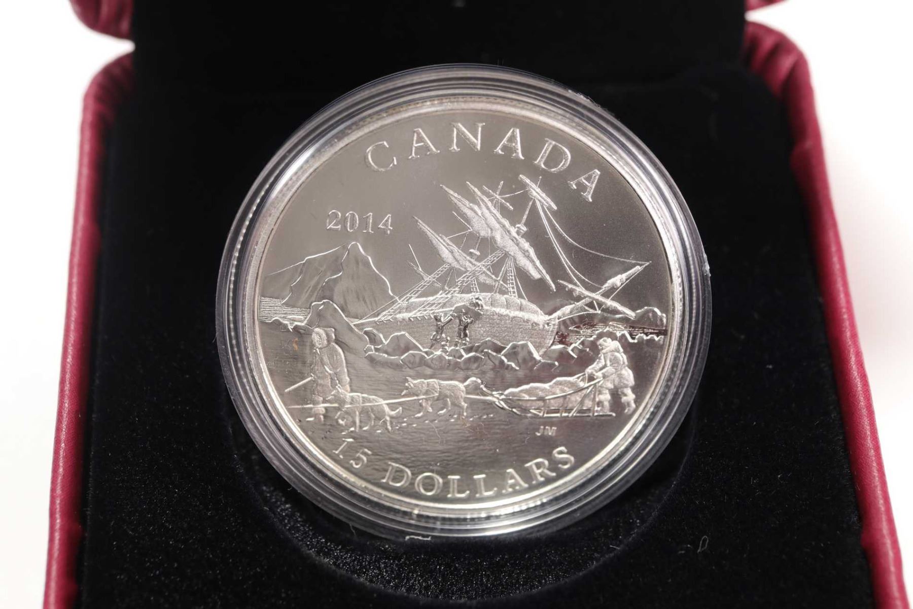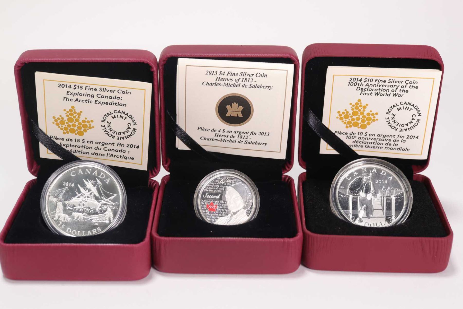 Three cased Royal Canadian Mint collector coins including 2013 "Heroes of 1812-Charles Michel de Salaberry" $20, 99.99% fine silver coin which originally retailed for $49.95, 2014 " Exploring Canada" The Arctic Expedition" $15, .925 sterling silver coin and a 2014 "100th Anniversary of the Declaration of the First World Ward $10, 99.99% fine silver coin