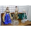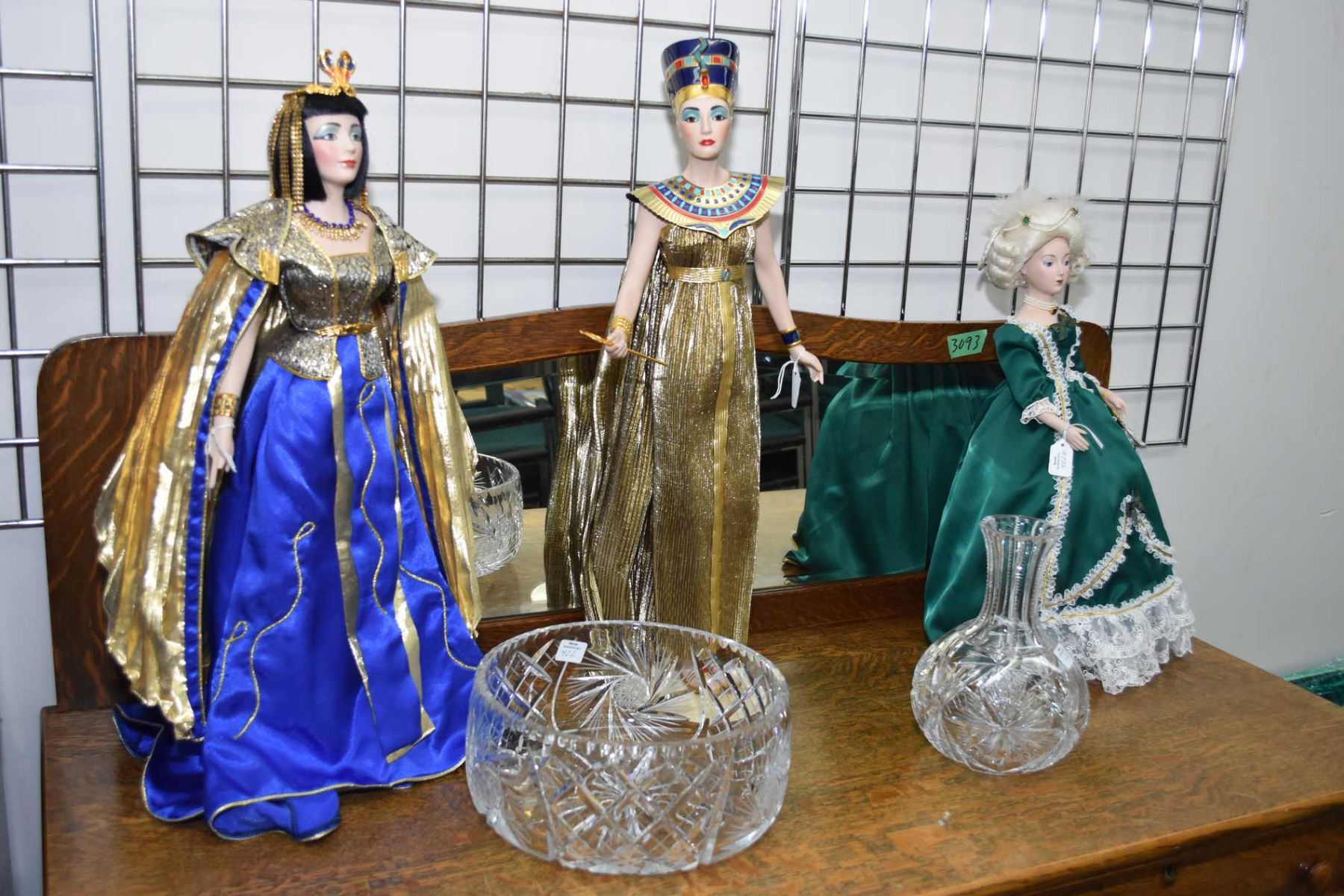 Three collector's dolls including Cleopatra, Nerfriti and Marie Antoinette plus a pinwheel crystal fruit bowl 9" in diameter and a 8" tall wine decanter