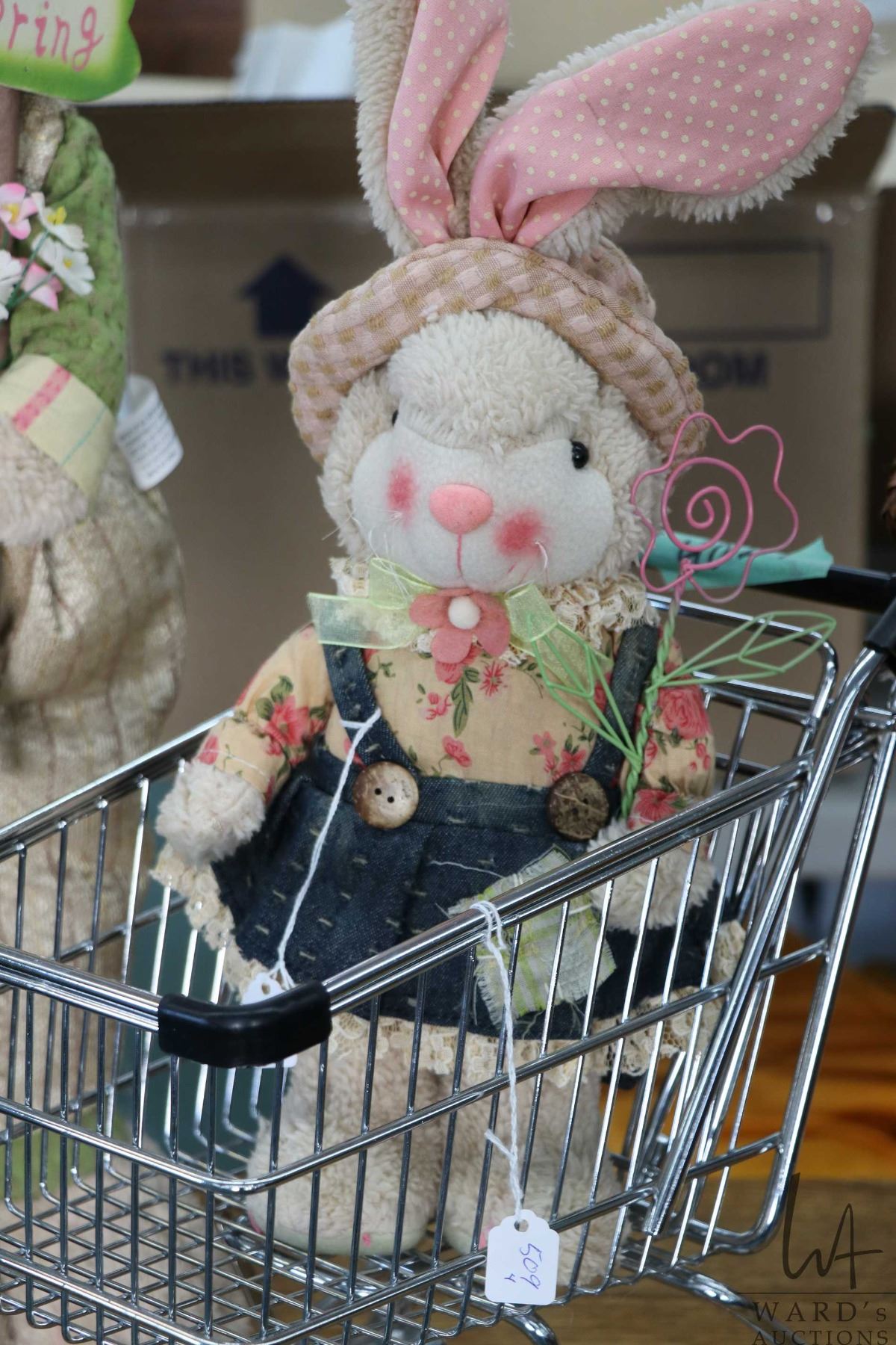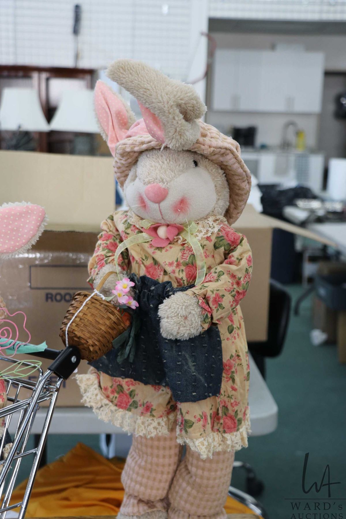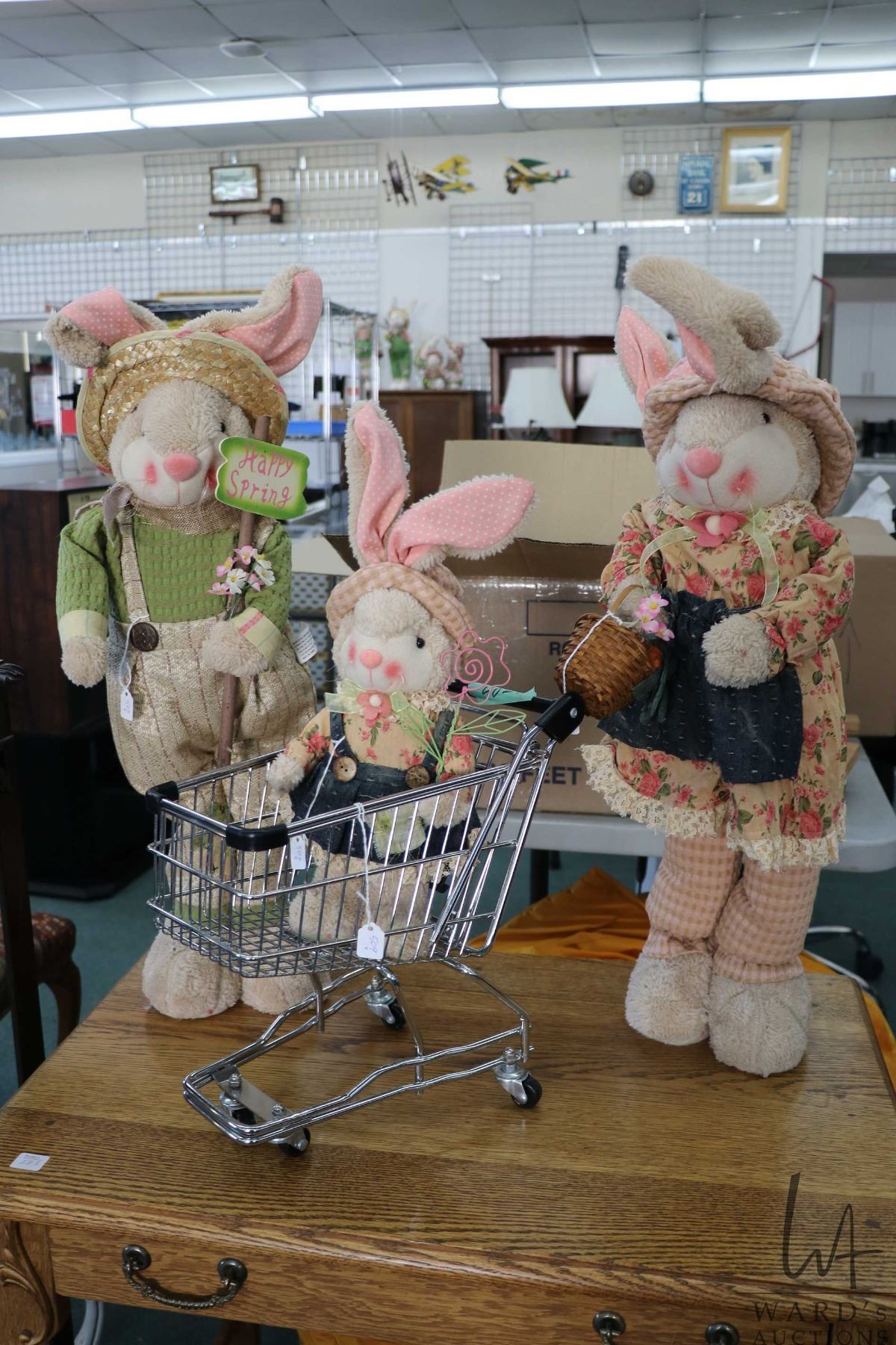 Three decor Easter rabbits including 24" mum and dad plus baby and a metal miniature shopping cart