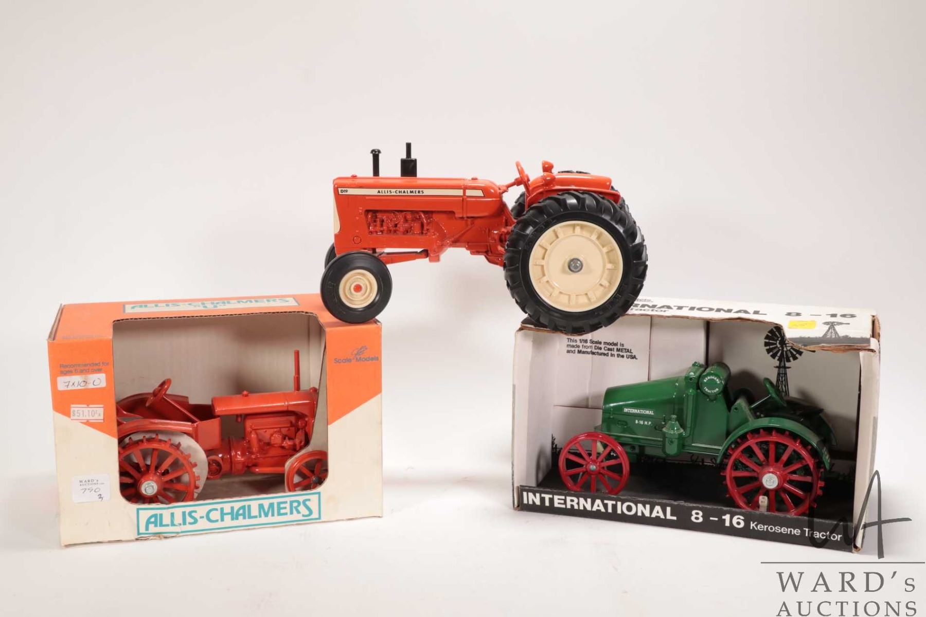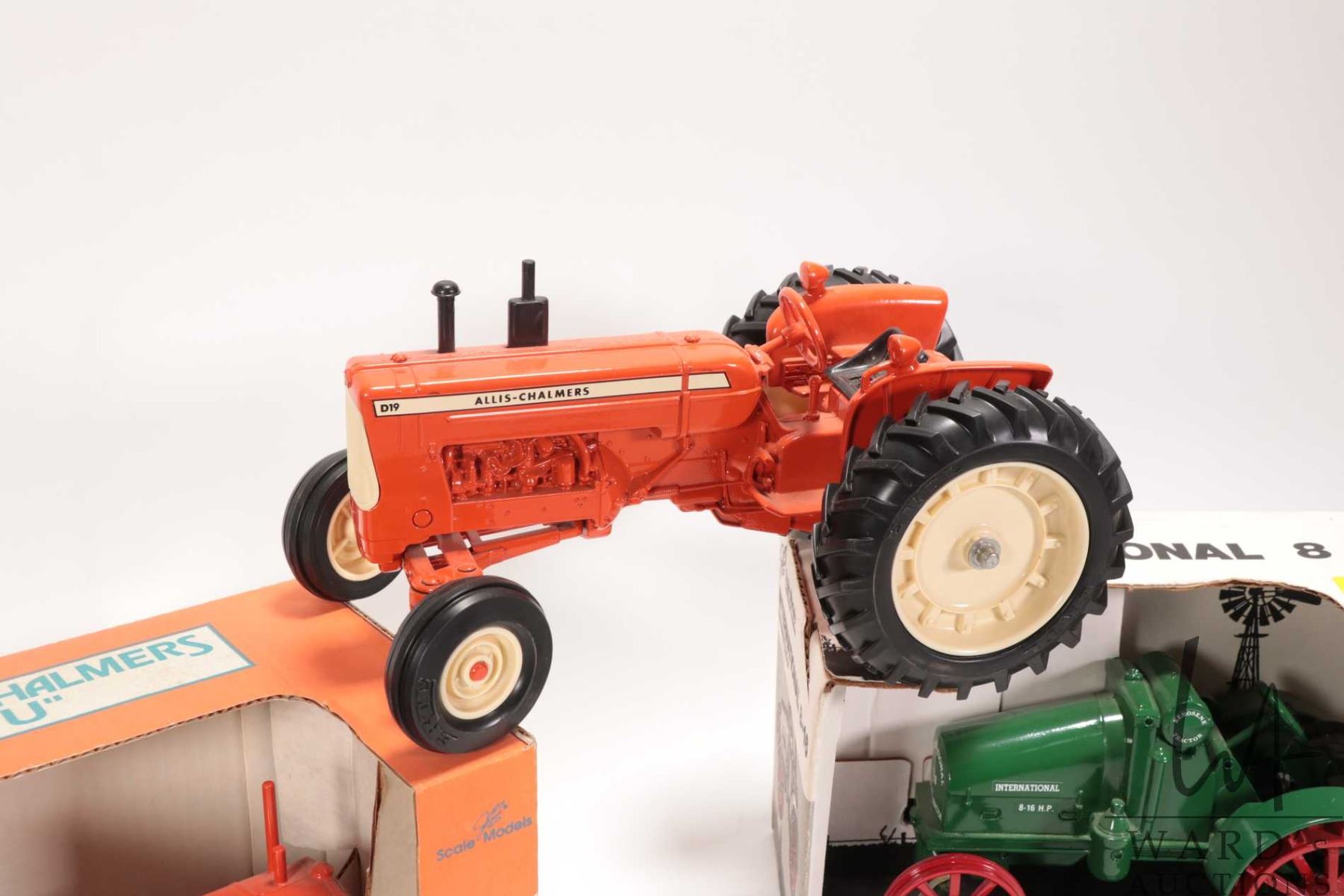 Three die-cast 1:16 scale Tractors including Scale Model International 8-16 Kerosene Tractor, Allis-Chalmers Model U, both with original box plus an unboxed Allis-Chalmers D19 tractor