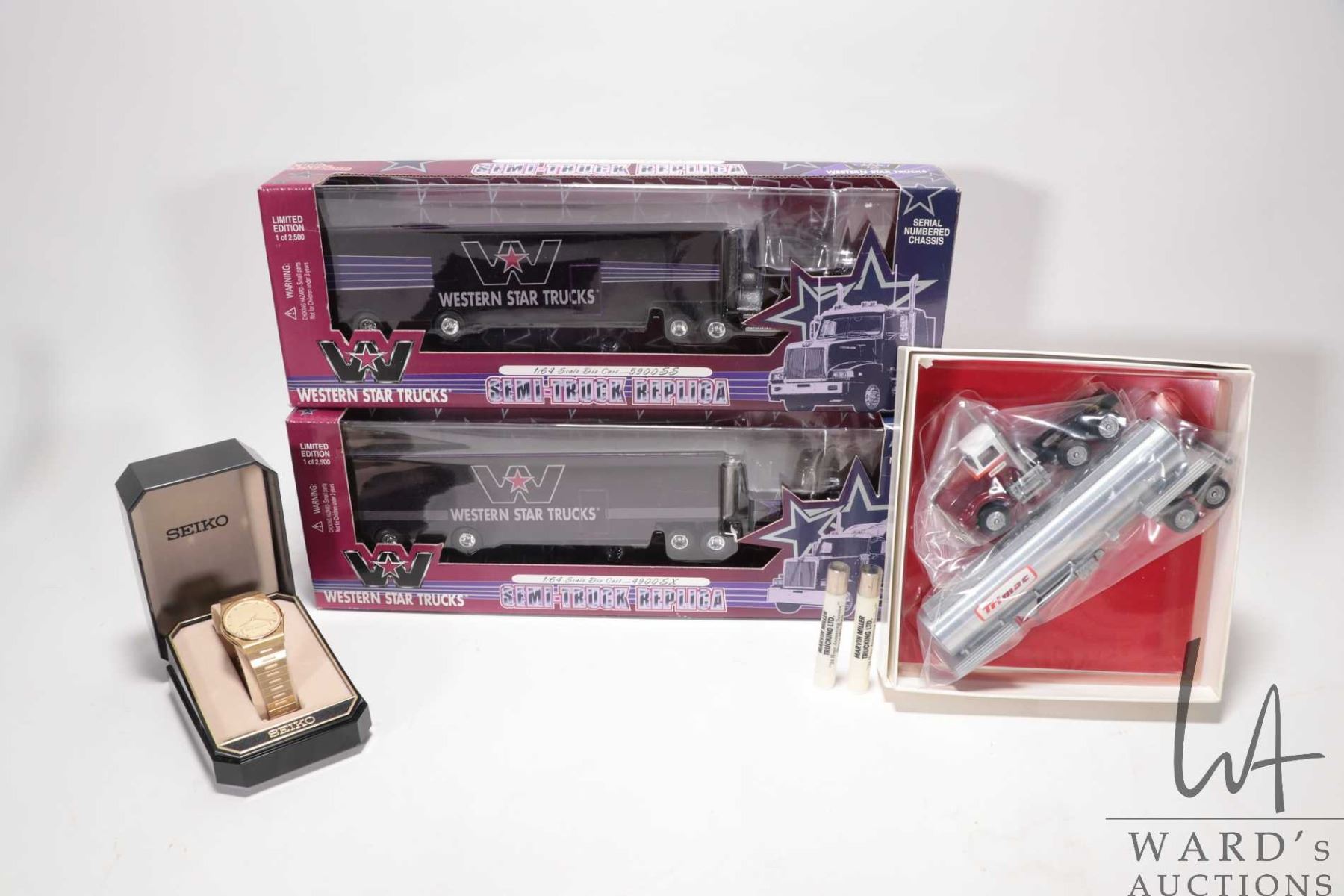 Three die cast 1:64 scale Semi-Trucks including two Western Star van trucks, a Kenworth Trimac truck, a Trimac Seiko watch, etc