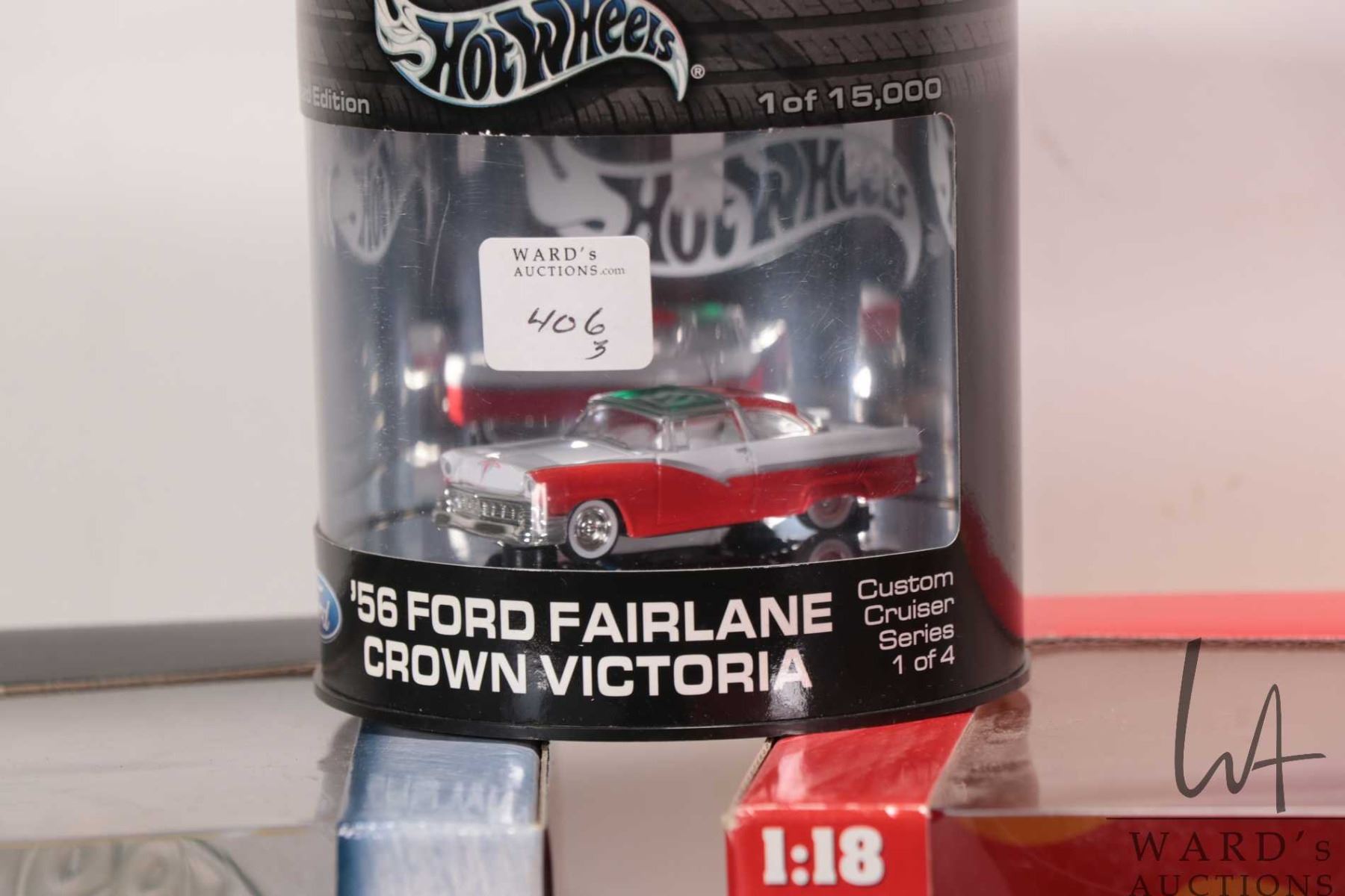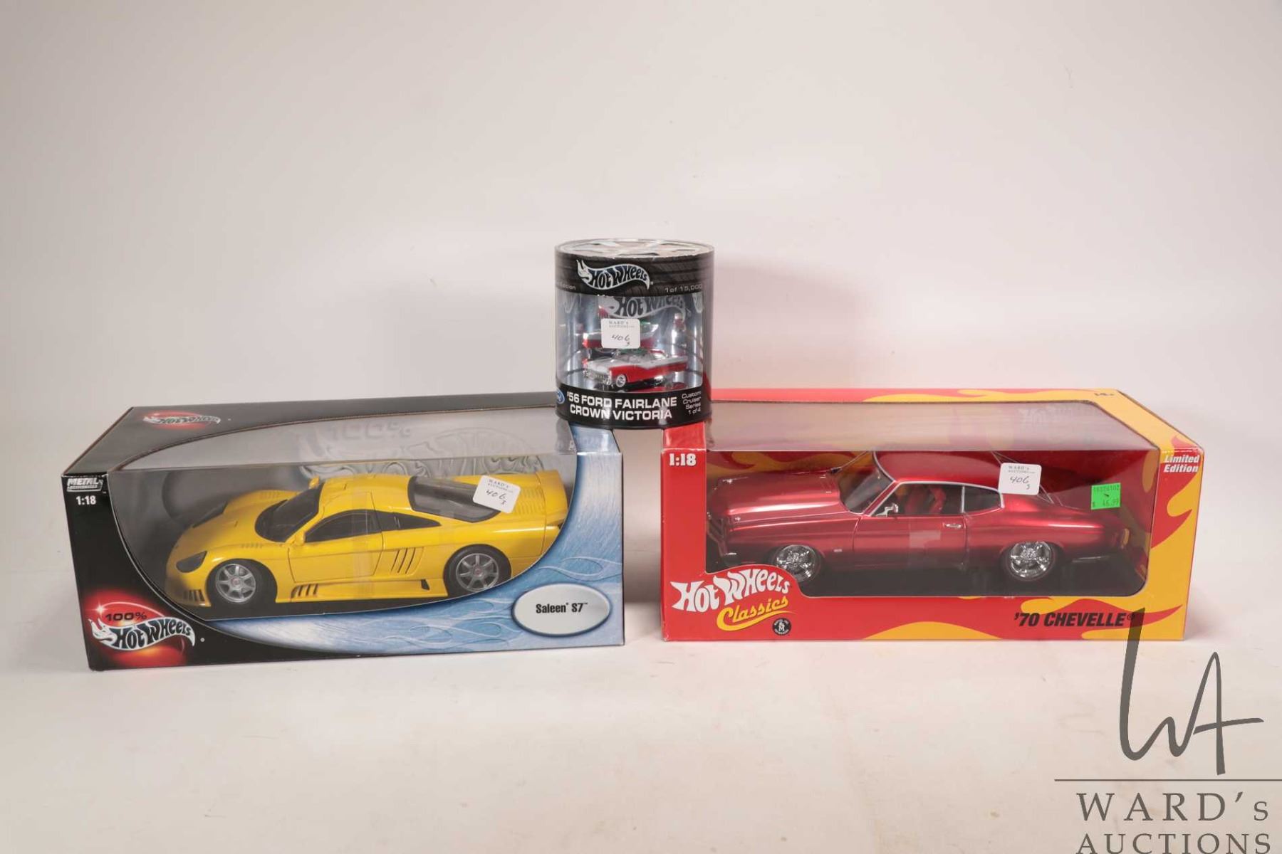 Three die cast Hot Wheels including 1:64 scale 1956 Ford Fairlane Crown Victoria and 1:18 scale '70 Chevelle and Saleen S7