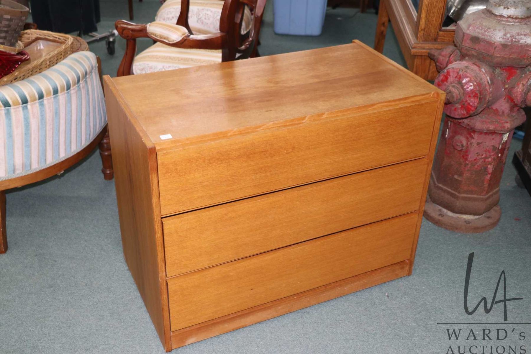 Three drawer teak veneer low boy to match lot 158, 26" high X 33" wide and 18" deep