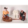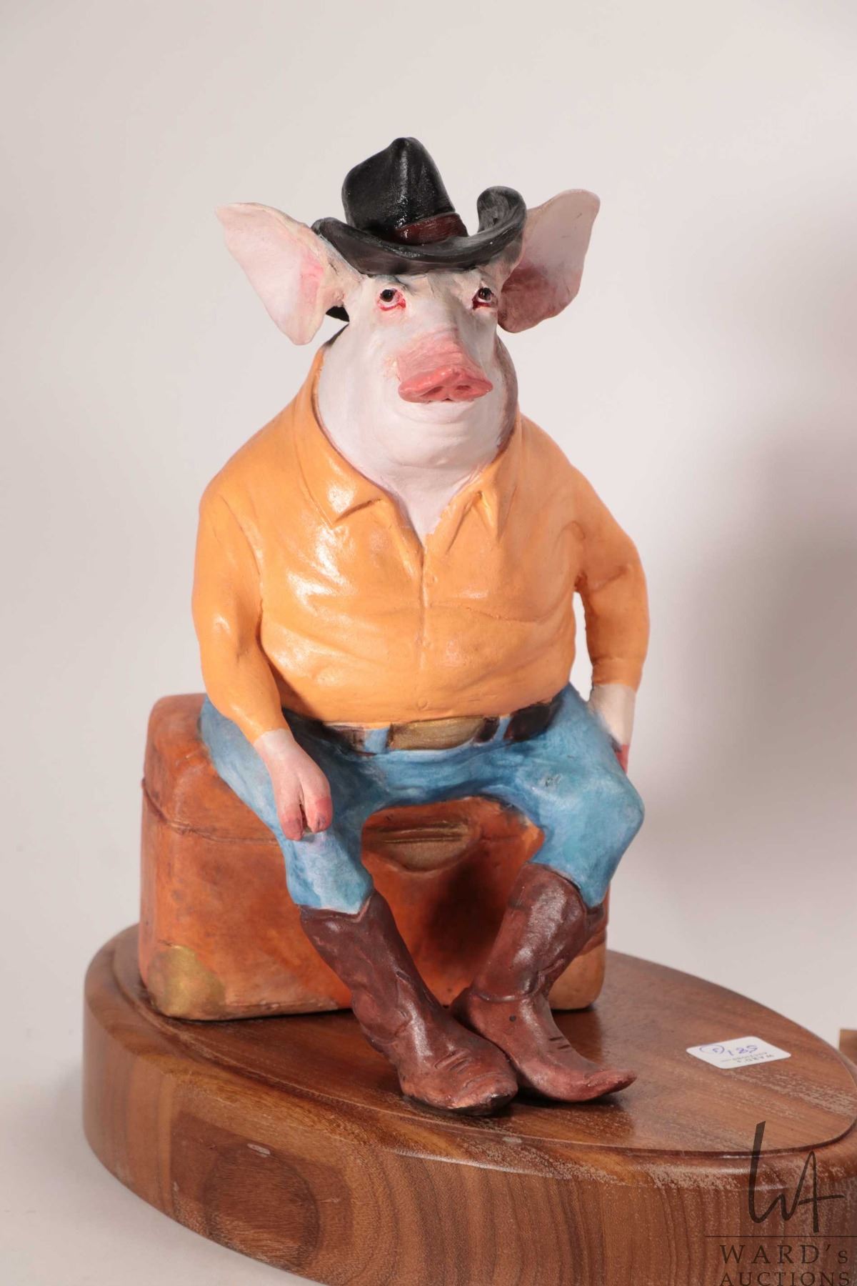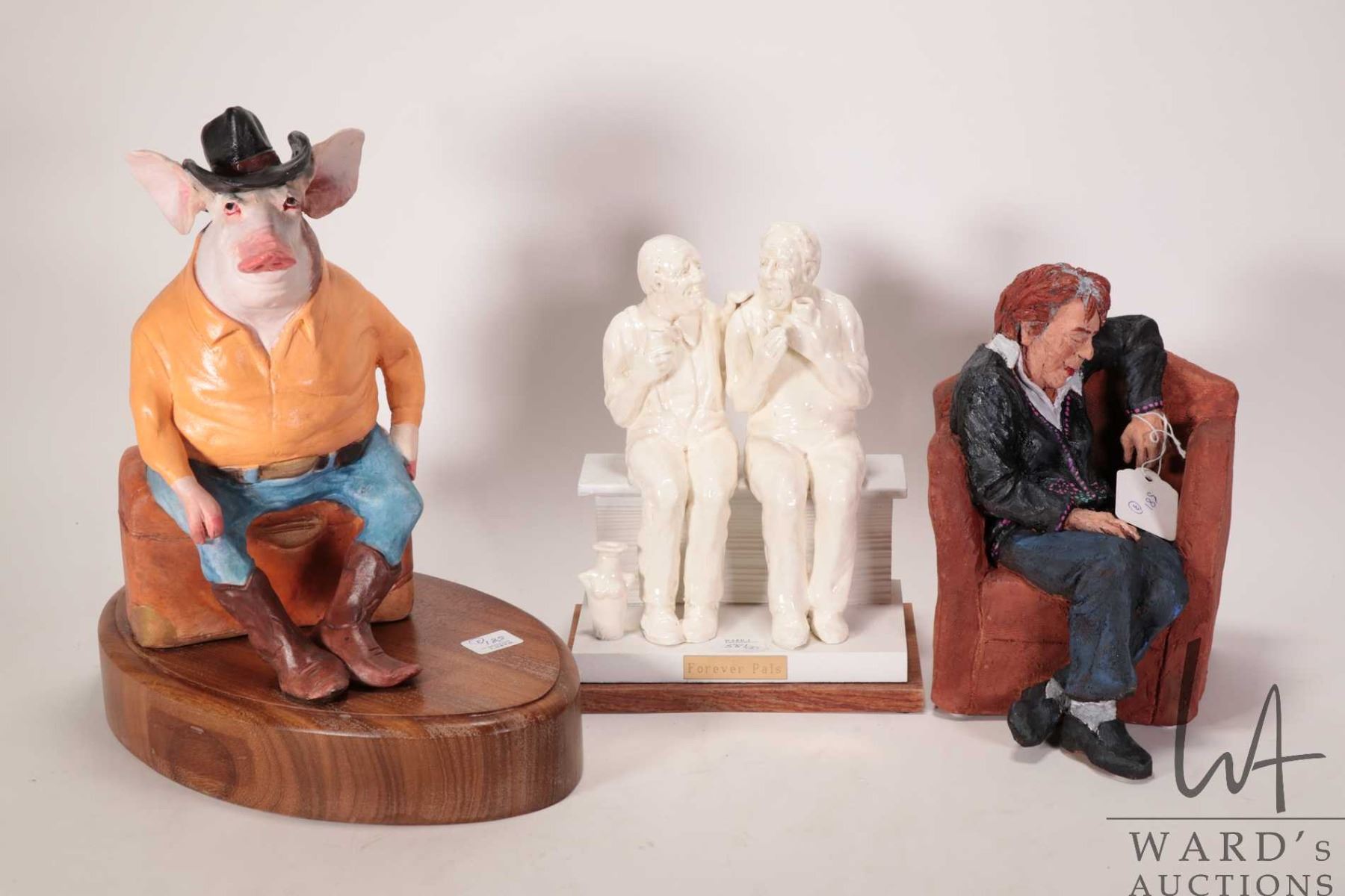 Three figural sculptures including artist made "Forever Pals" 9" in height, a woman sleeping in an armchair and a cowboy pig on wooden plinth, signed by artist G. Hughes 12" in height