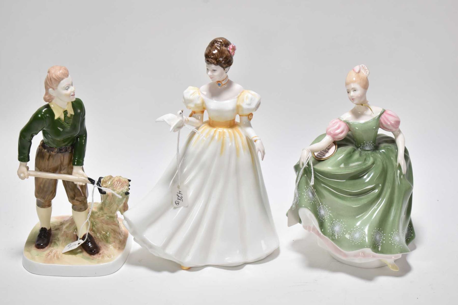 Three figurines including Royal Doulton Michele HN2234 and Kathleen HN3609 plus a Coalport figurine "For KIng and Country"
