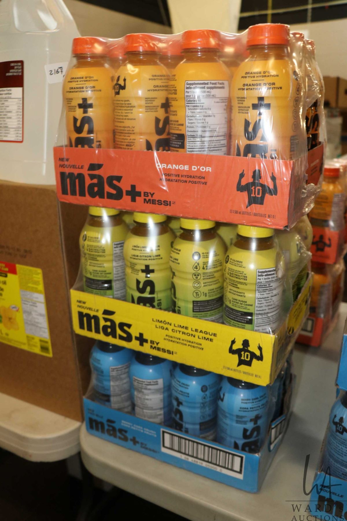 Three flats w/ 12 500ml bottles of Mas+ including one orange, one lemon and one blueberry copa crush