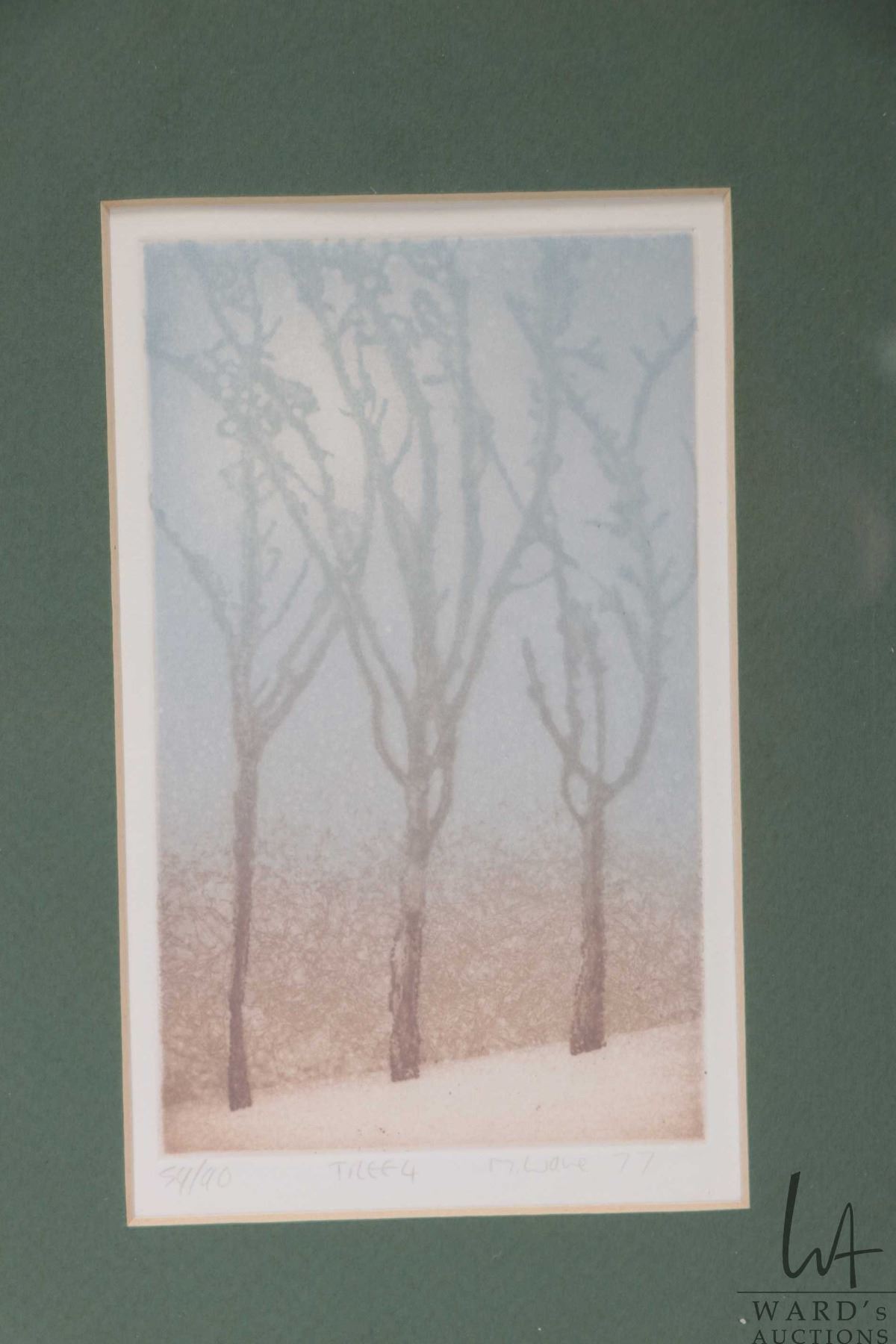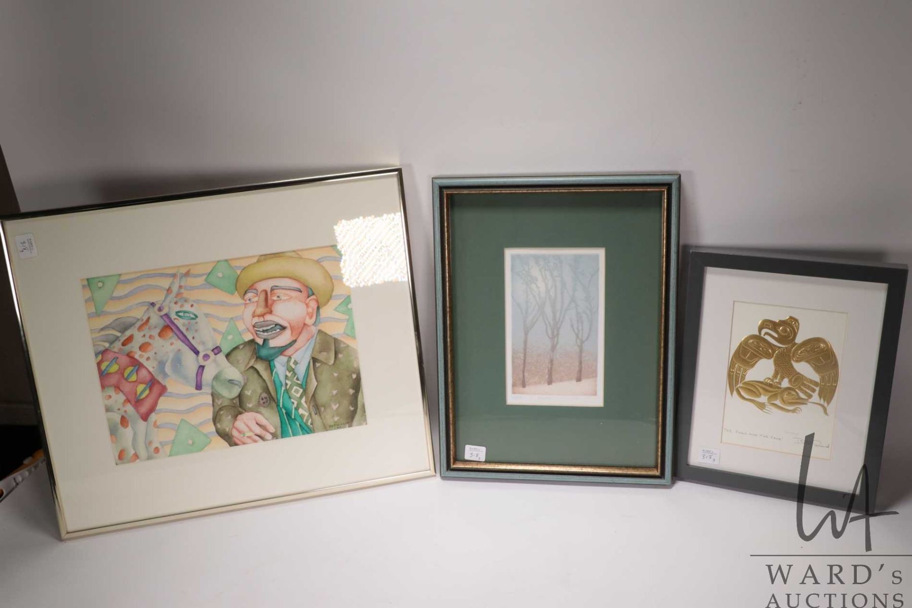 Three framed art works including watercolour man and horse signed by artist Brownoff 65, 8 1/2" X 12", Bill Reid gold "Eagle and the Frog" and limited edition "Tree 4" pencil signed by artist M. Wane '77, 54/90