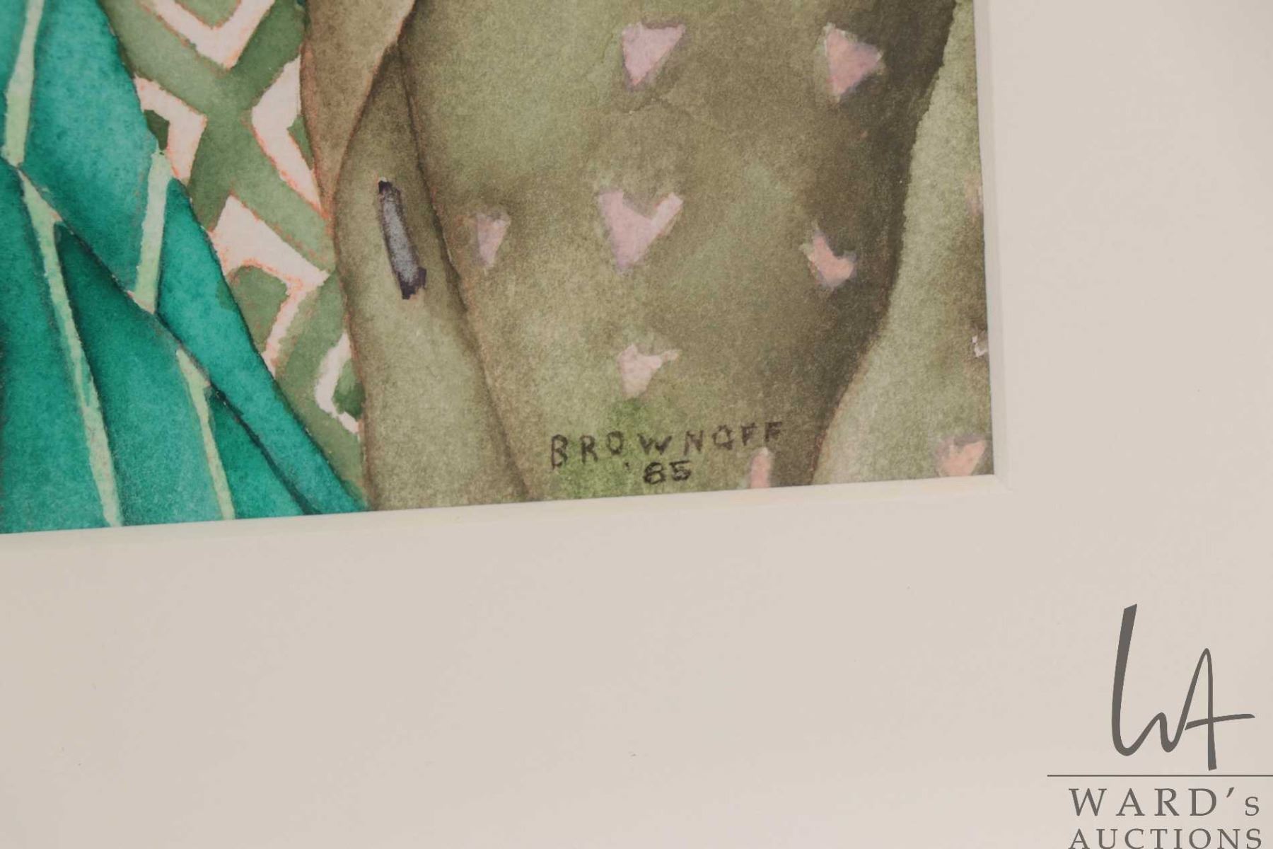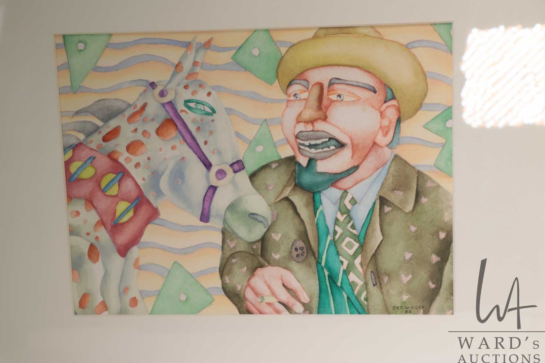 Three framed art works including watercolour man and horse signed by artist Brownoff 65, 8 1/2" X 12
