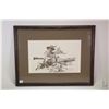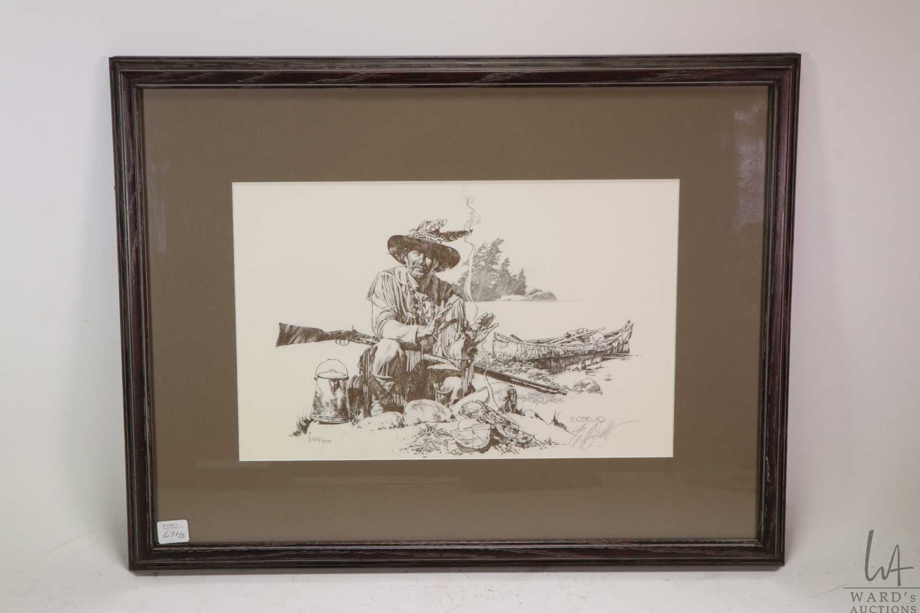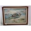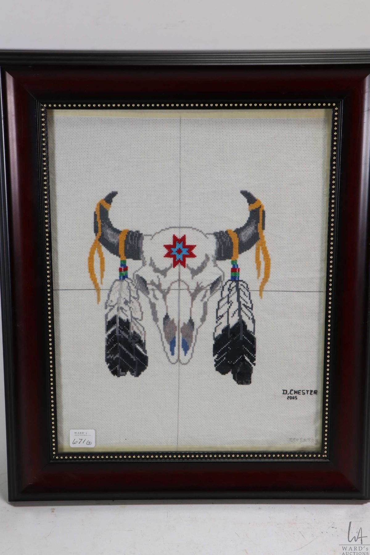 Three framed artworks including C.M. Russell print "War Party", limited edition print "Packing Out" pencil signed by artist E. Cselko 3/400 and a needle work buffalo skull by D. Chester 2005