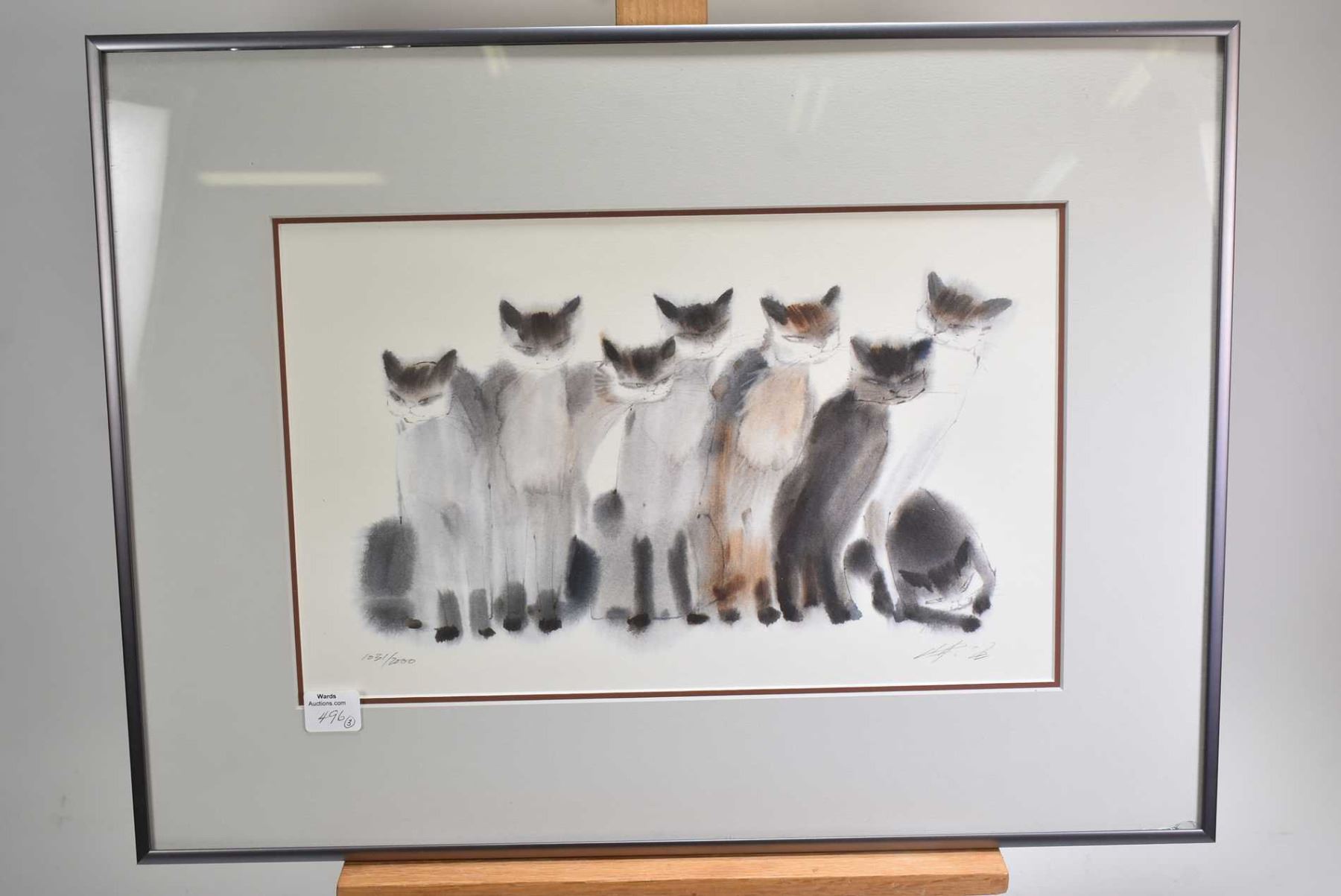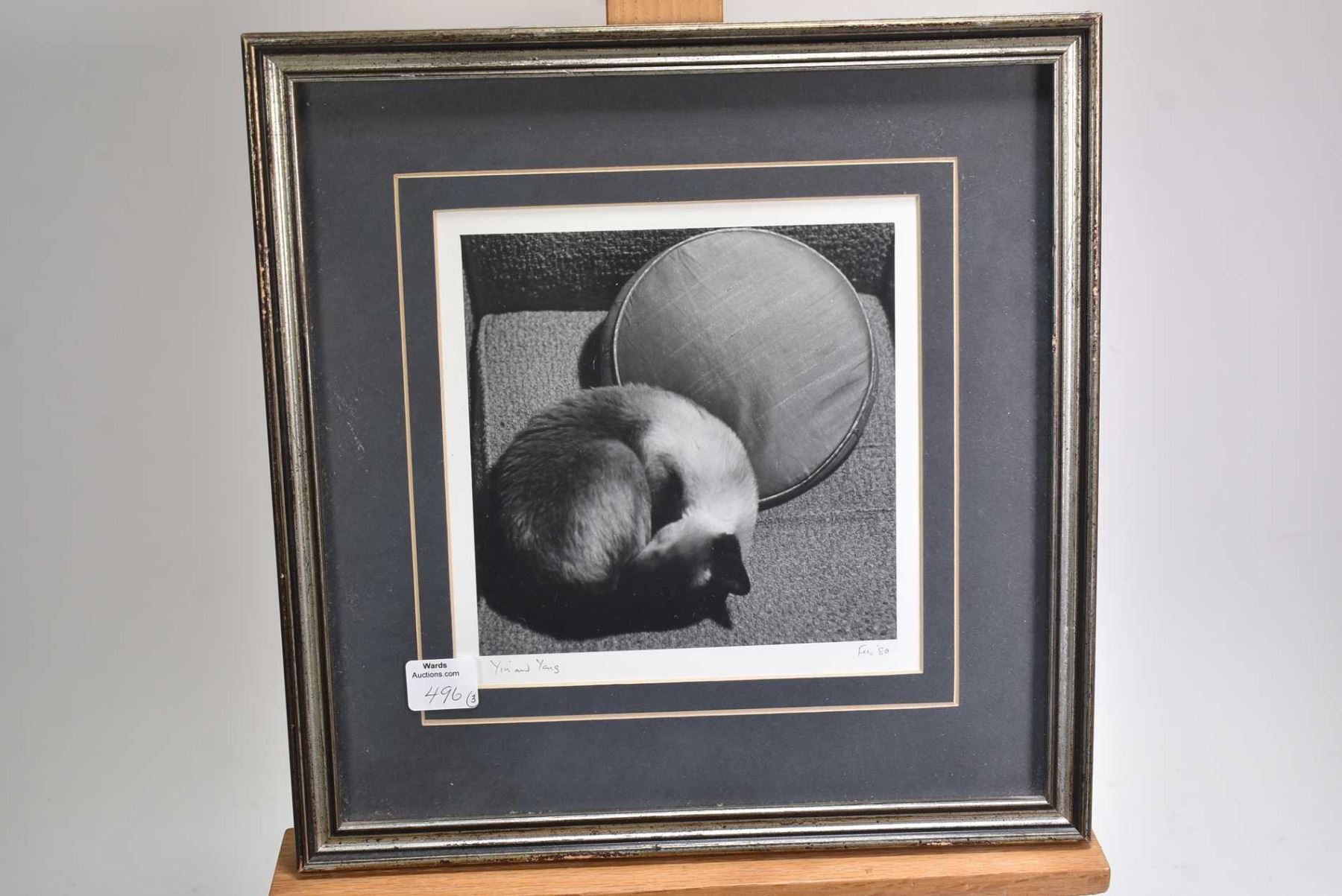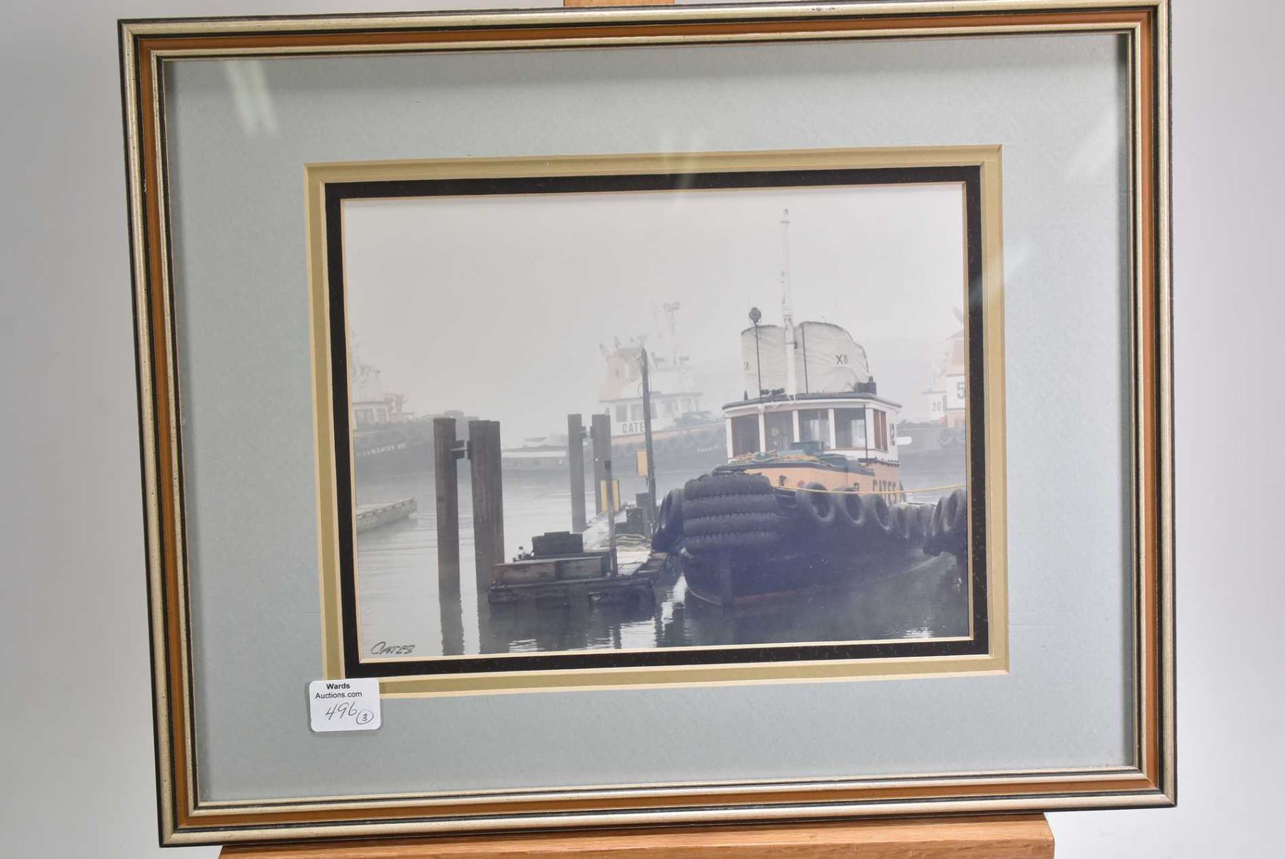 Three framed artworks including Cat photo, limited edition print and a tug boat titled Cates