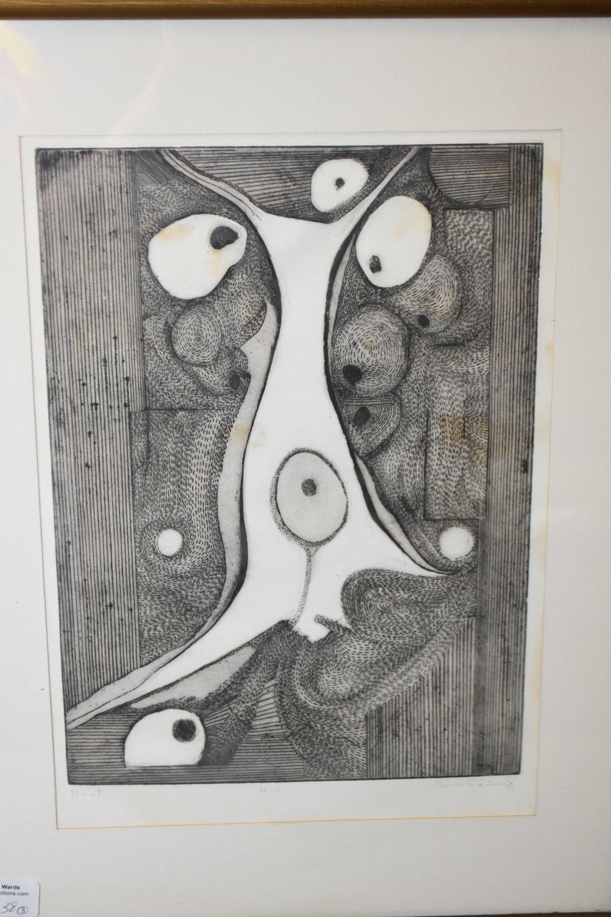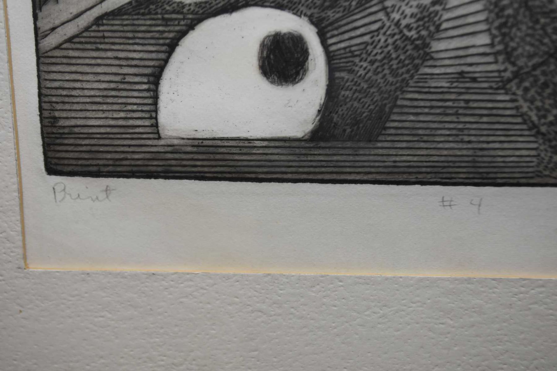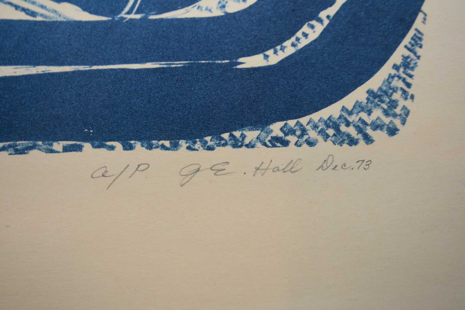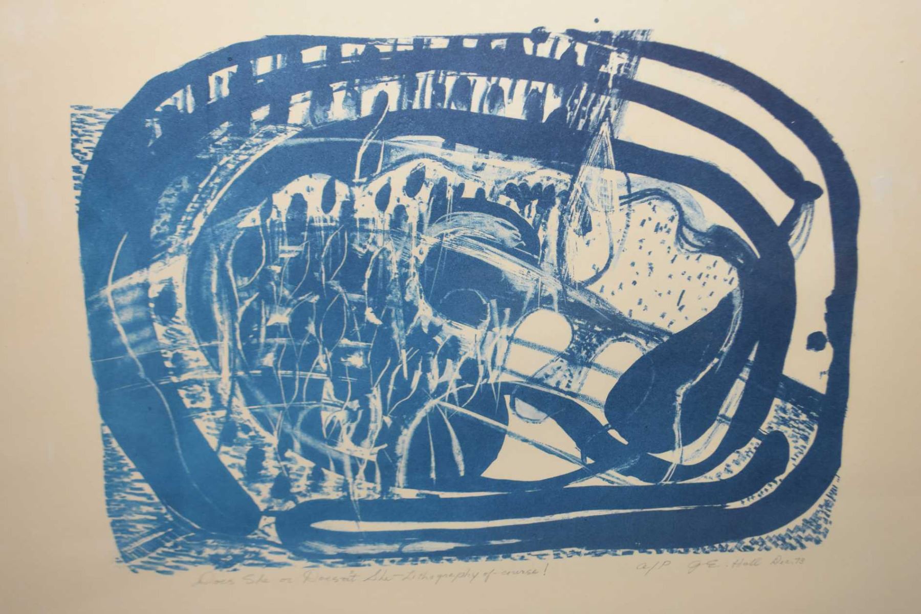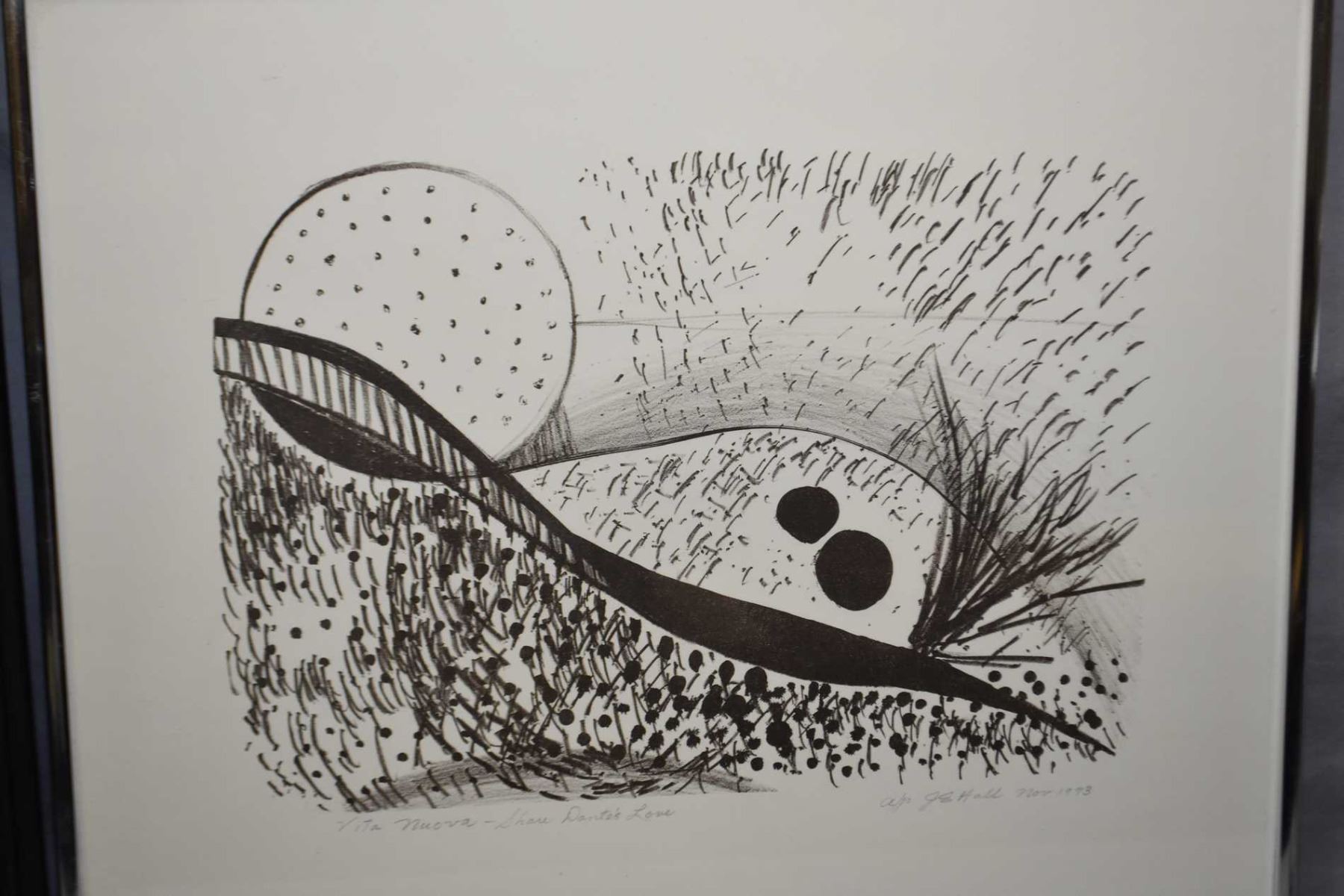 Three framed artworks including "Vita Nuova-Share Dante's Love" artist proof, G.E. Hall Nov' 73, "Does She or Doesn't She" artist proof lithograph, G.E. Hall '73 plus untitled abstract, artist proof No. 4, by Gene R. Eisert