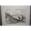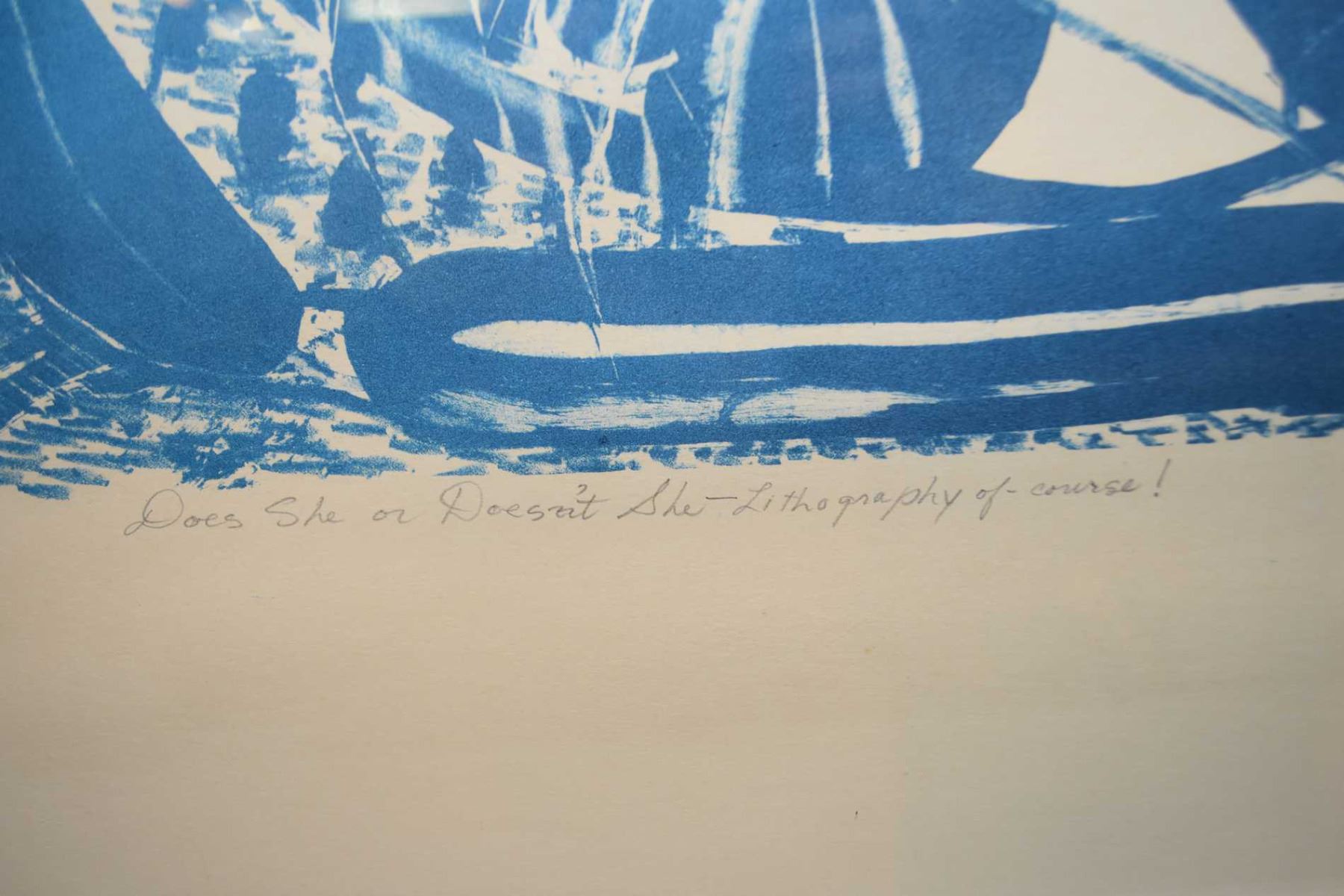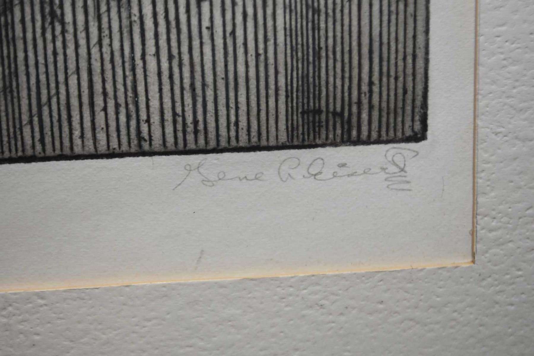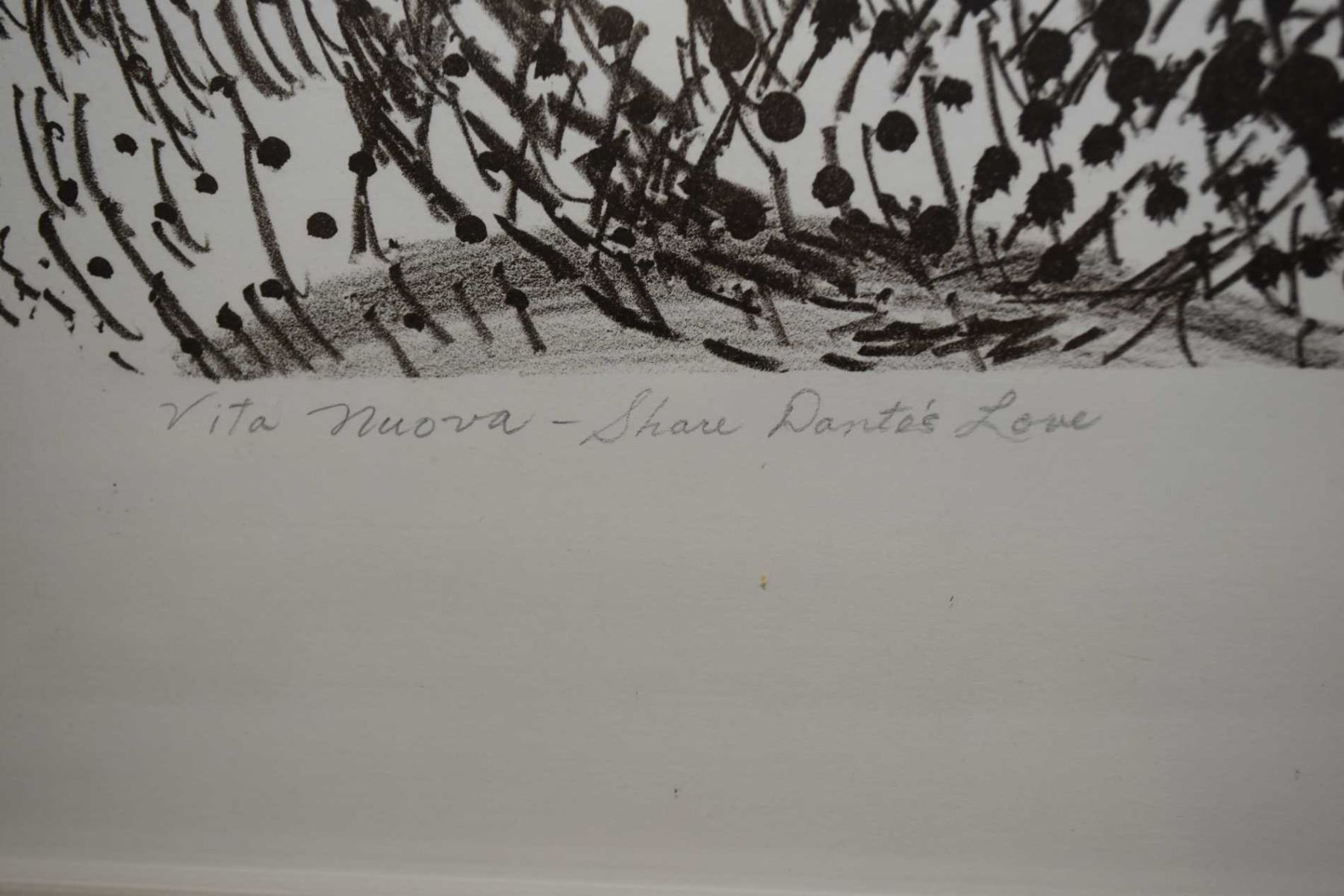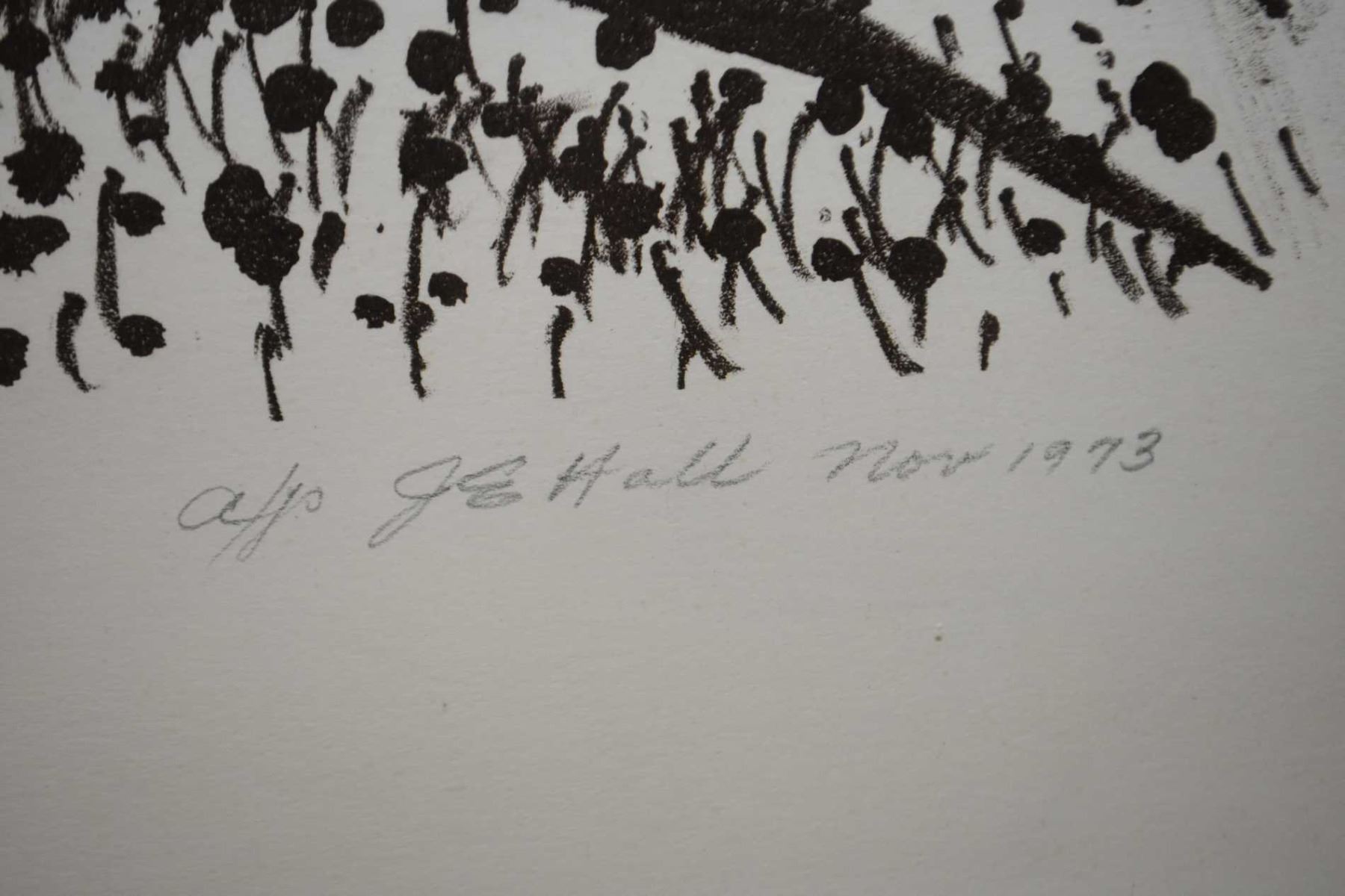 Three framed artworks including "Vita Nuova-Share Dante's Love" artist proof, G.E. Hall Nov' 73, "Does She or Doesn't She" artist proof lithograph, G.E. Hall '73 plus untitled abstract, artist proof No. 4, by Gene R. Eisert