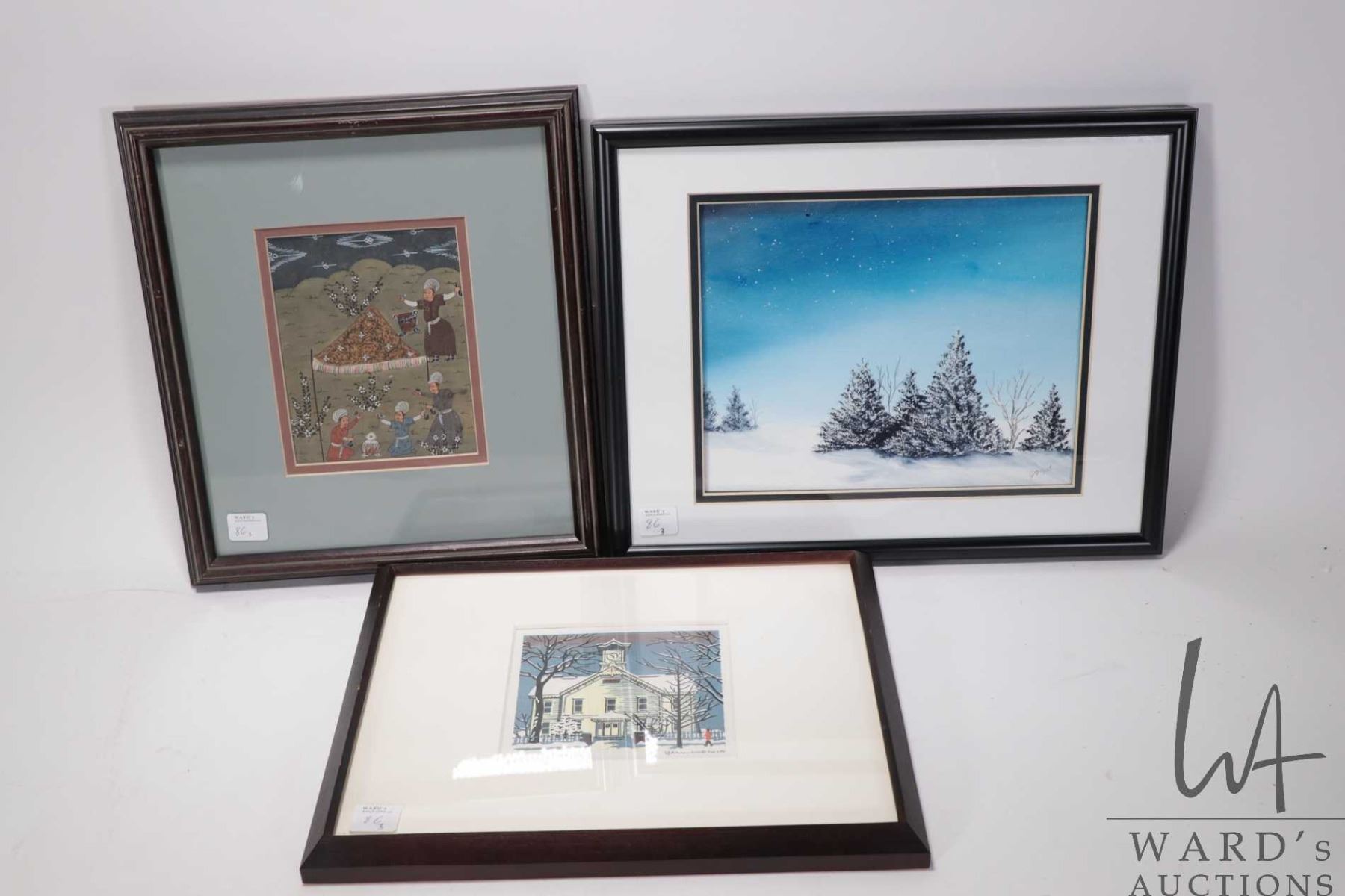 Three framed artworks including limited edition block cut print of a church in winter, original watercolour of a winter forest scene, 8" X 10" and a Turkish figural gouache painting, 6" X 5"