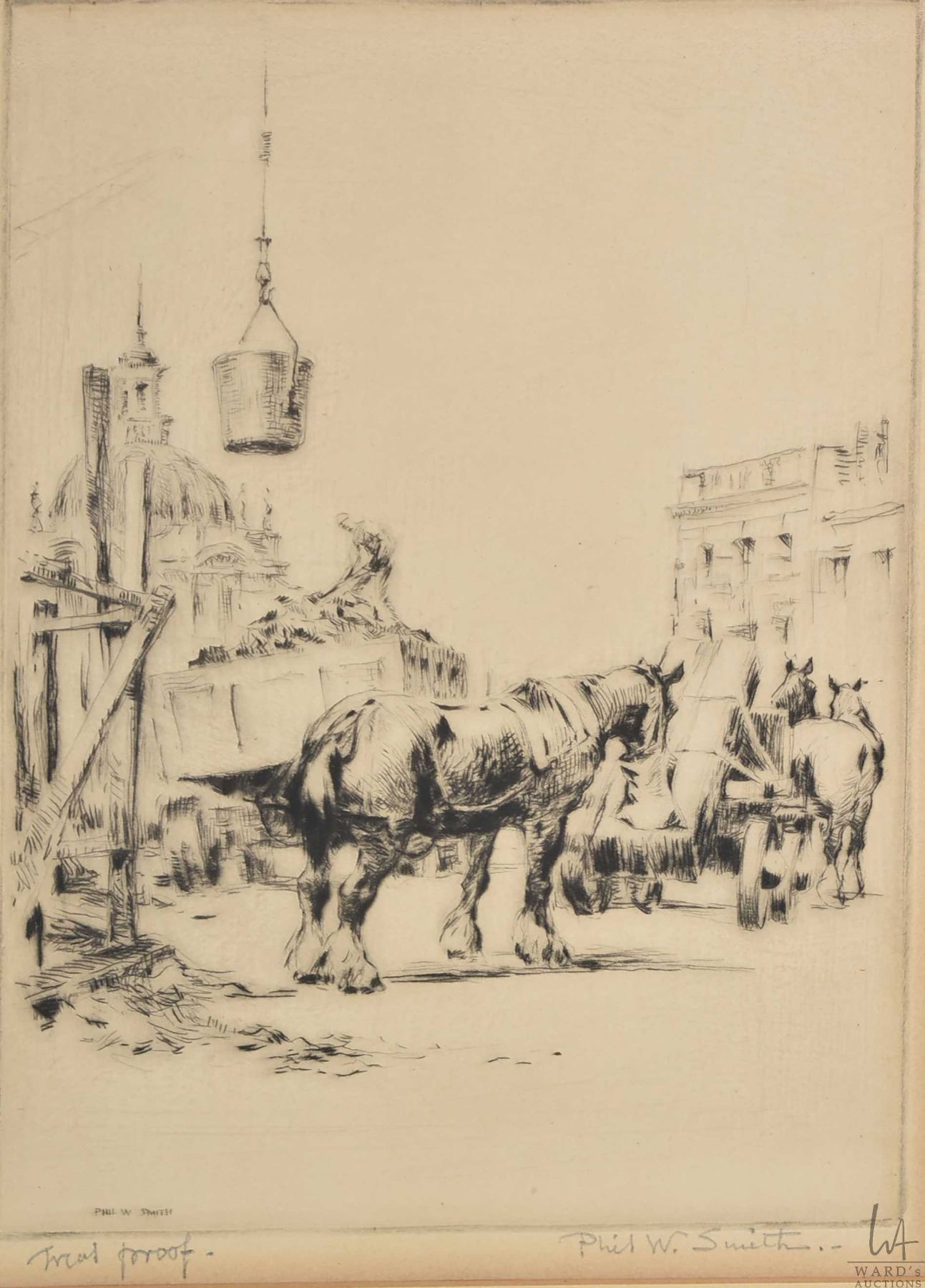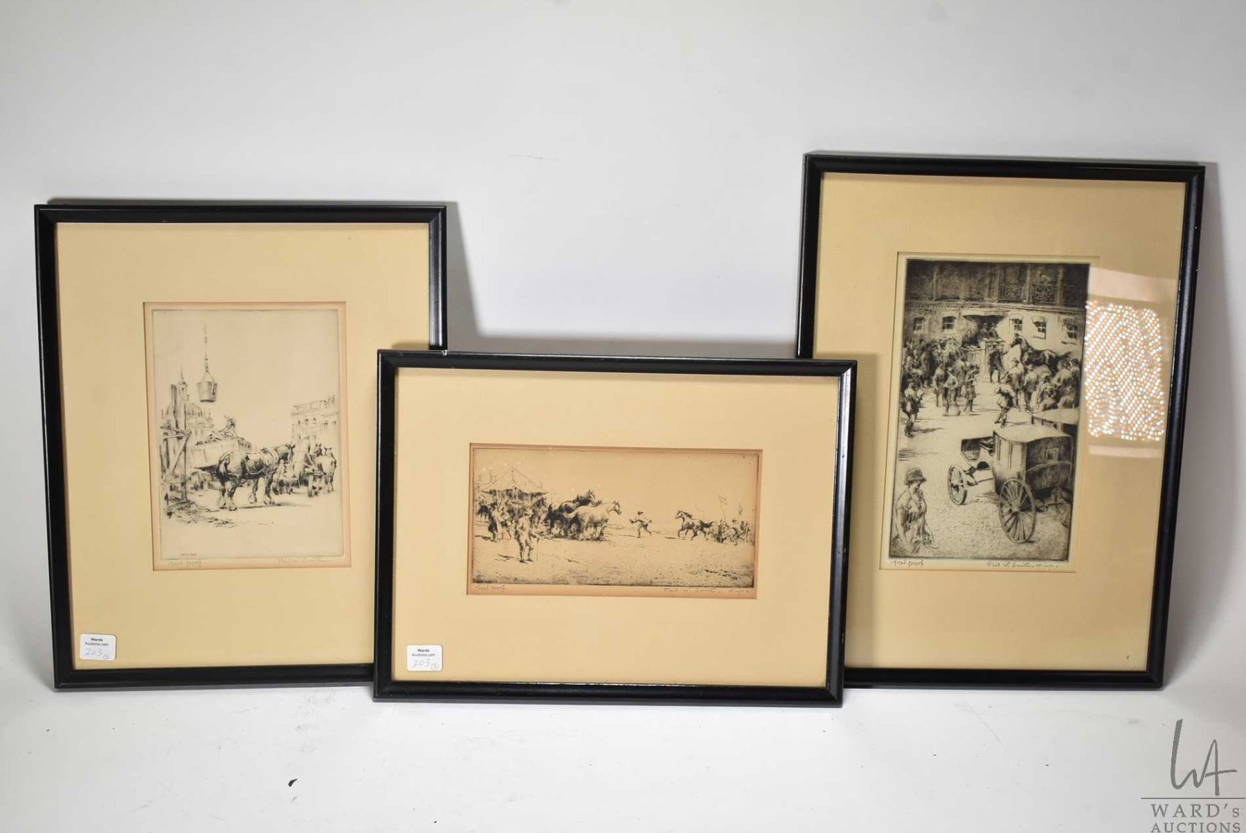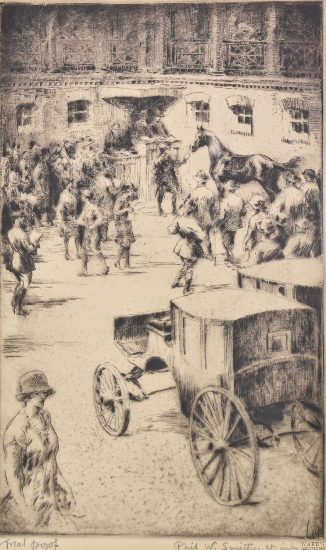 Three framed etched prints including a horse auction scene, a horse breaking scene and a cart horse in situ, all marked Trial proof and all pencil signed by artist Phil. W. Smith
