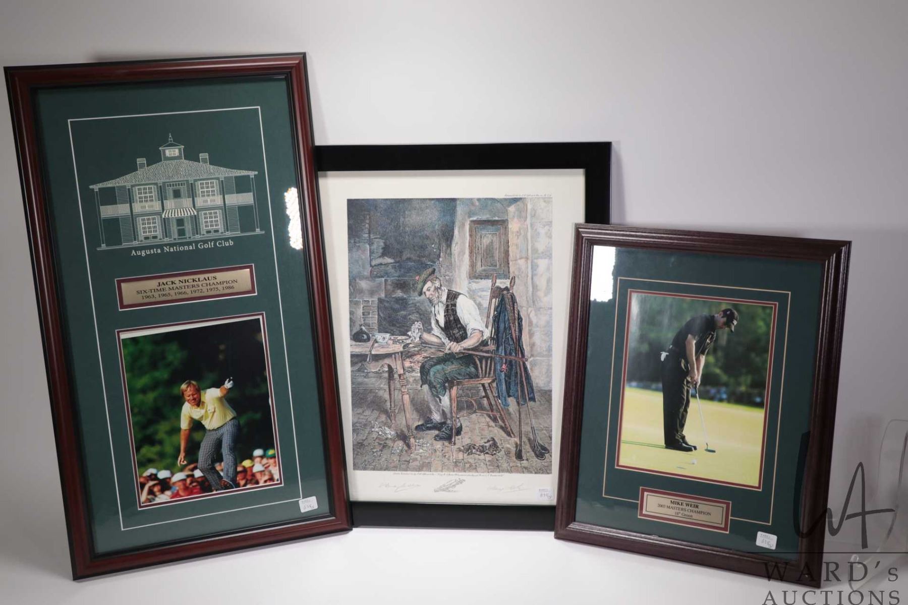 Three framed golfing prints including Jack Nicklaus, dimensions including frame 27" X 16" and Mike Weir 2003 Masters Champion and Scottish print