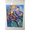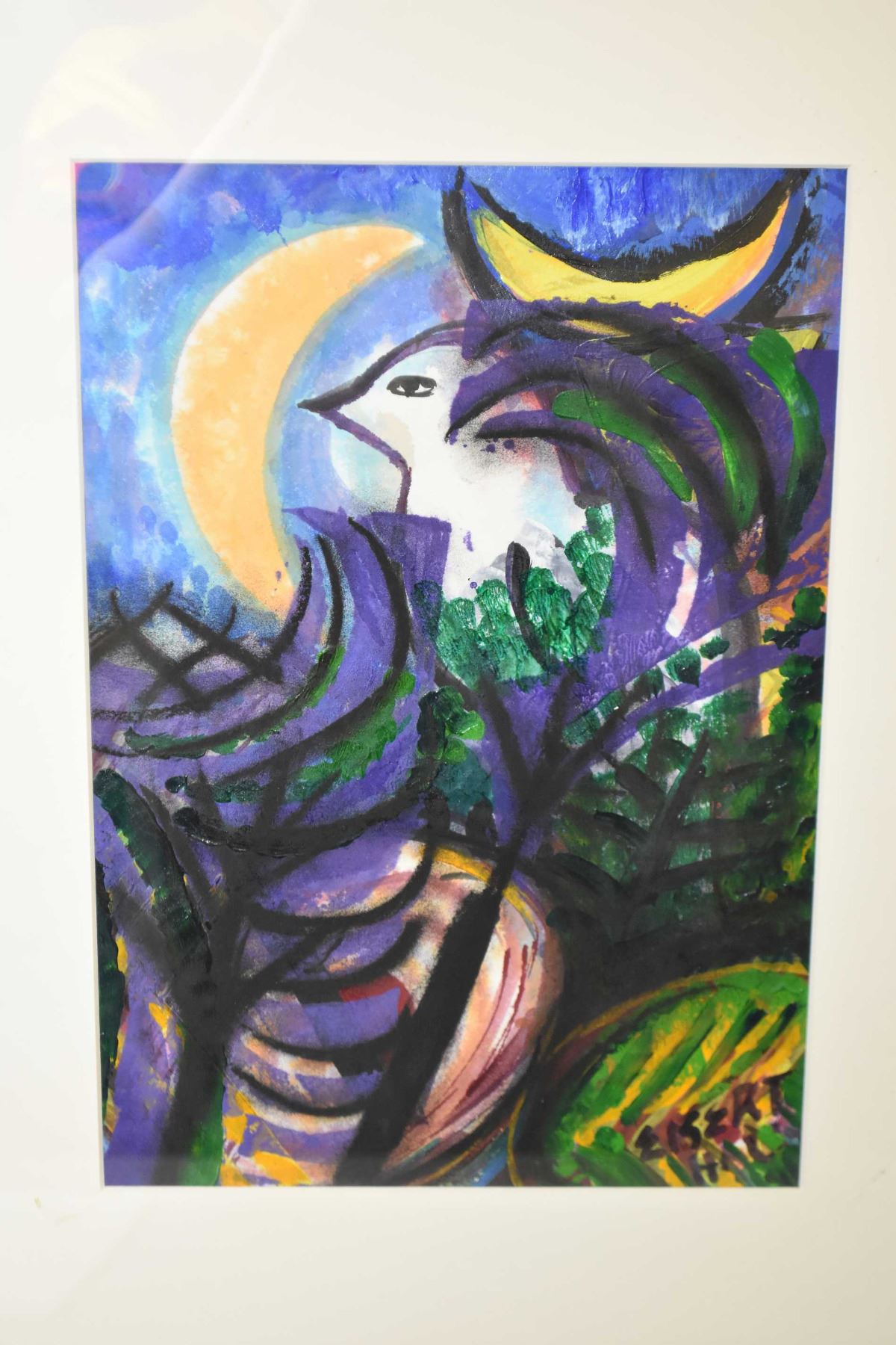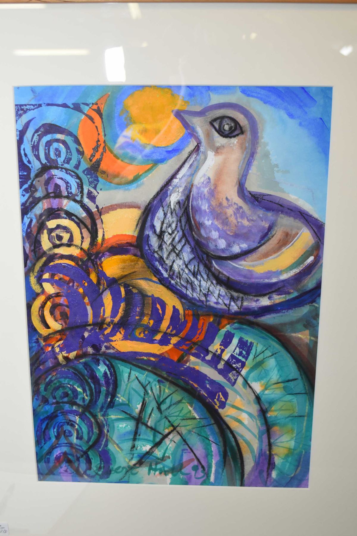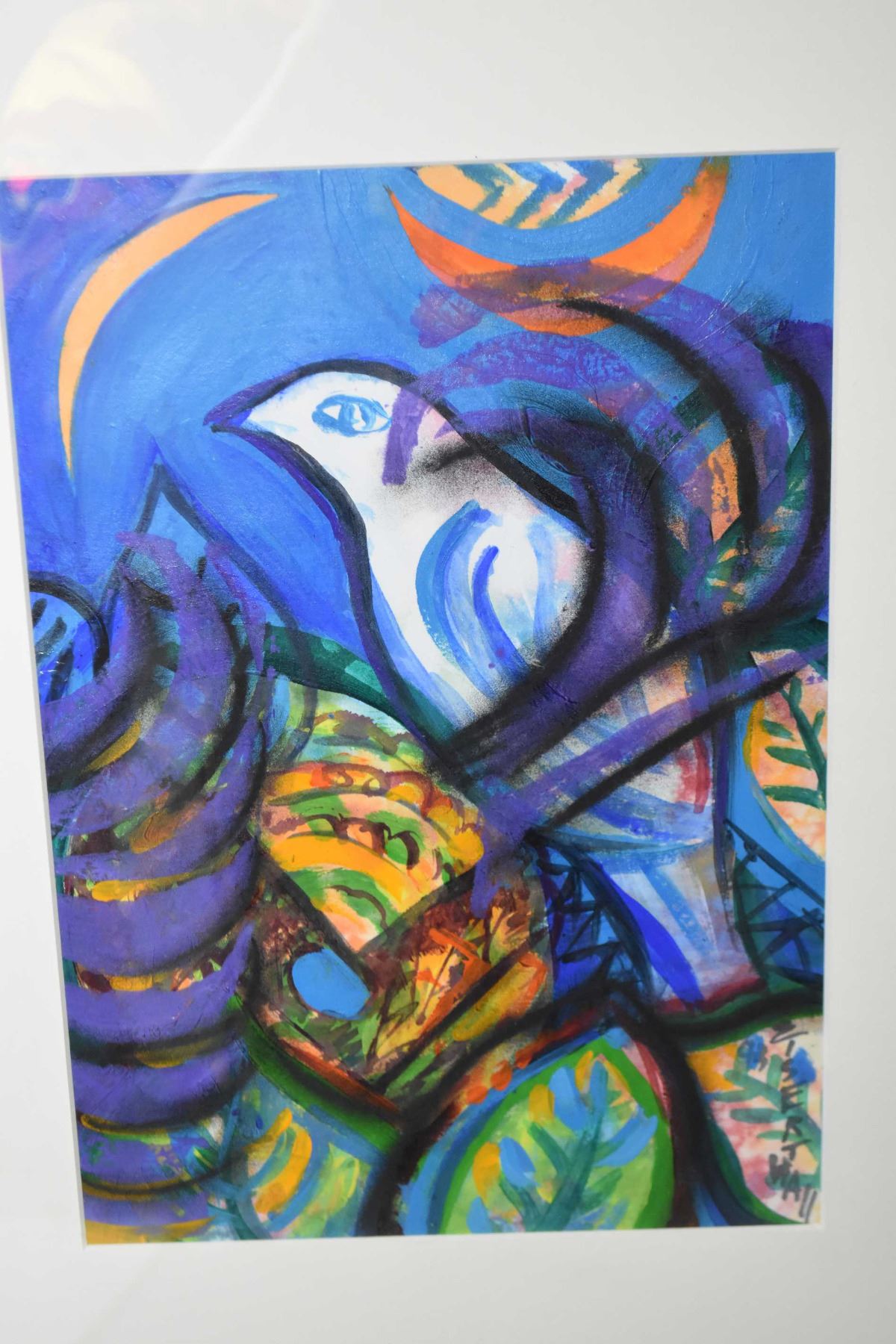 Three framed original mixed media artworks, all with abstract stylized birds, two 13" X 9' and one 20" X 14" all signed by artist Eisert Hall