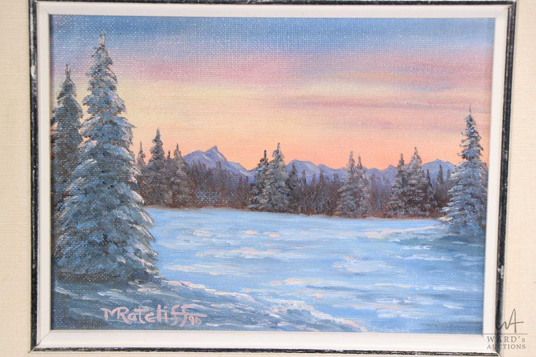 Three framed original paintings including acrylic on massonite of a wintry lake and mountain by artist Melva Ratcliff 6" X 8", a framed acrylic on board painting of a indigenous village by artist Ralph Butler 5" X 7" and a pastel on paper labelled on verso "Mount Rundle" and signed by artist 6" X 9"