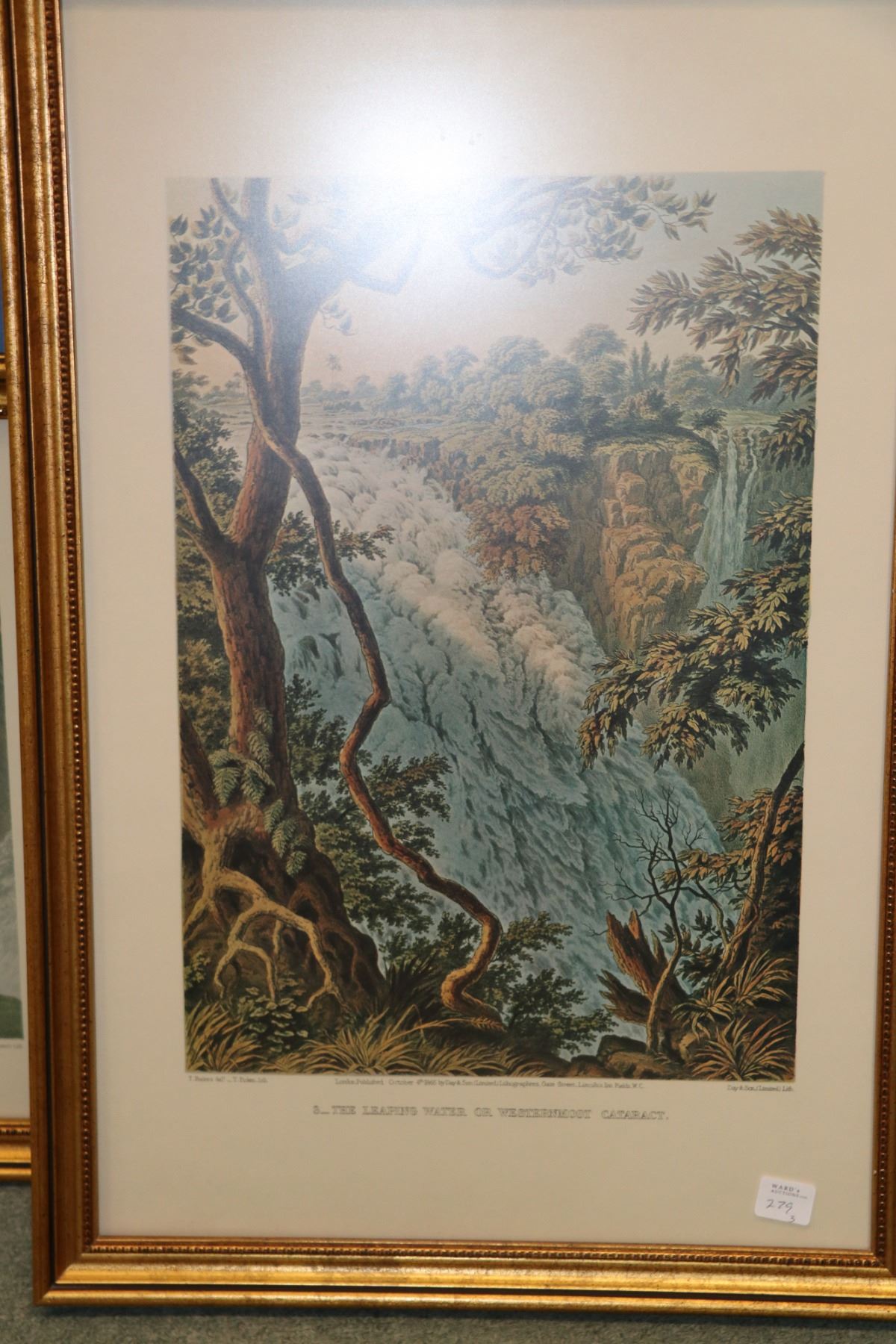 Three gilt framed prints of antique etchings including "The Falls From Narrow Neck Near the Eastern Headland of the Outlet", "The Falls by Sunrise, with the spray cloud raising 1200 feet" and "The Leaping Water or Westernmost Cataract", overall dimensions 16" X 24"