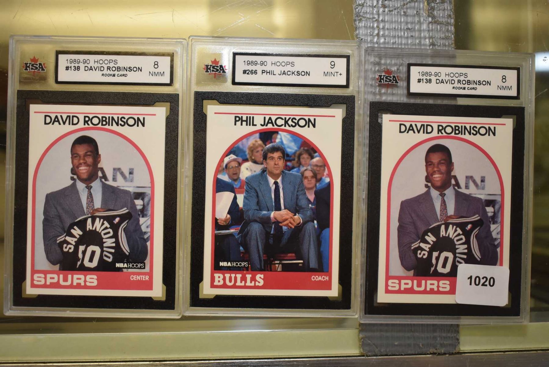 Three graded baseball cards including two No. 138 David Robinson rookie cards and a Phil Jackson