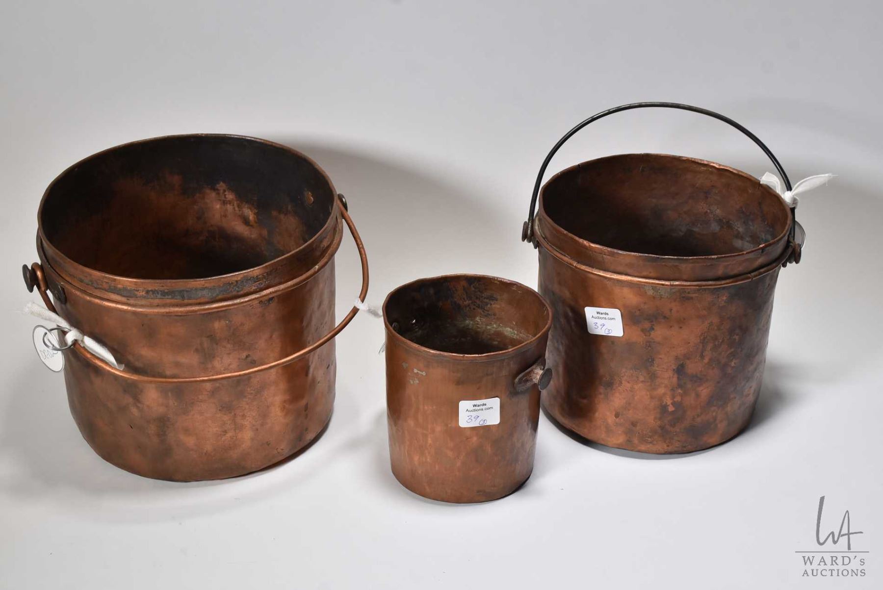 Three graduated antique hand hammered copper pots ranging from 4 1/2"-7"